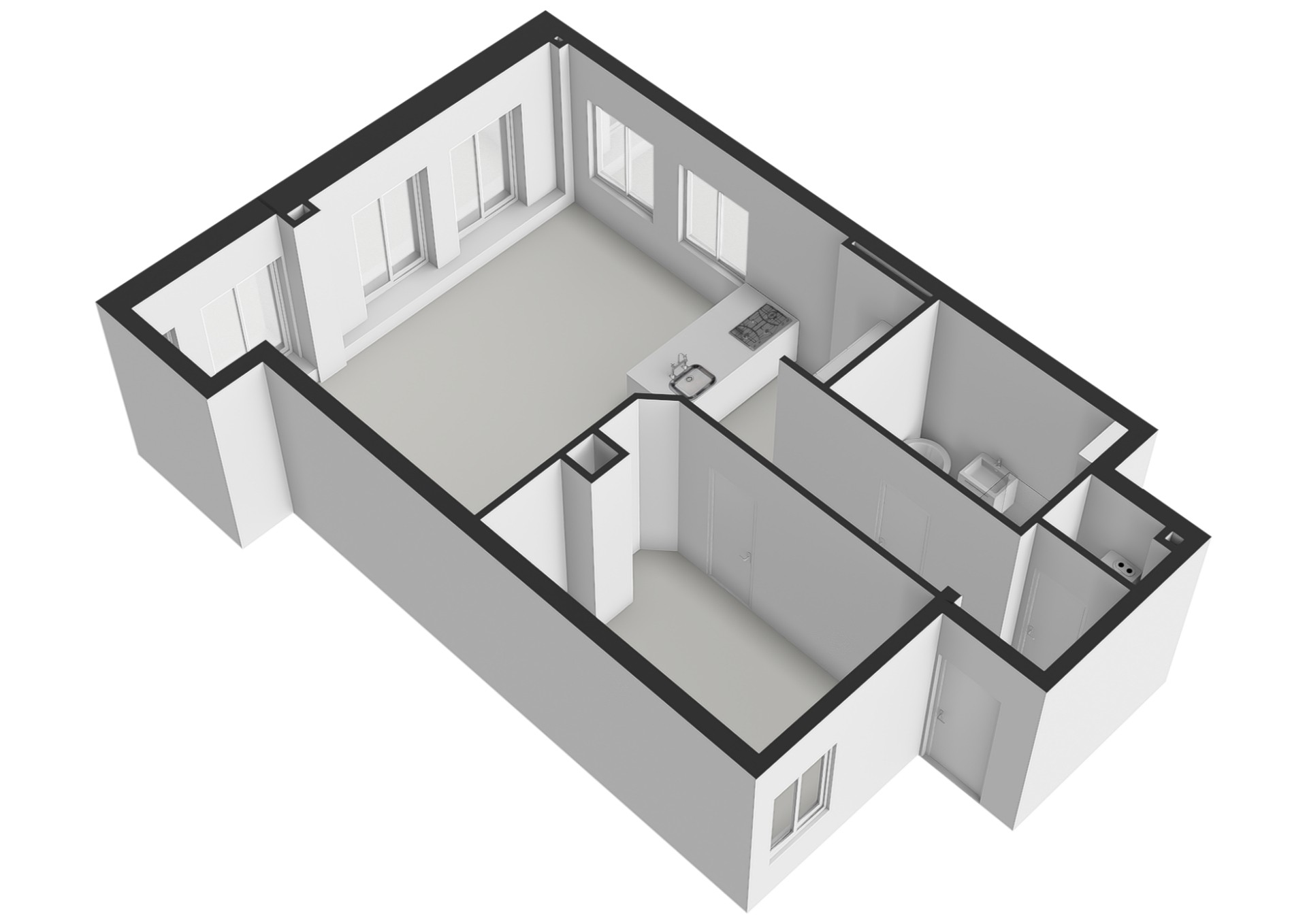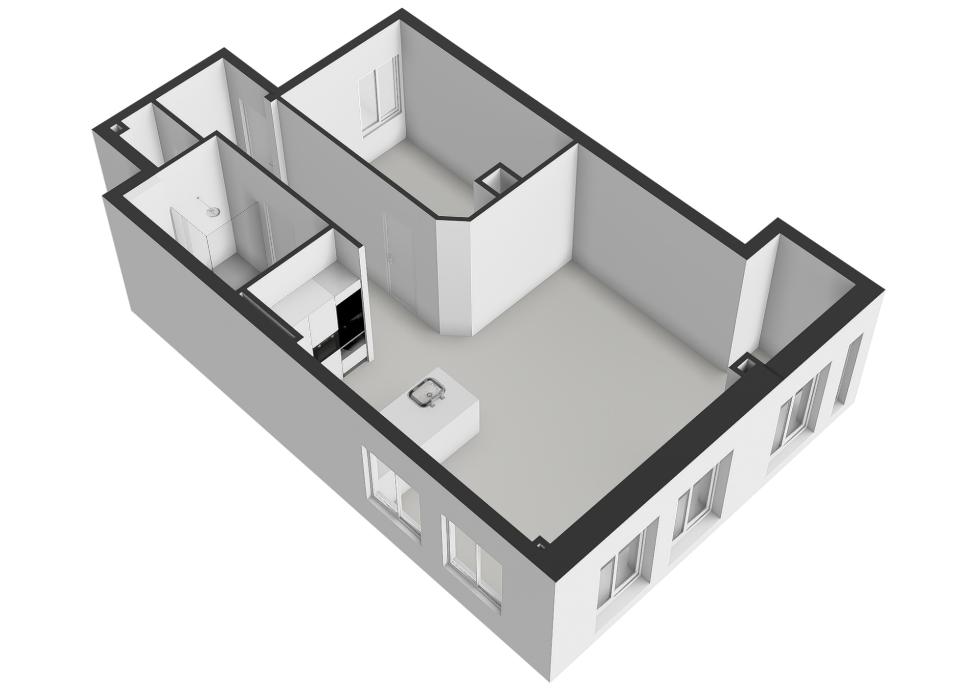 • One bedroom, one bathroom, and a modern open kitchen;