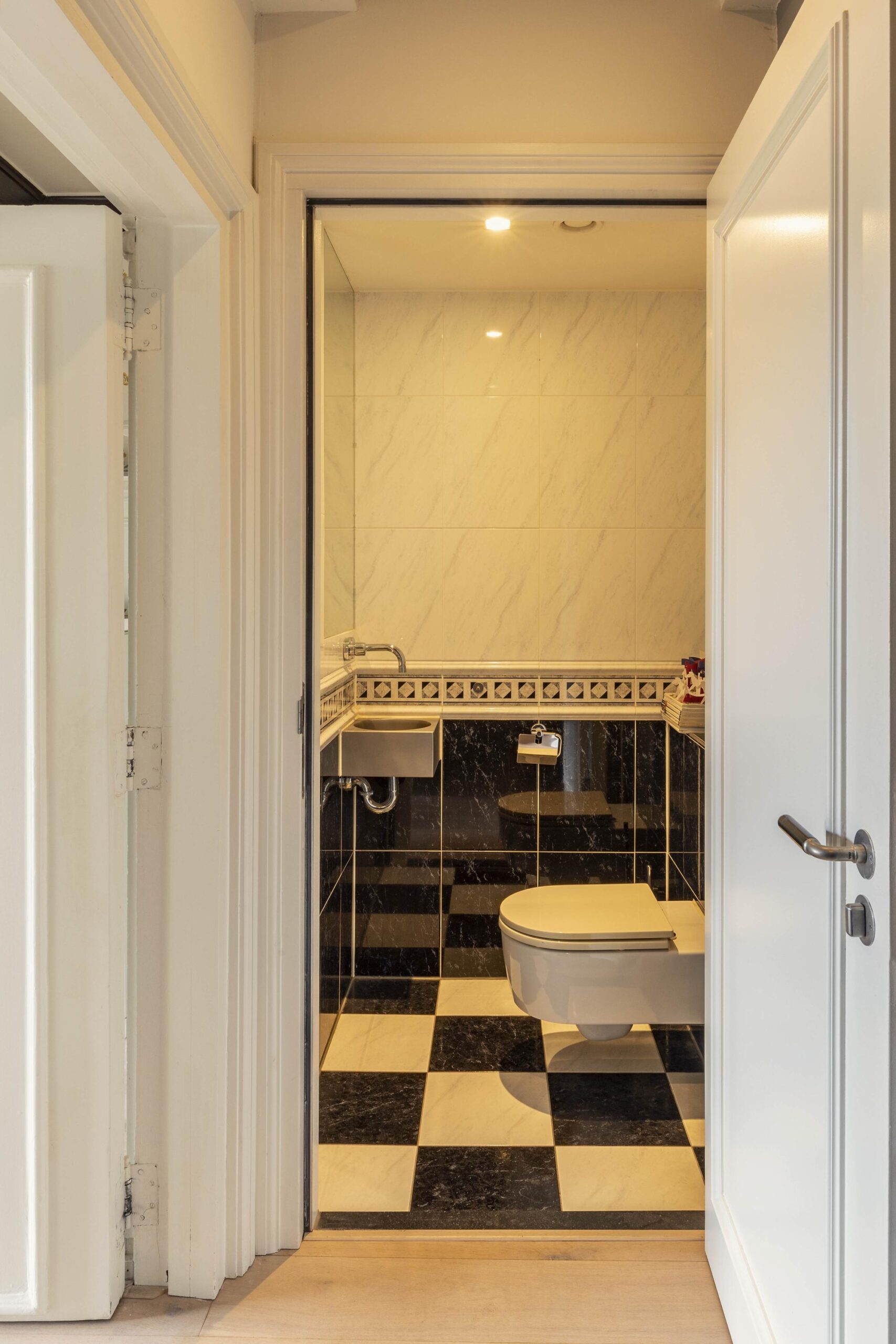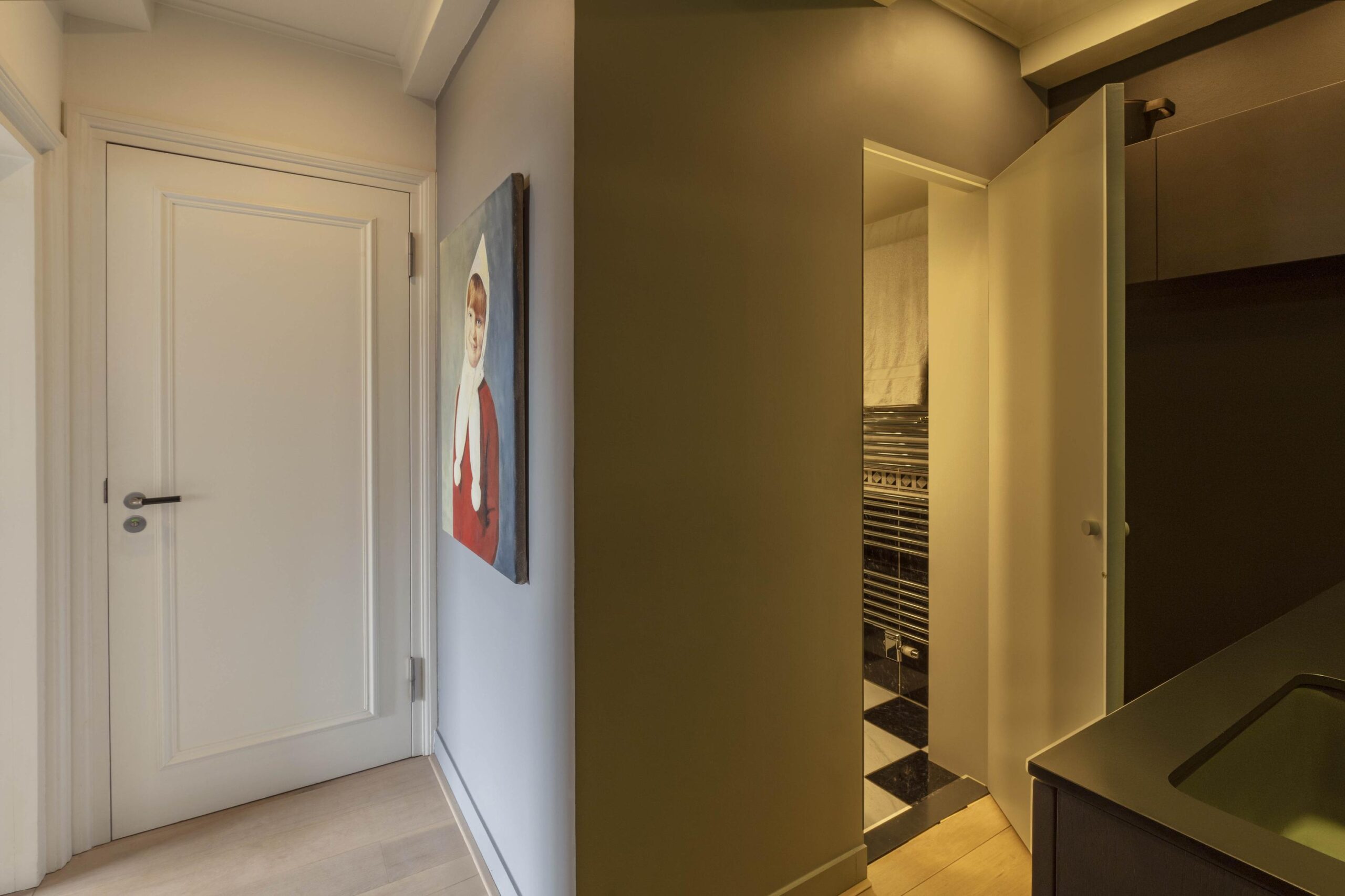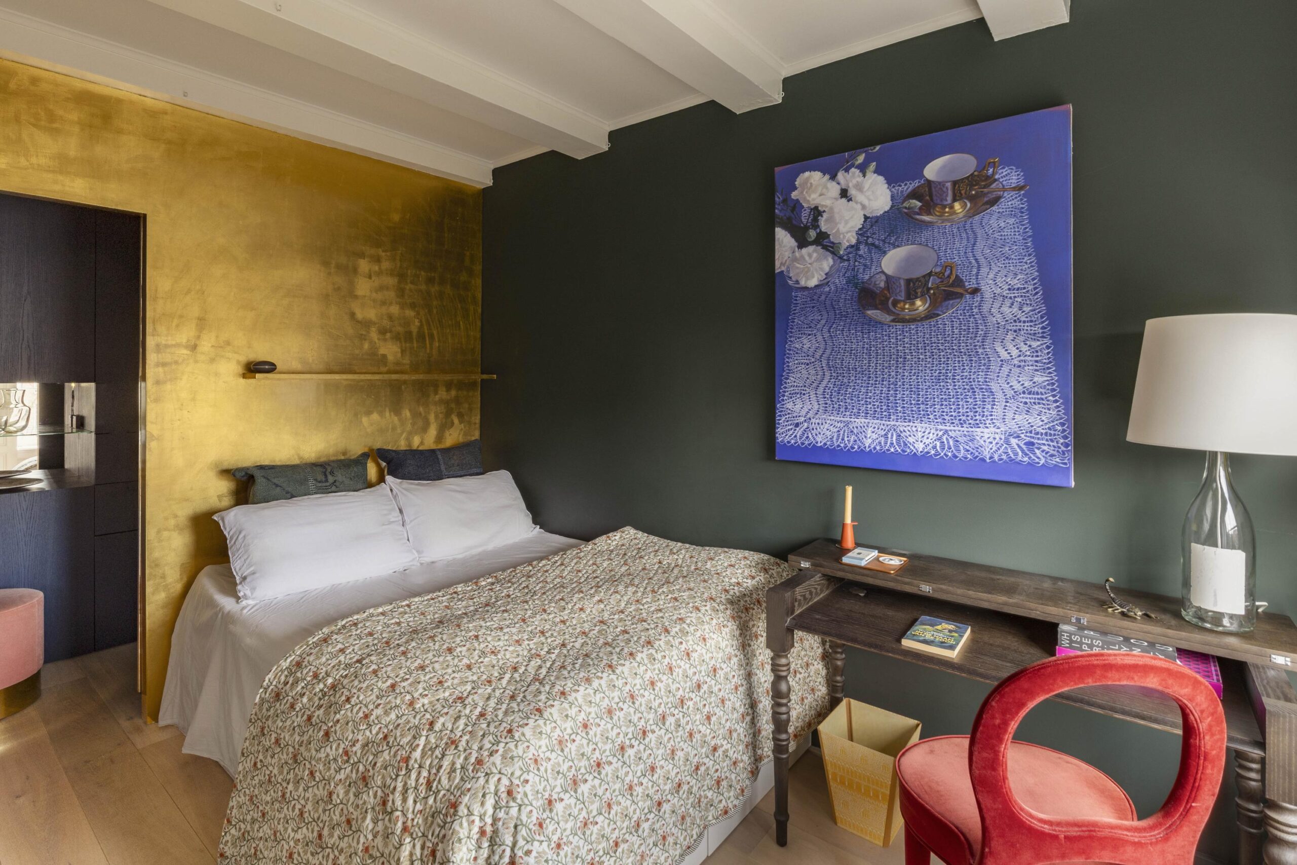 The bedroom is situated at the front and also overlooks the canal. Adjacent is a custom-made dressing area with built-in wardrobes, subtly enclosed by means of a sliding door.