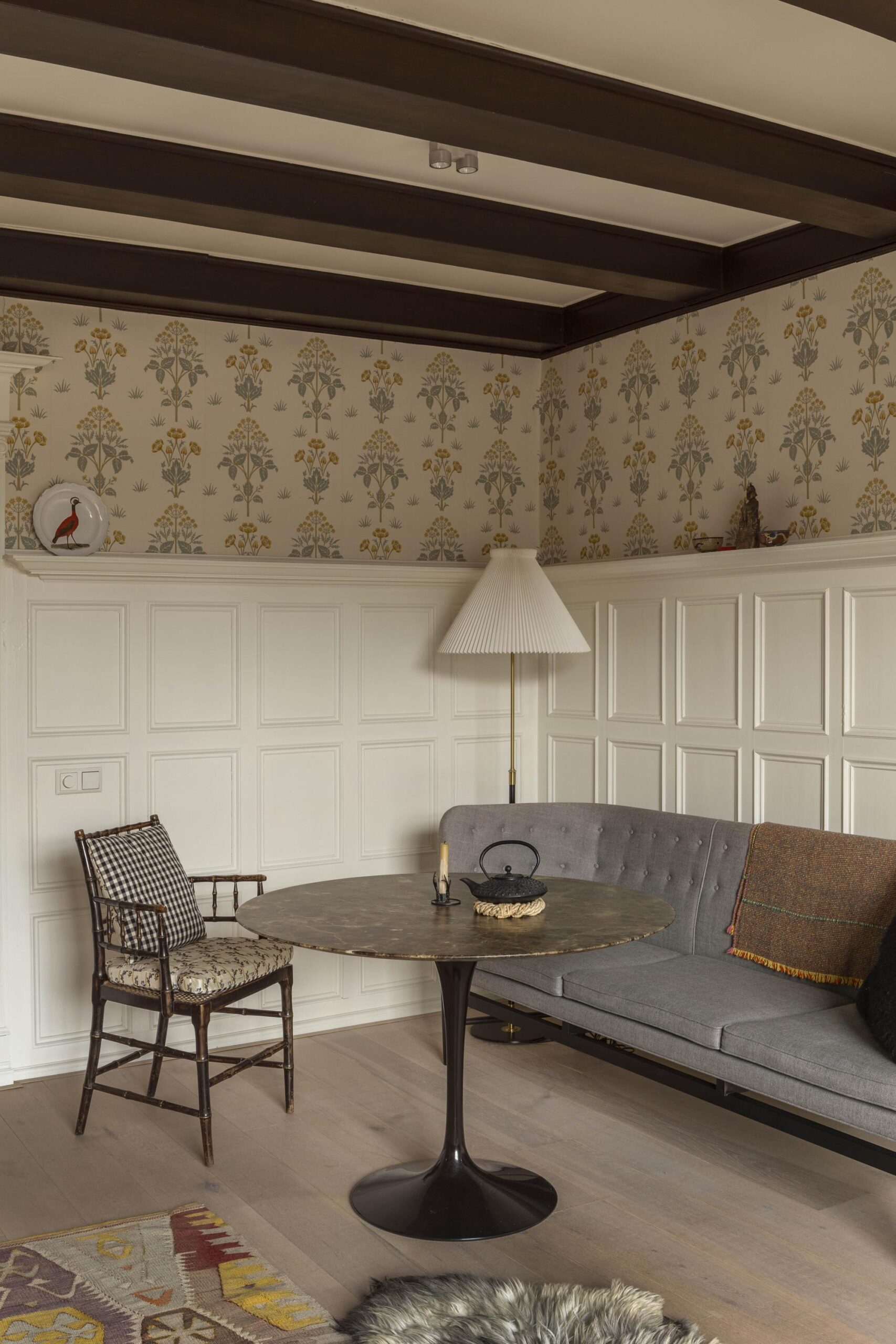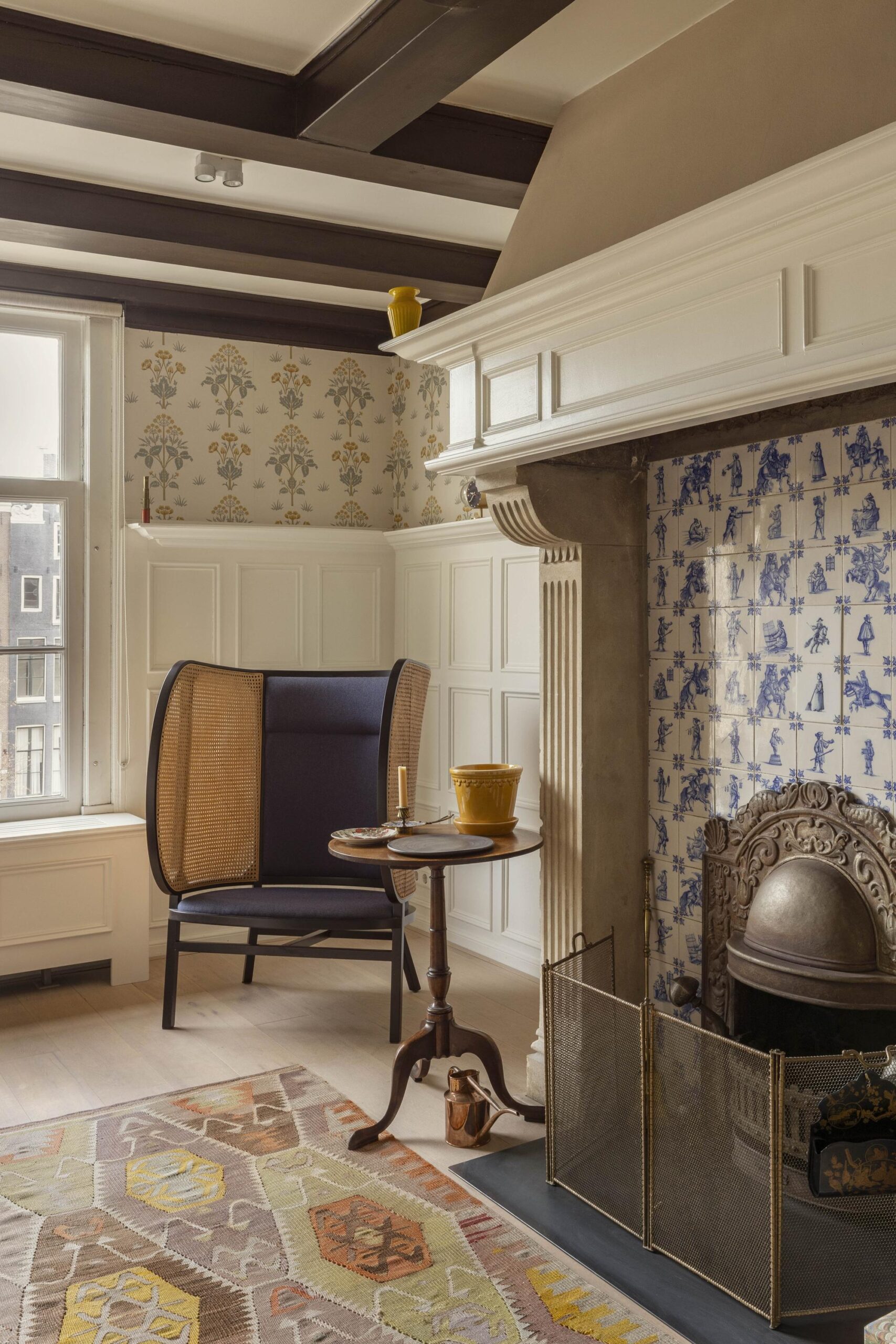 The living room is positioned at the front and features a large window with unobstructed views over the Keizersgracht. The exposed beam construction, the fireplace with historic tiles and the wooden flooring give the space a distinctive character. The layout comfortably accommodates both a sitting and dining area.