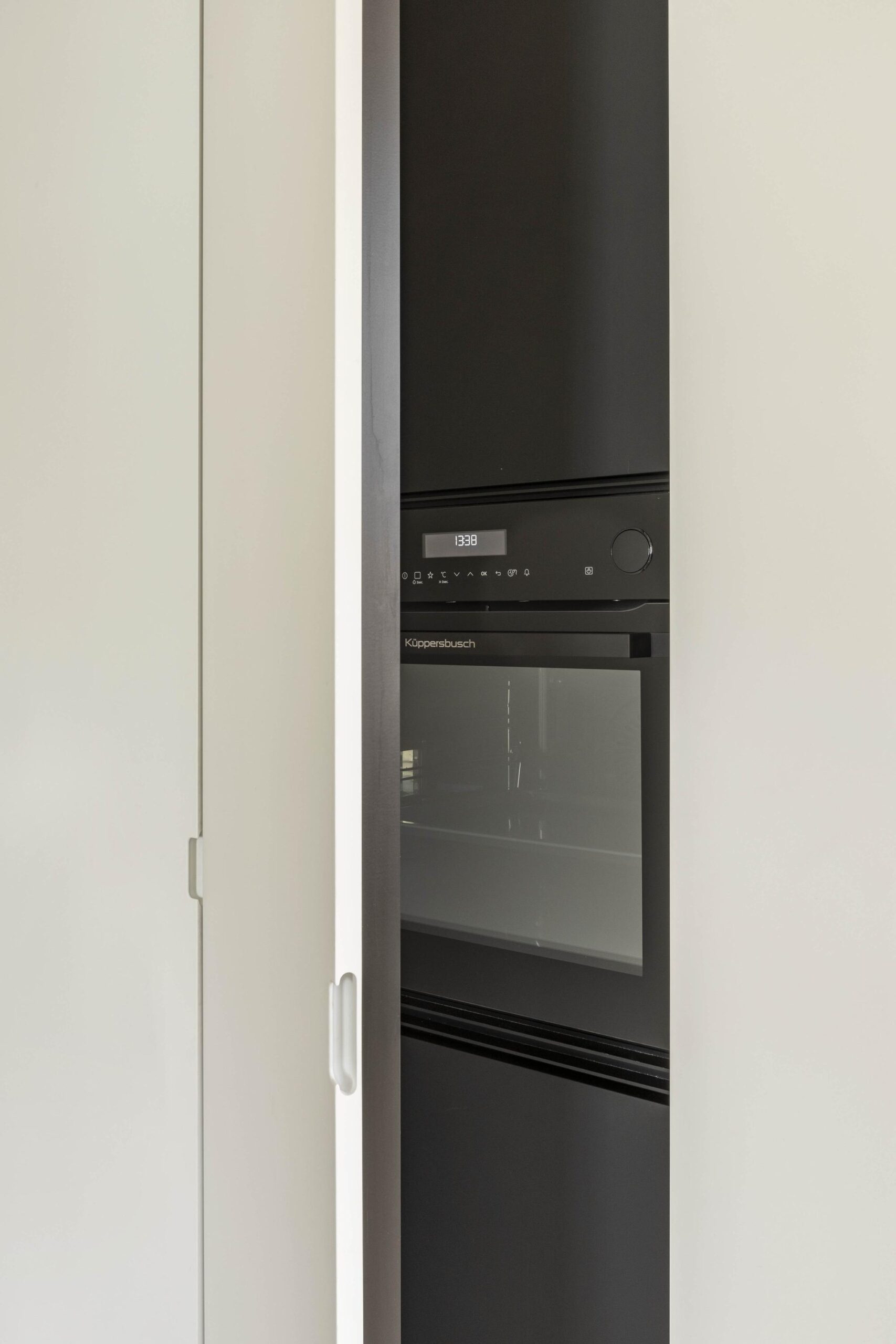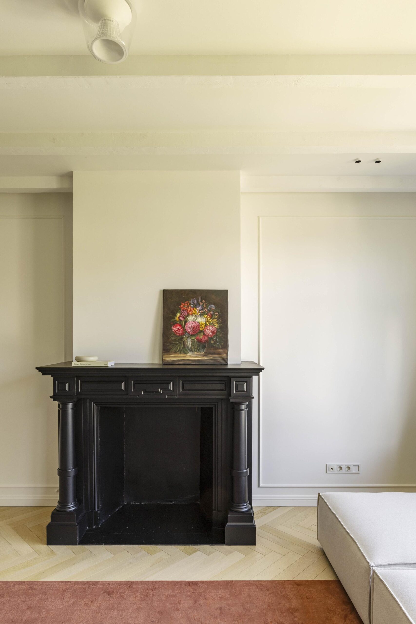The apartment is located on the third floor and accessible by lift or via the communal staircase. Upon entering, the hallway opens into a spacious and light-filled living area with a fireplace and with an open kitchen (Miele frigde/freezer from 2025, all other appliences are Kupperbusch). The kitchen and hallway have an abundance of storage in build-in closets. Large windows and soaring ceilings enhance the sense of space, while offering serene garden views.