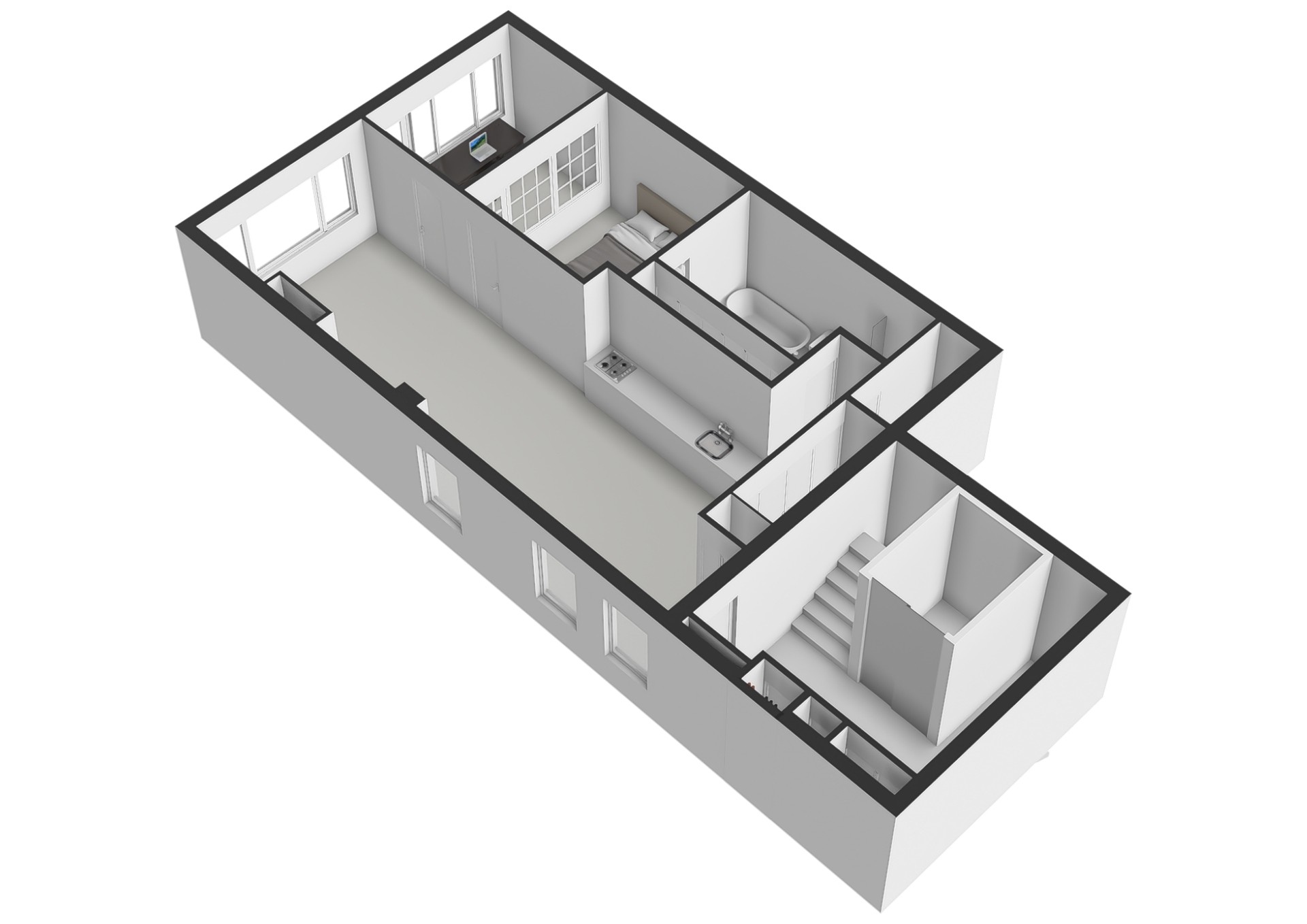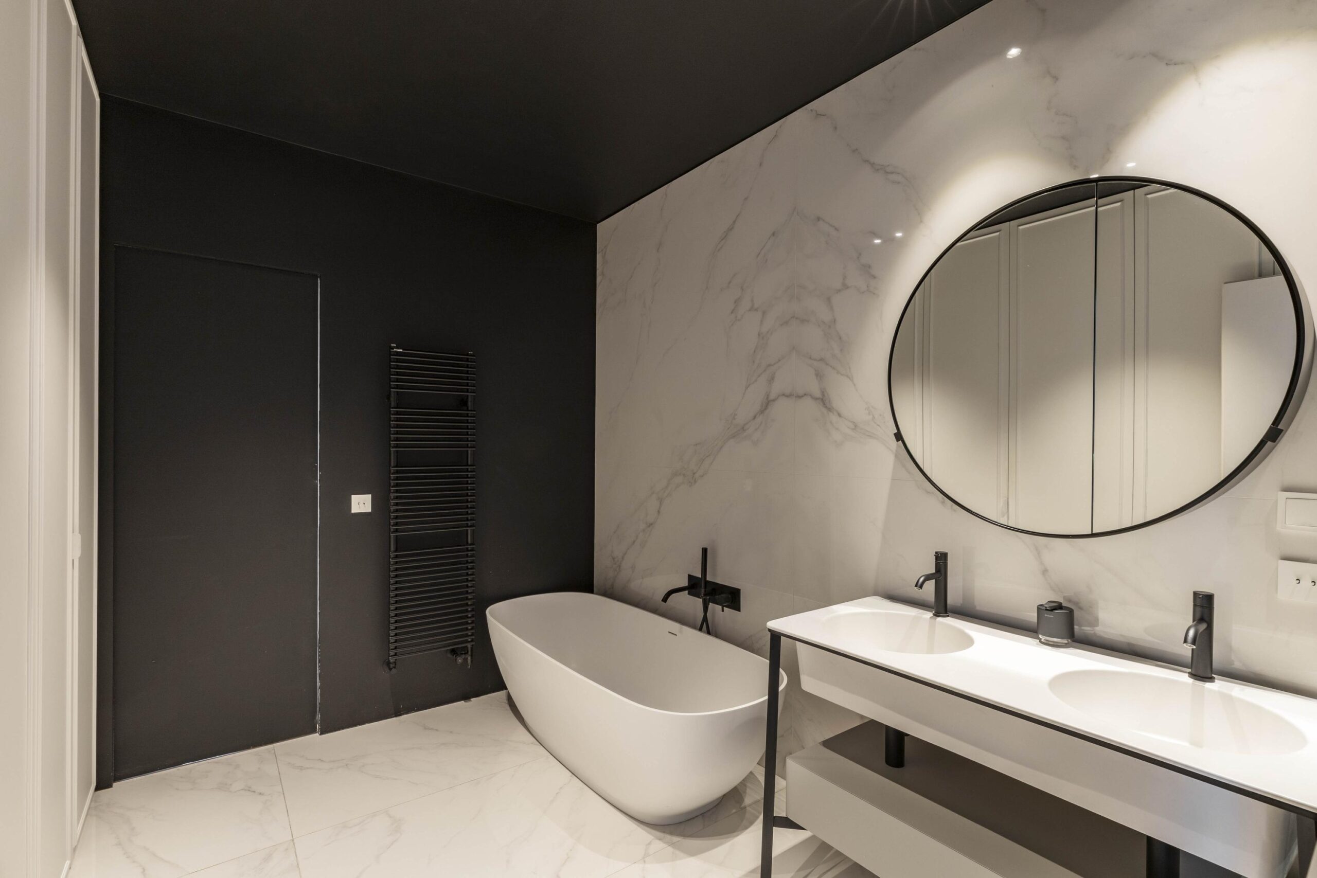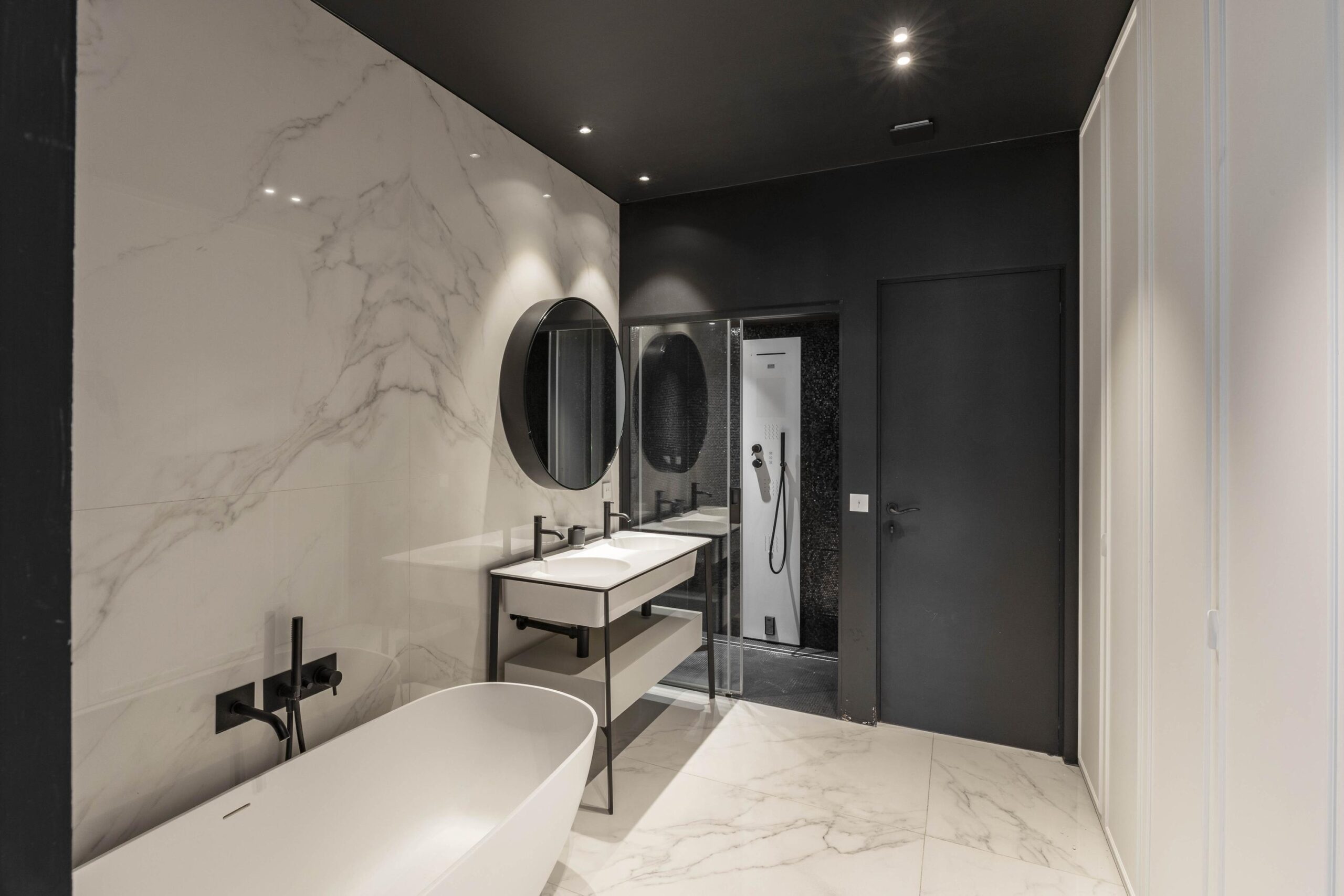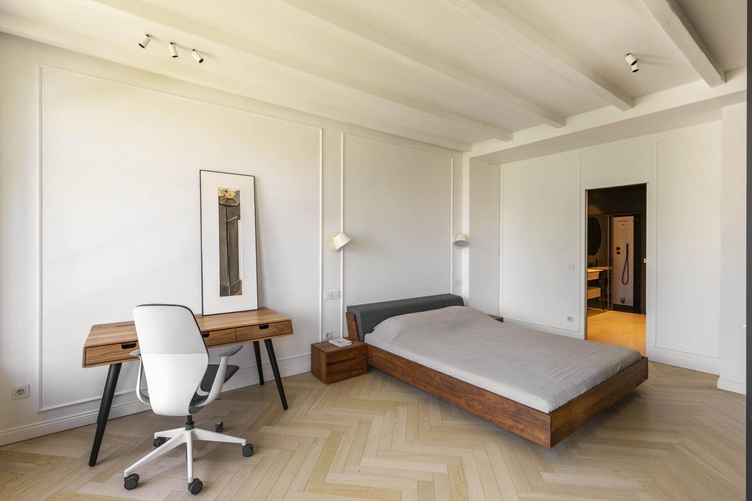 • Loft-style layout with large windows and high ceilings (with electric curtains from Somfy);
