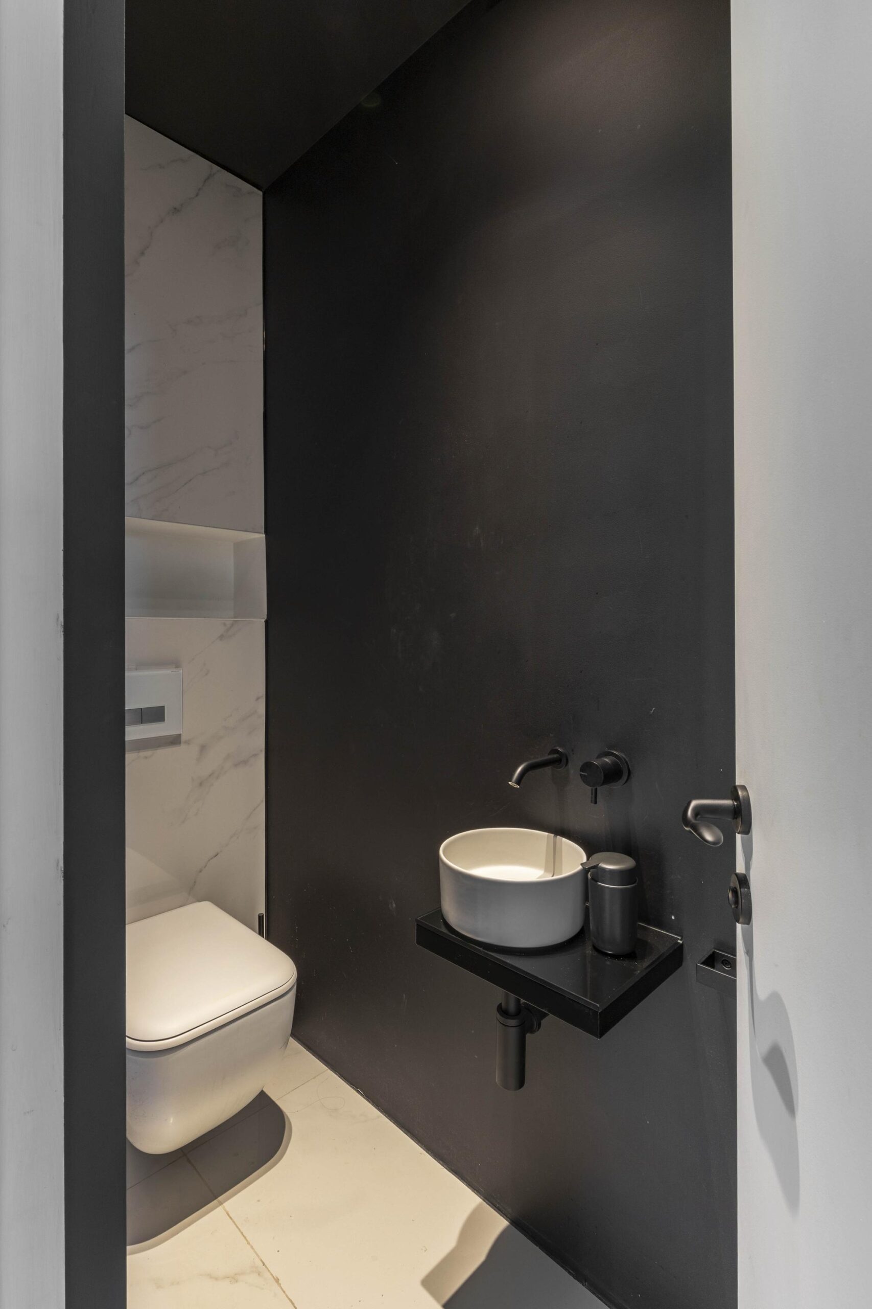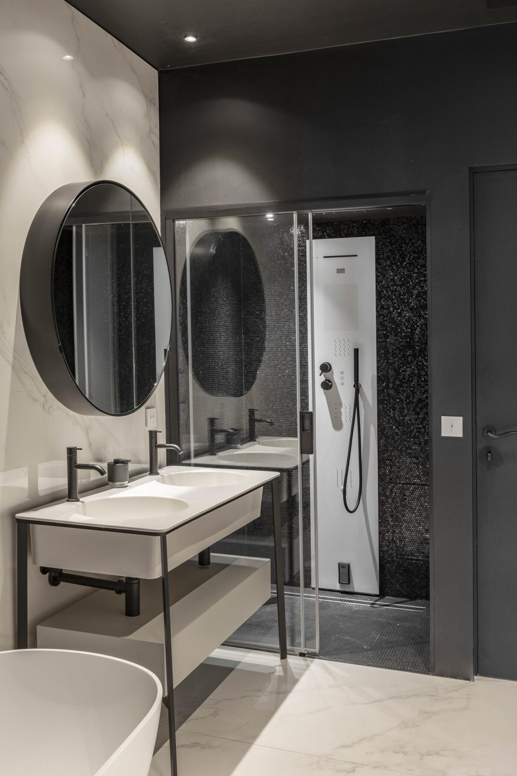 The bedroom is separated from the living area by a custom build sliding wall and includes an en-suite bathroom with steam shower, bathtub and washbasin. There is a separate toilet.