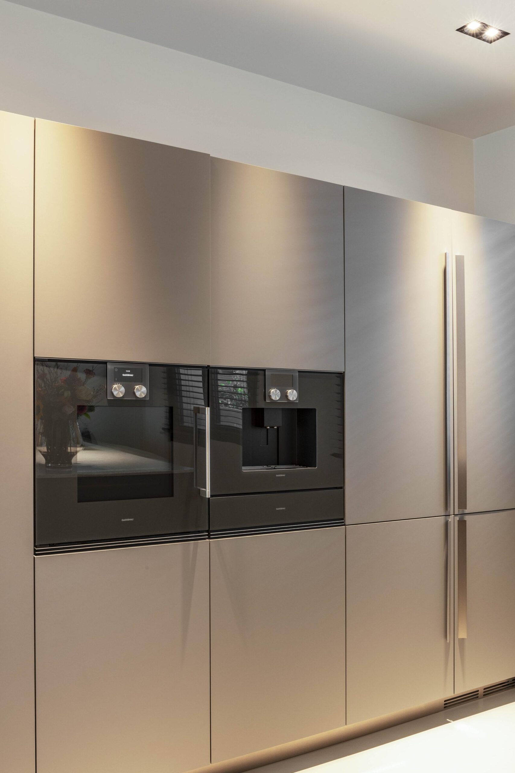 The generous living area, with ceiling heights of approximately 3 metres, spans the full depth of the apartment. At the front, the open-plan kitchen features a sleek and timeless design by the Italian brand Boffi, complete with a kitchen island and high-end built-in appliances. The living space flows seamlessly into the sitting area and adjoining terrace.