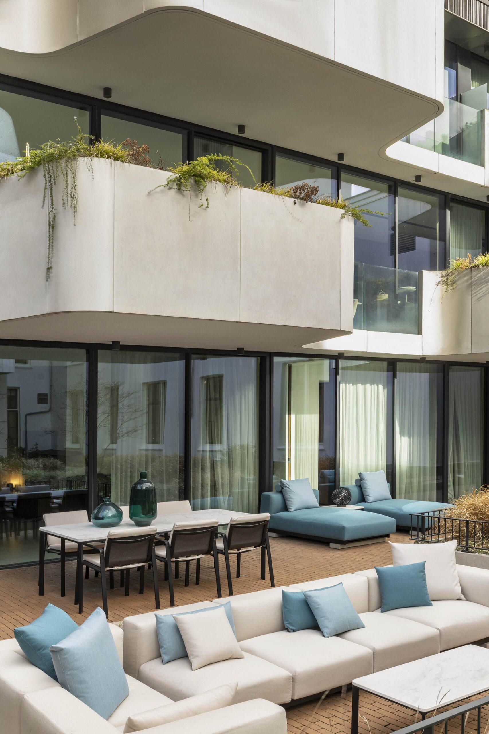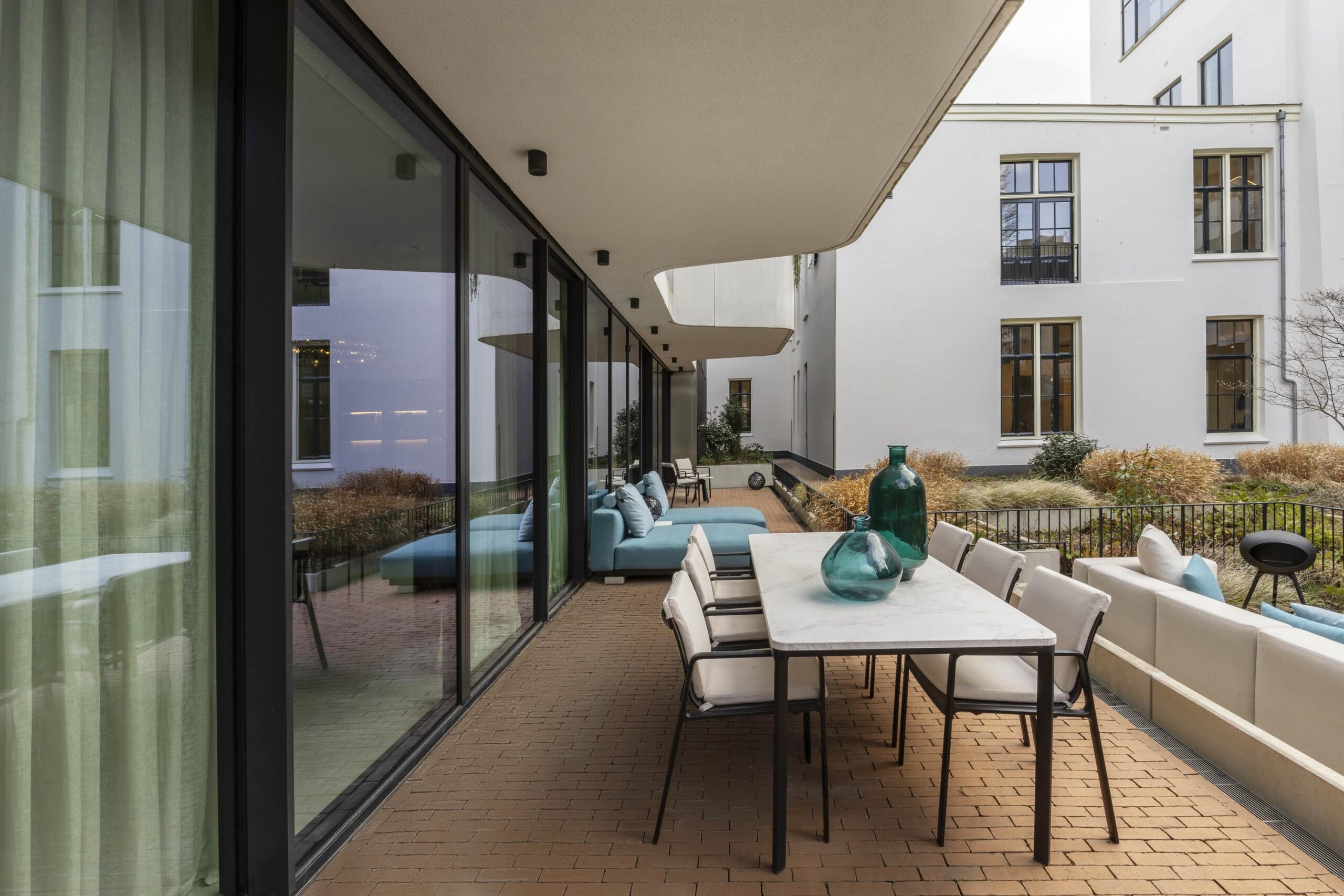 Large glass doors enhance the indoor-outdoor connection and open onto the expansive south-west facing terrace. This outdoor space feels like a natural extension of the interior and overlooks the beautifully landscaped communal garden designed by Piet Oudolf, an oasis of calm in the city centre.