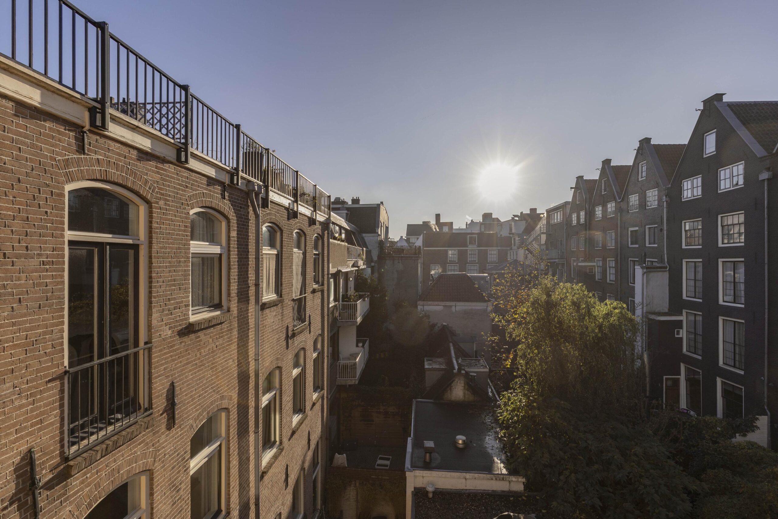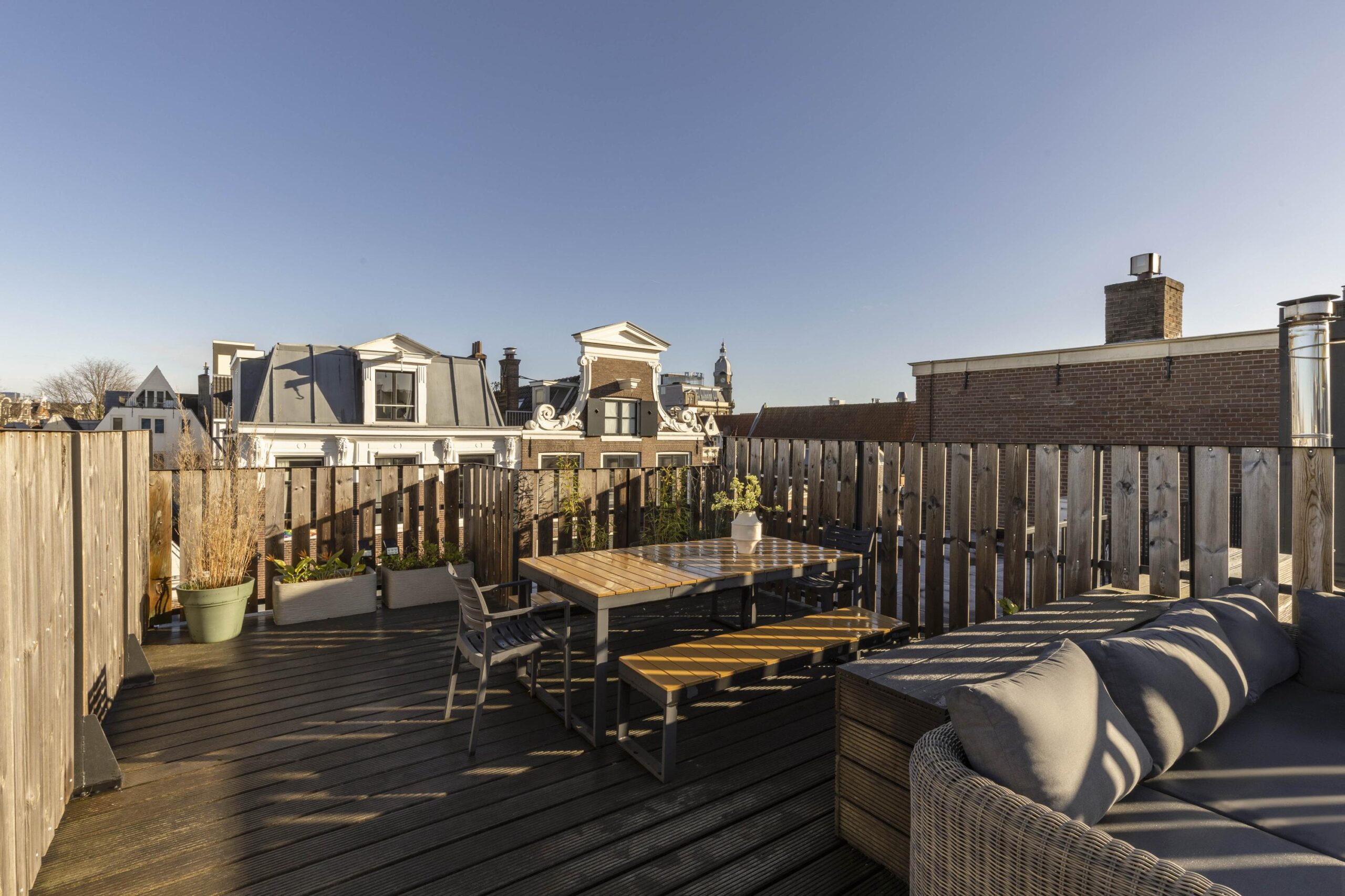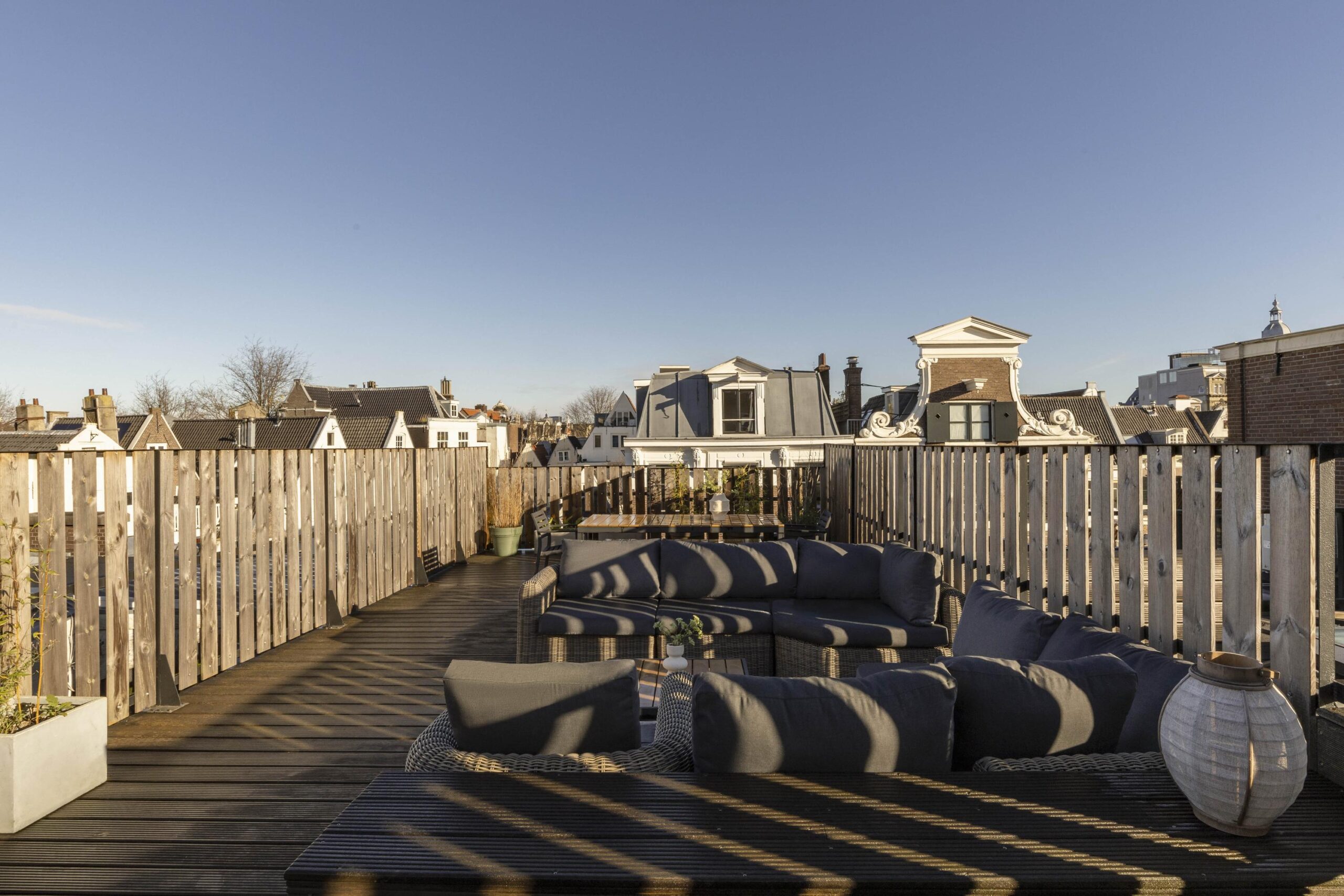 Located on the third and fourth floors of a classic early 20th-century building, this well-laid-out upper-level apartment spans approximately 116 m² and includes a generous rooftop terrace of around 58 m². The front living space is exceptionally wide, with a full-width glass façade offering iconic views over Amsterdam’s rooftops.