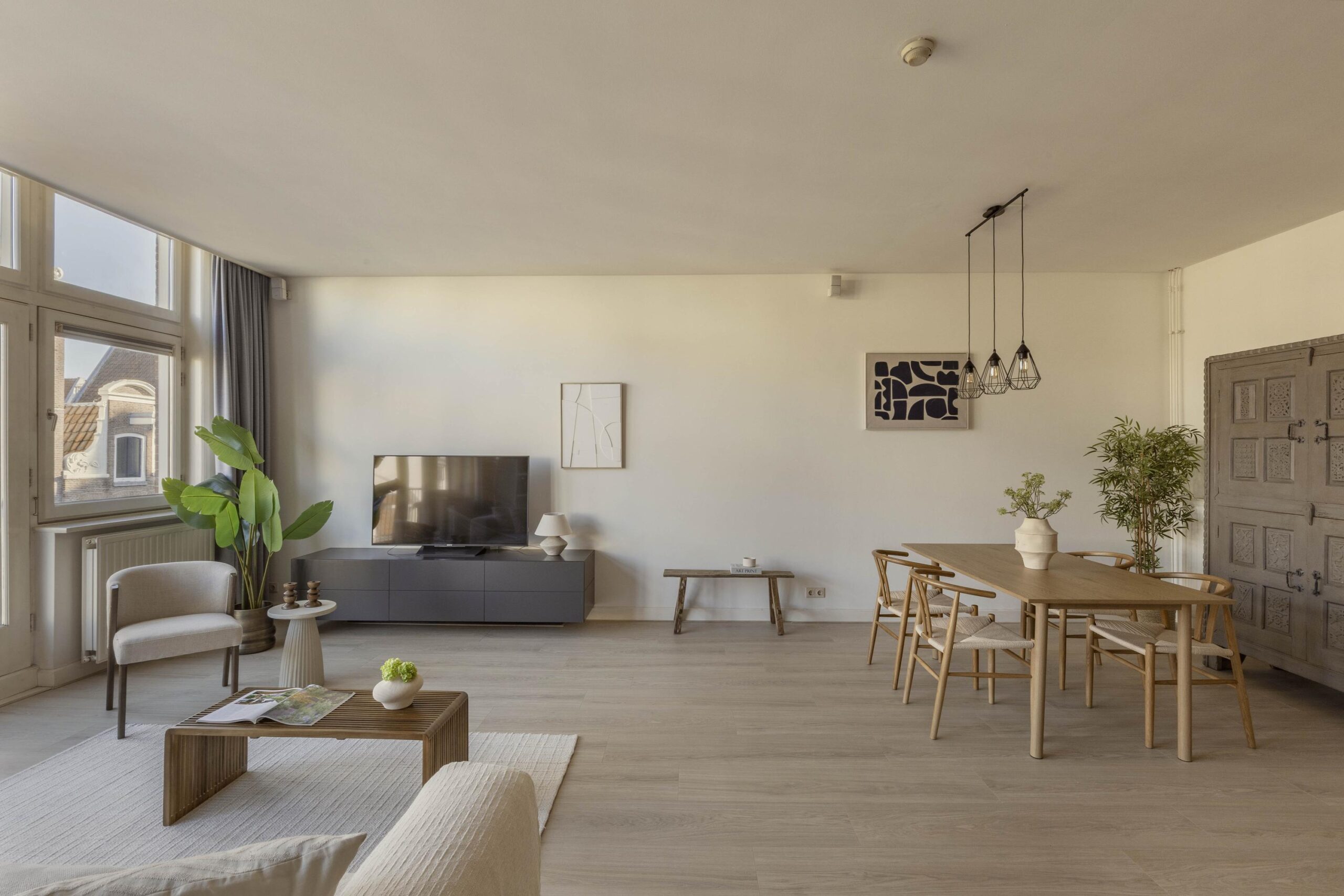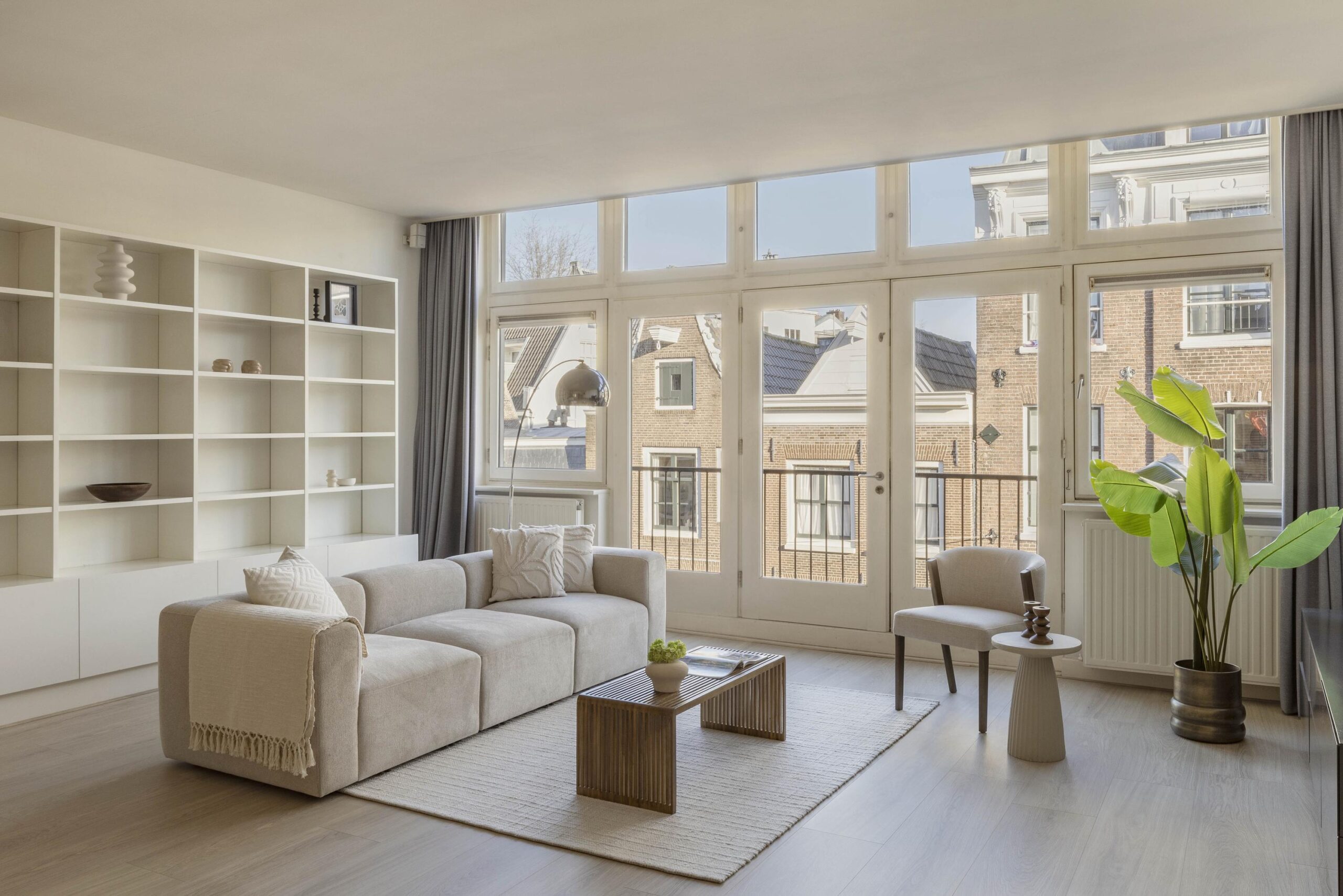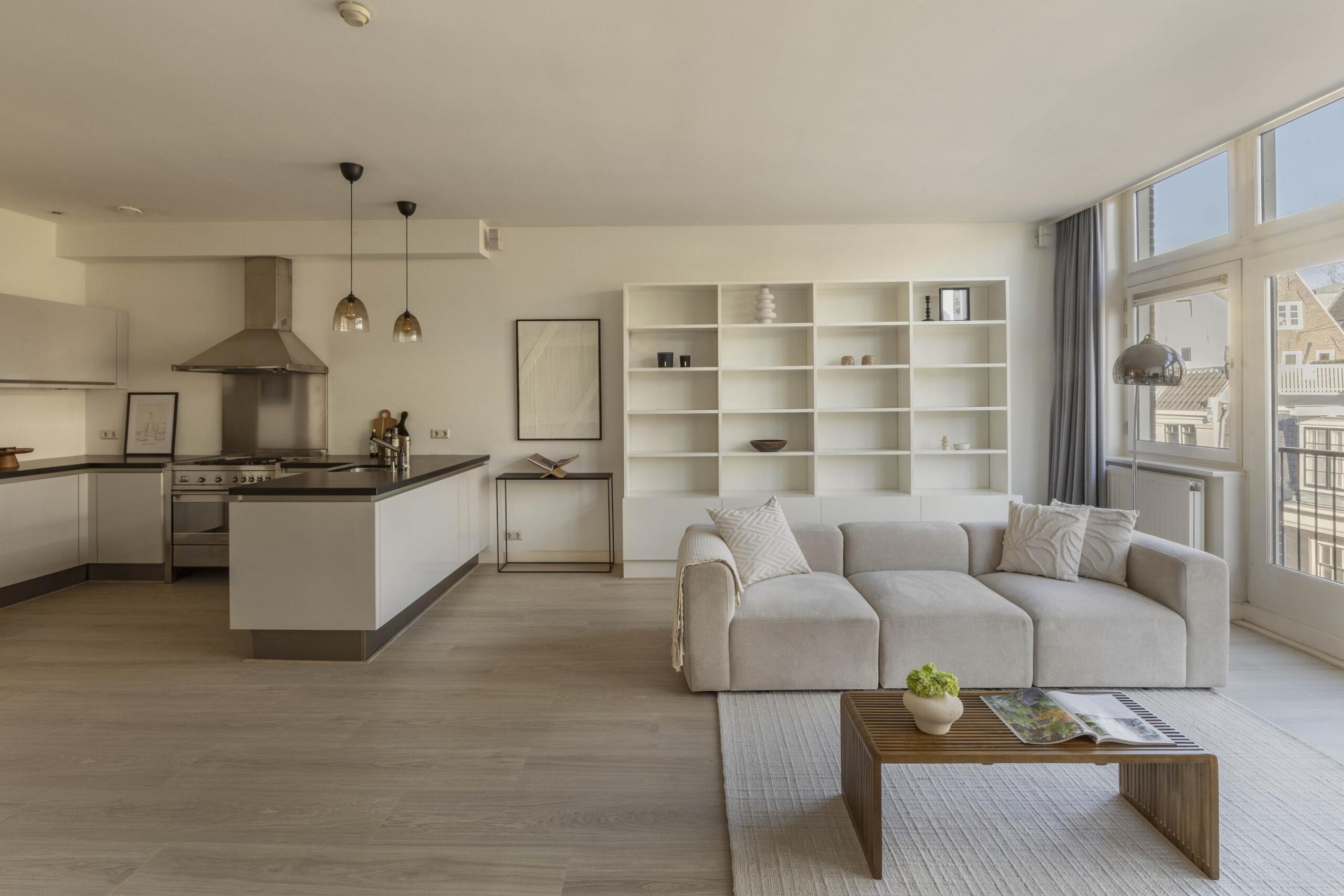 Located on the third and fourth floors of a classic early 20th-century building, this well-laid-out upper-level apartment spans approximately 116 m² and includes a generous rooftop terrace of around 58 m². The front living space is exceptionally wide, with a full-width glass façade offering iconic views over Amsterdam’s rooftops.