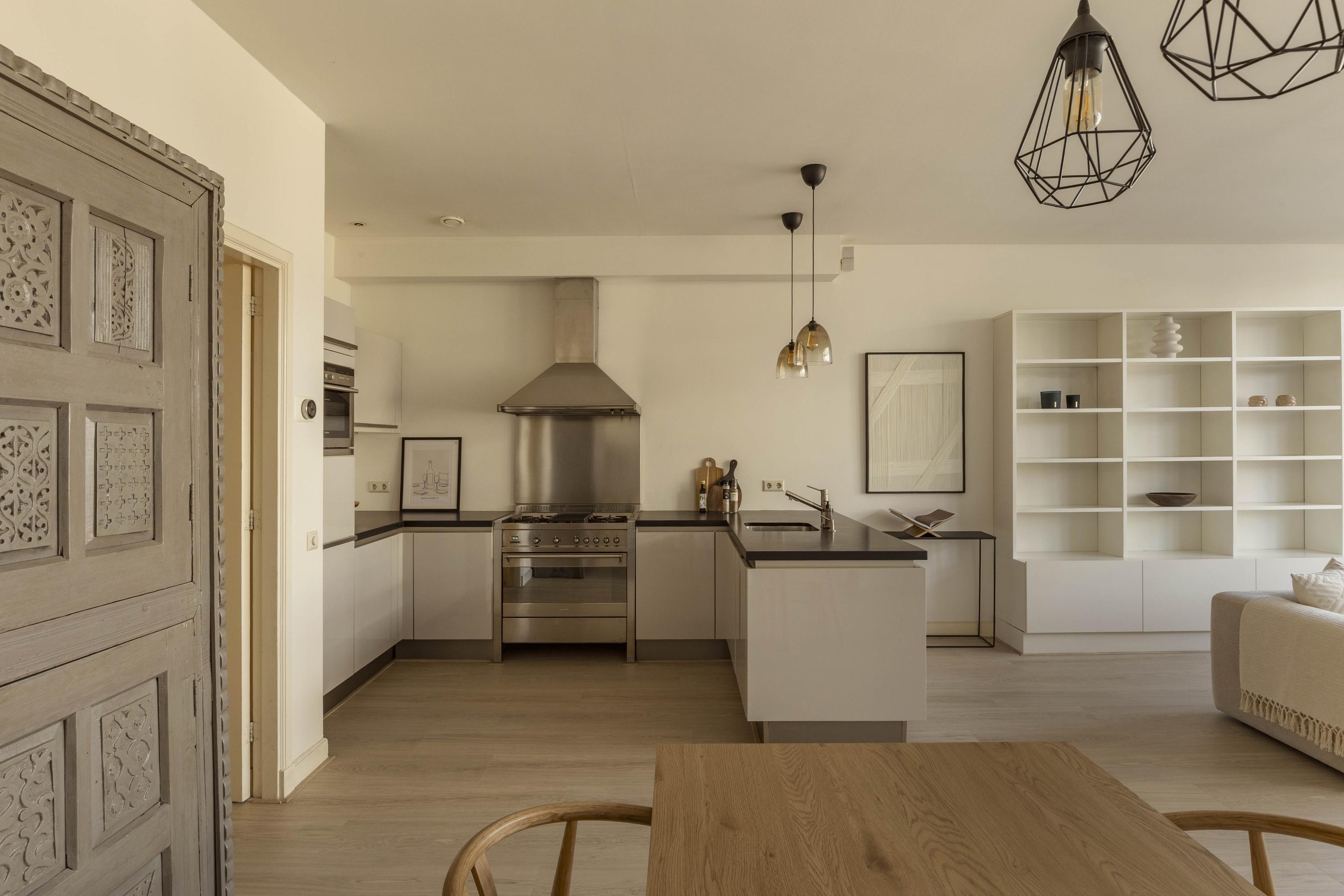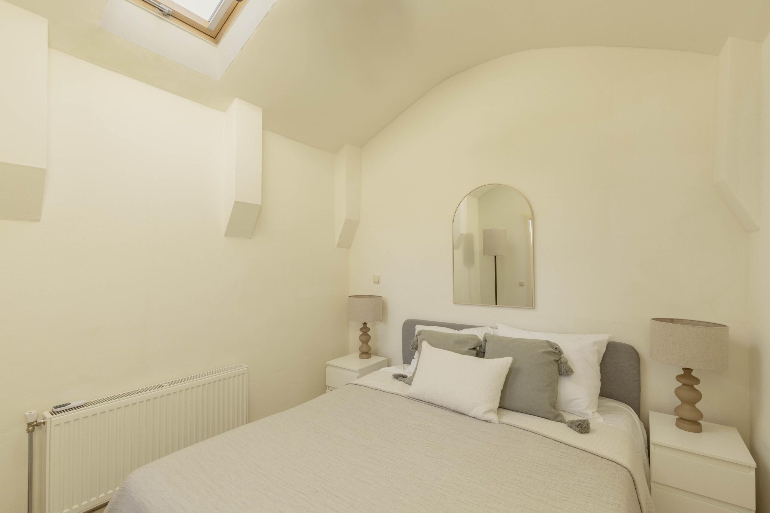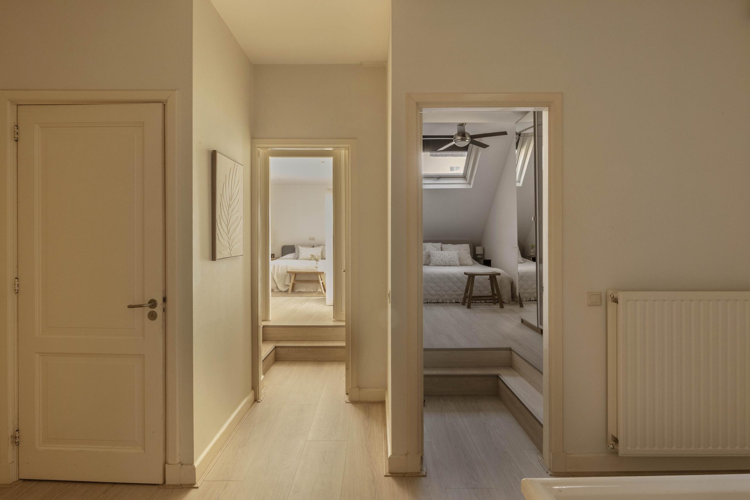 Accessed via a shared entrance at street level, the apartment features a private internal staircase leading up to the third floor. At the front, you’ll find a spacious living room with an open-plan kitchen, fitted with a Smeg oven and a five-burner gas hob. The wide glass front allows natural light to pour in, offering open views of the characteristic façades opposite.