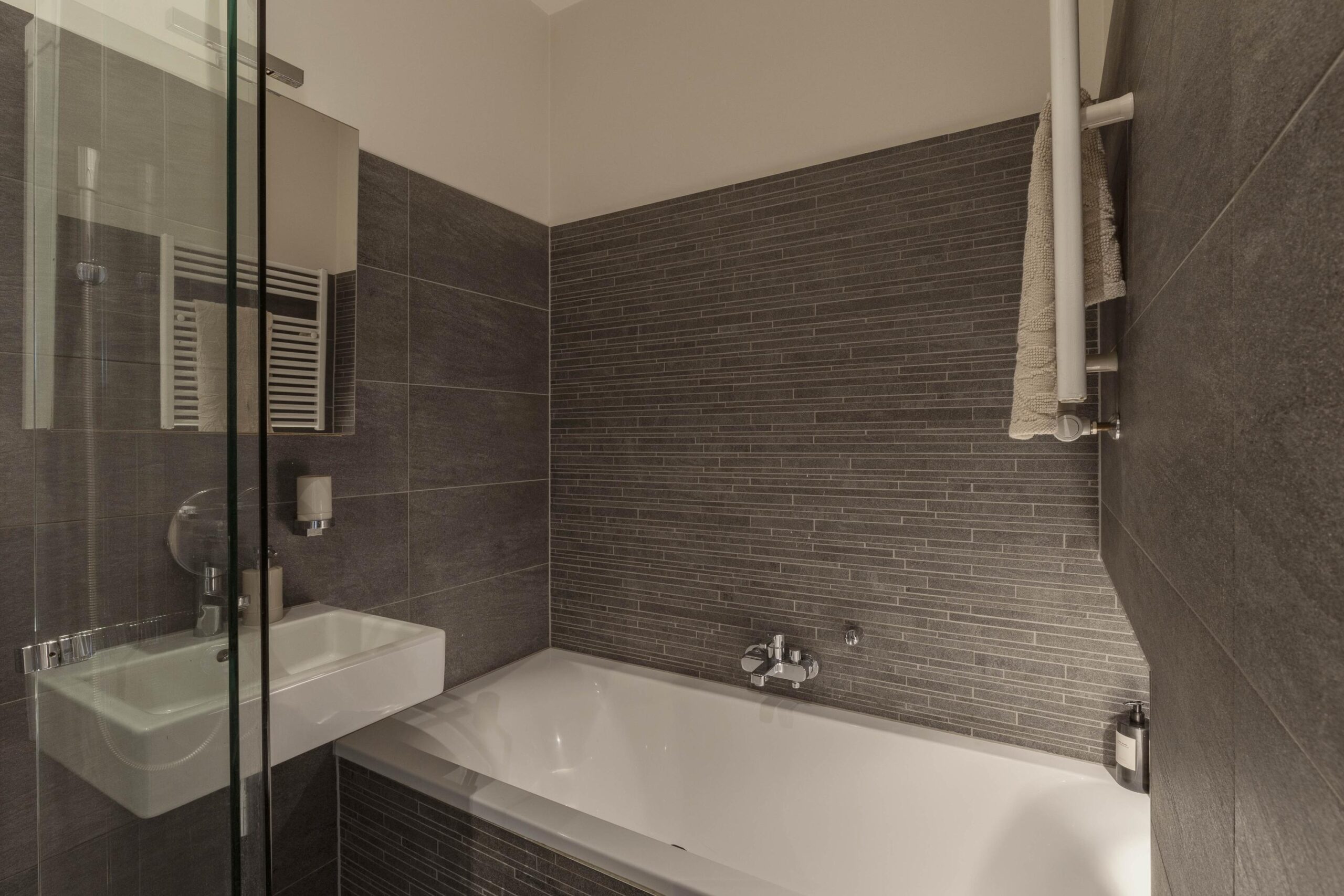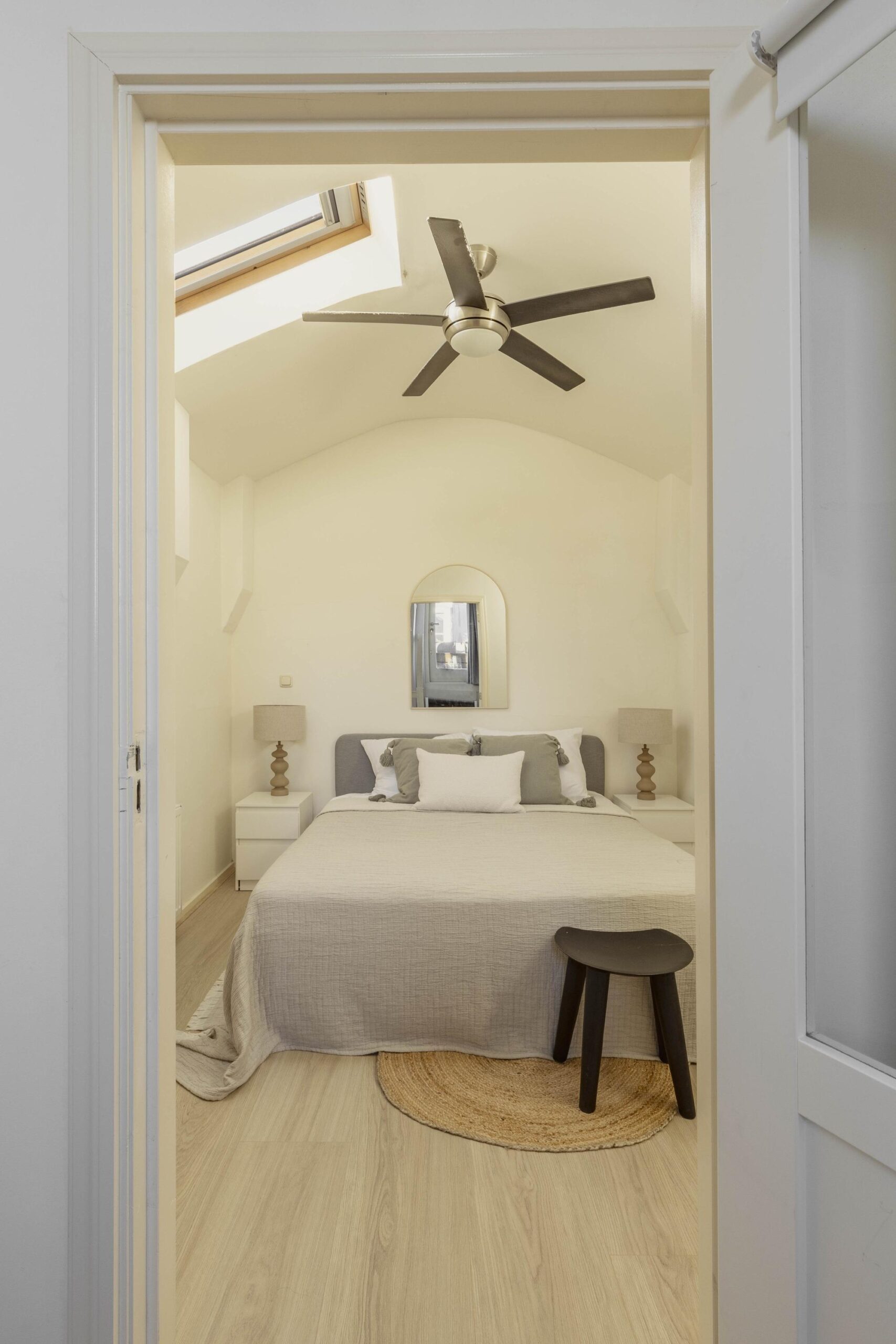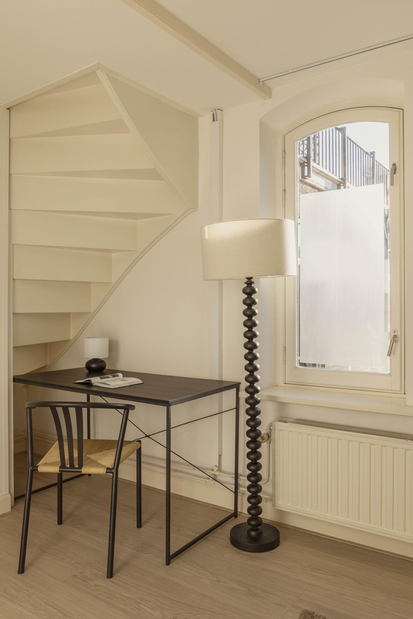 Accessed via a shared entrance at street level, the apartment features a private internal staircase leading up to the third floor. At the front, you’ll find a spacious living room with an open-plan kitchen, fitted with a Smeg oven and a five-burner gas hob. The wide glass front allows natural light to pour in, offering open views of the characteristic façades opposite.