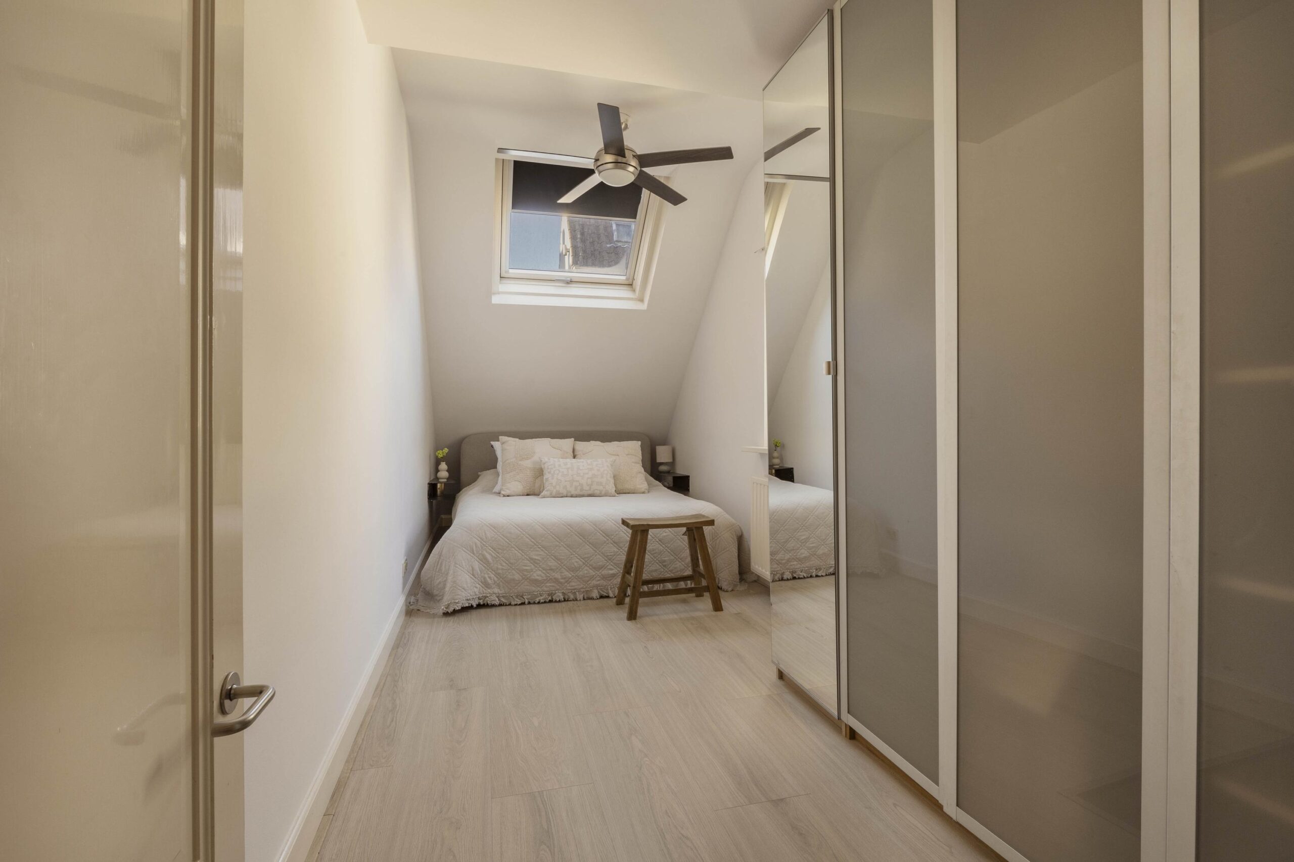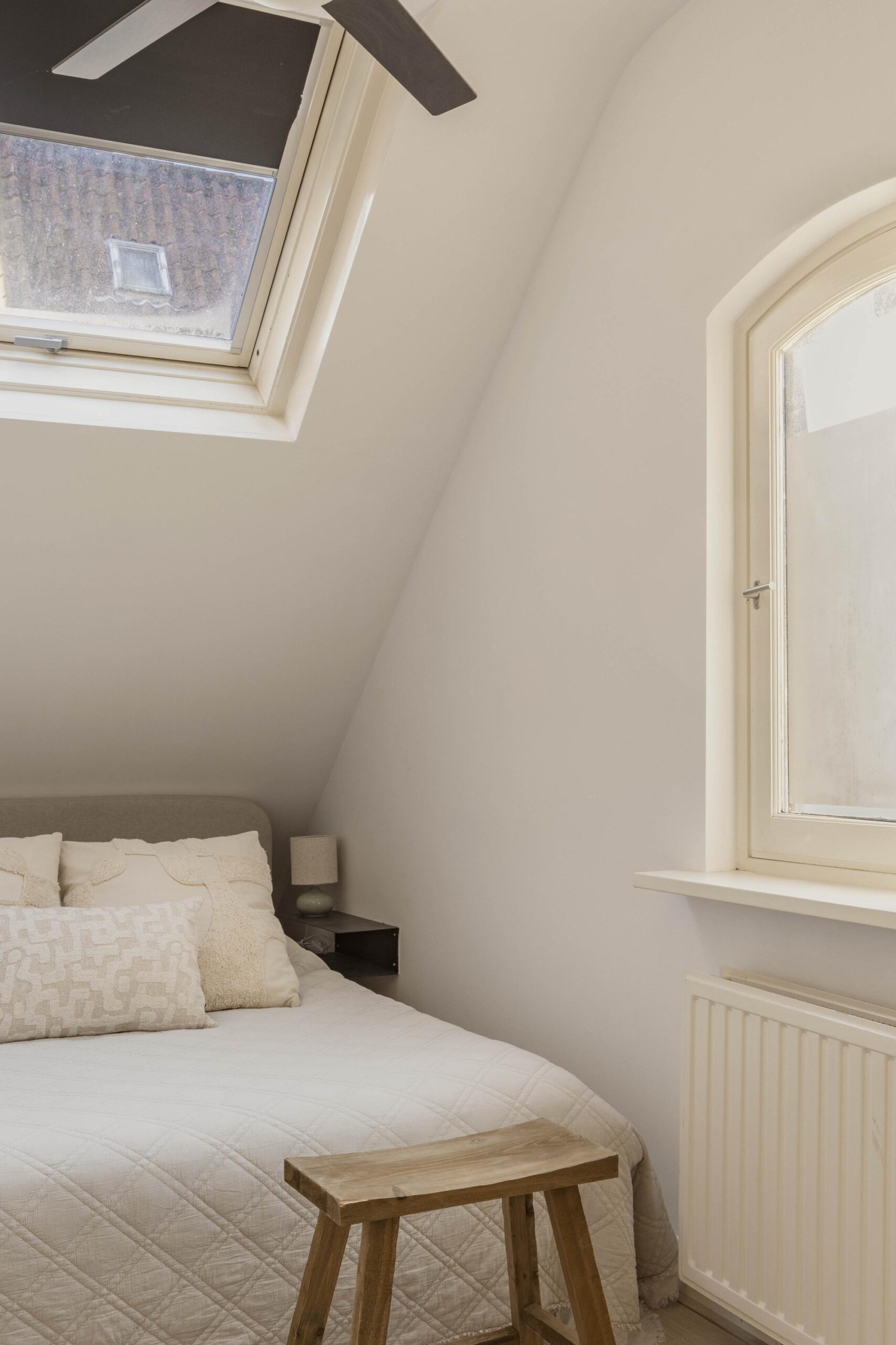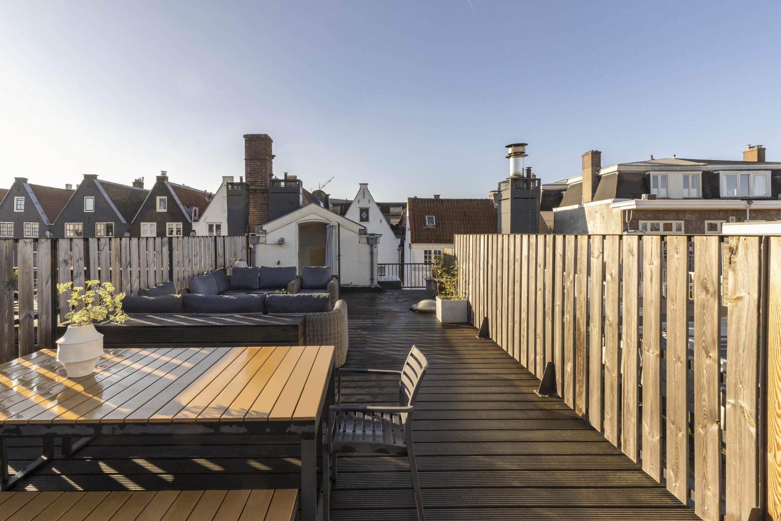 A fixed staircase leads to the fourth floor, which houses the third bedroom. From here, you step out onto a south-west facing rooftop terrace of approximately 58 m², a rare find in the city centre, offering full sun and panoramic views over the rooftops of Amsterdam.