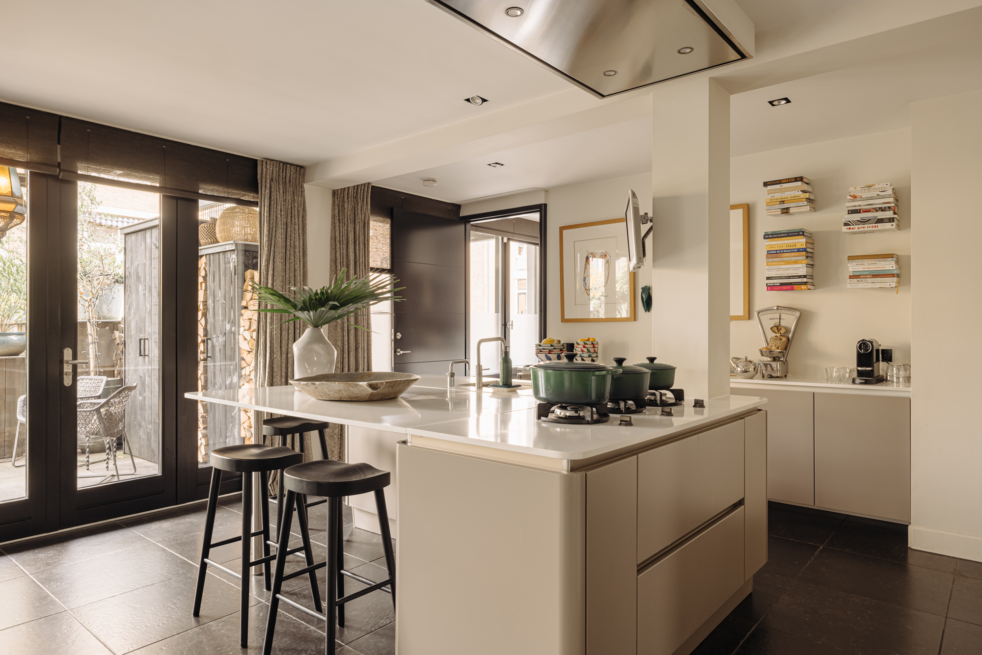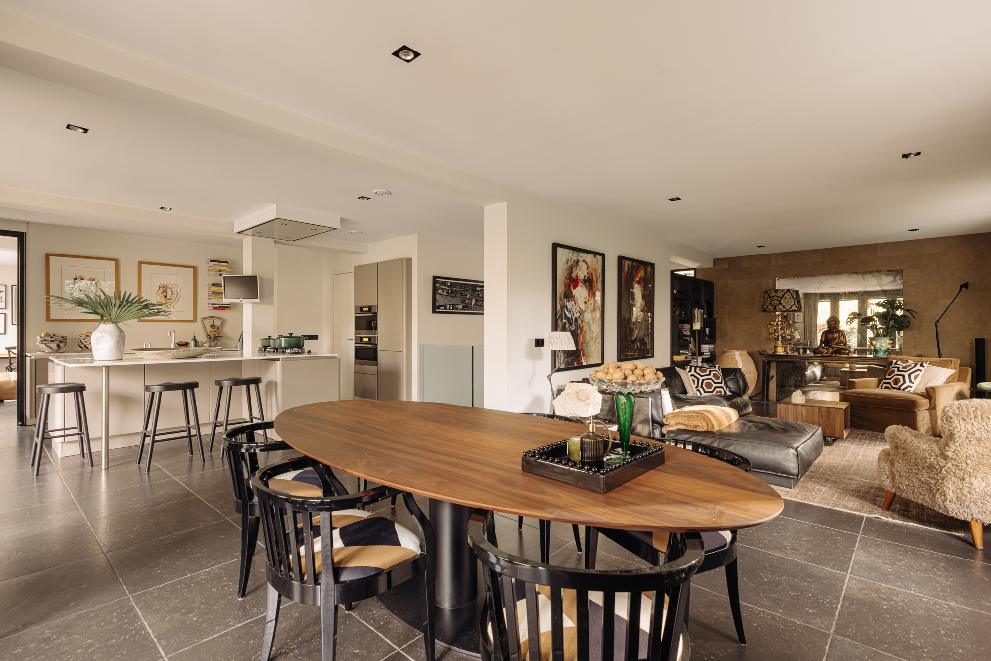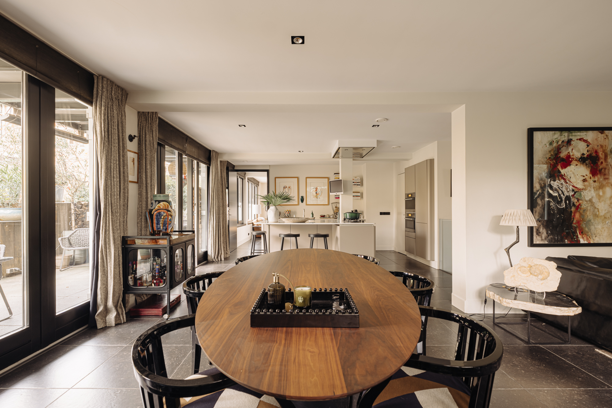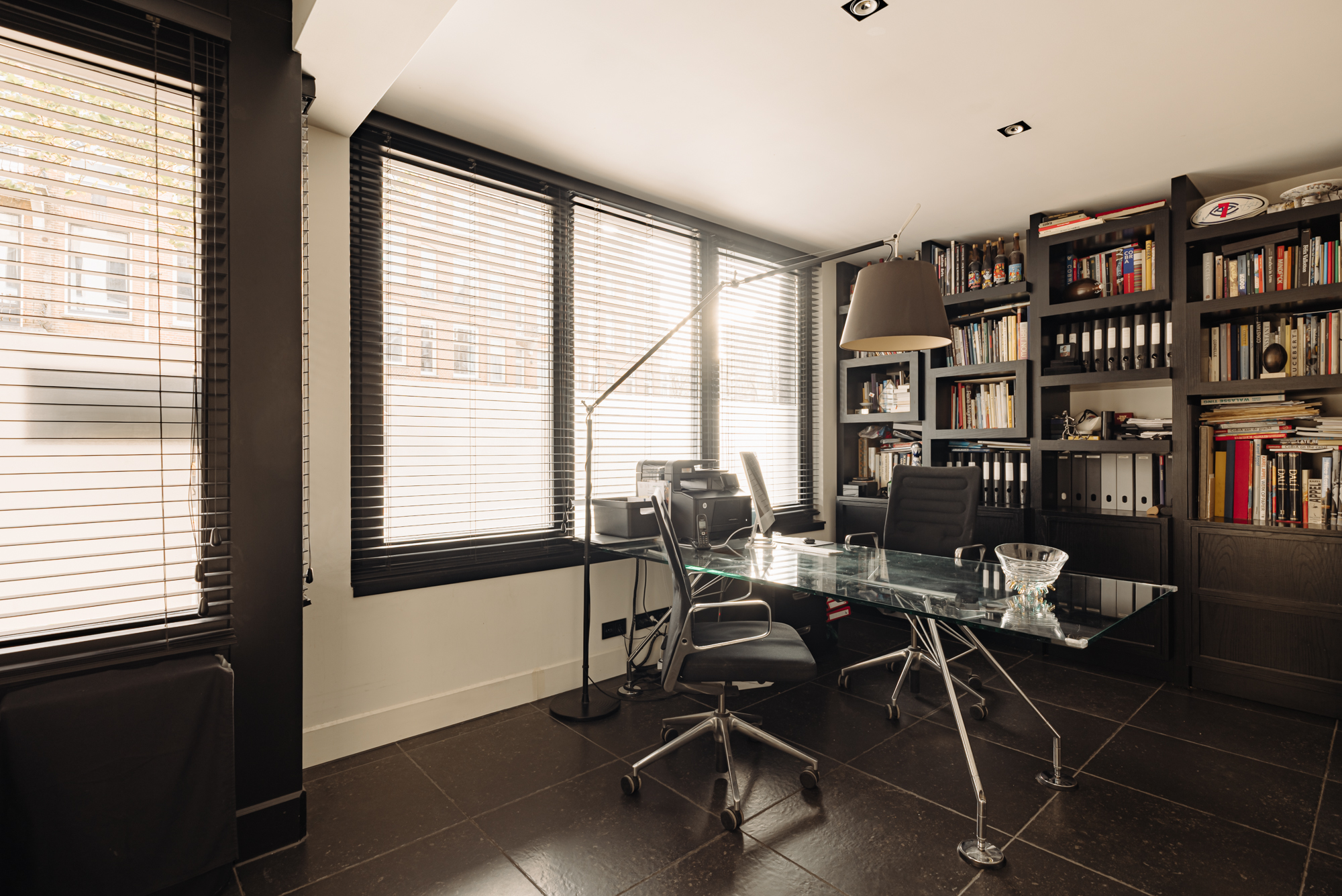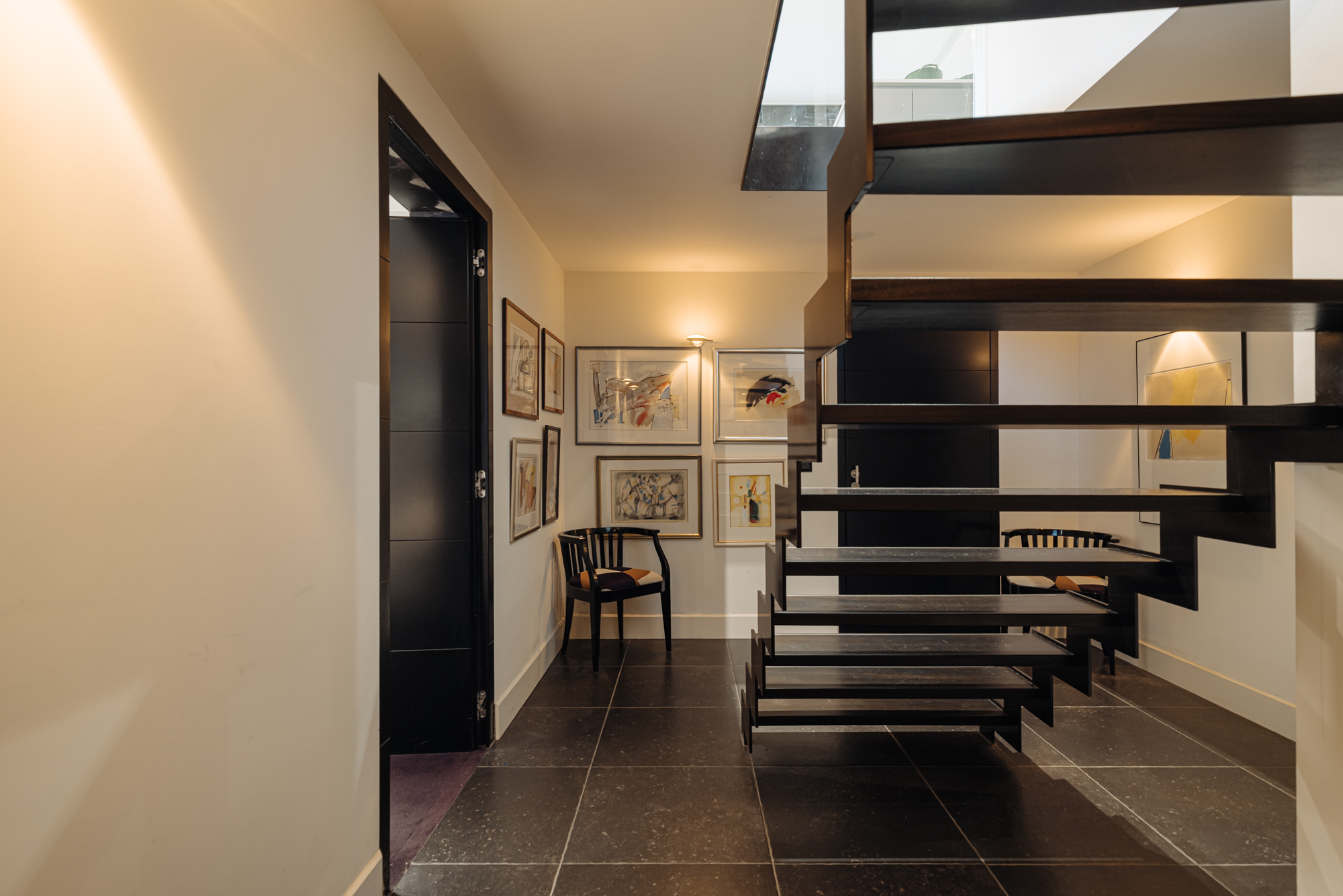 The property is accessed via a shared entrance hall, which leads to the private front door of the apartment. At the front of the property, there is a designated office space. The expansive main floor comprises a comfortable living room, a dining area and a modern open-plan kitchen. French doors open onto the large multi-level garden, which offers several seating areas.