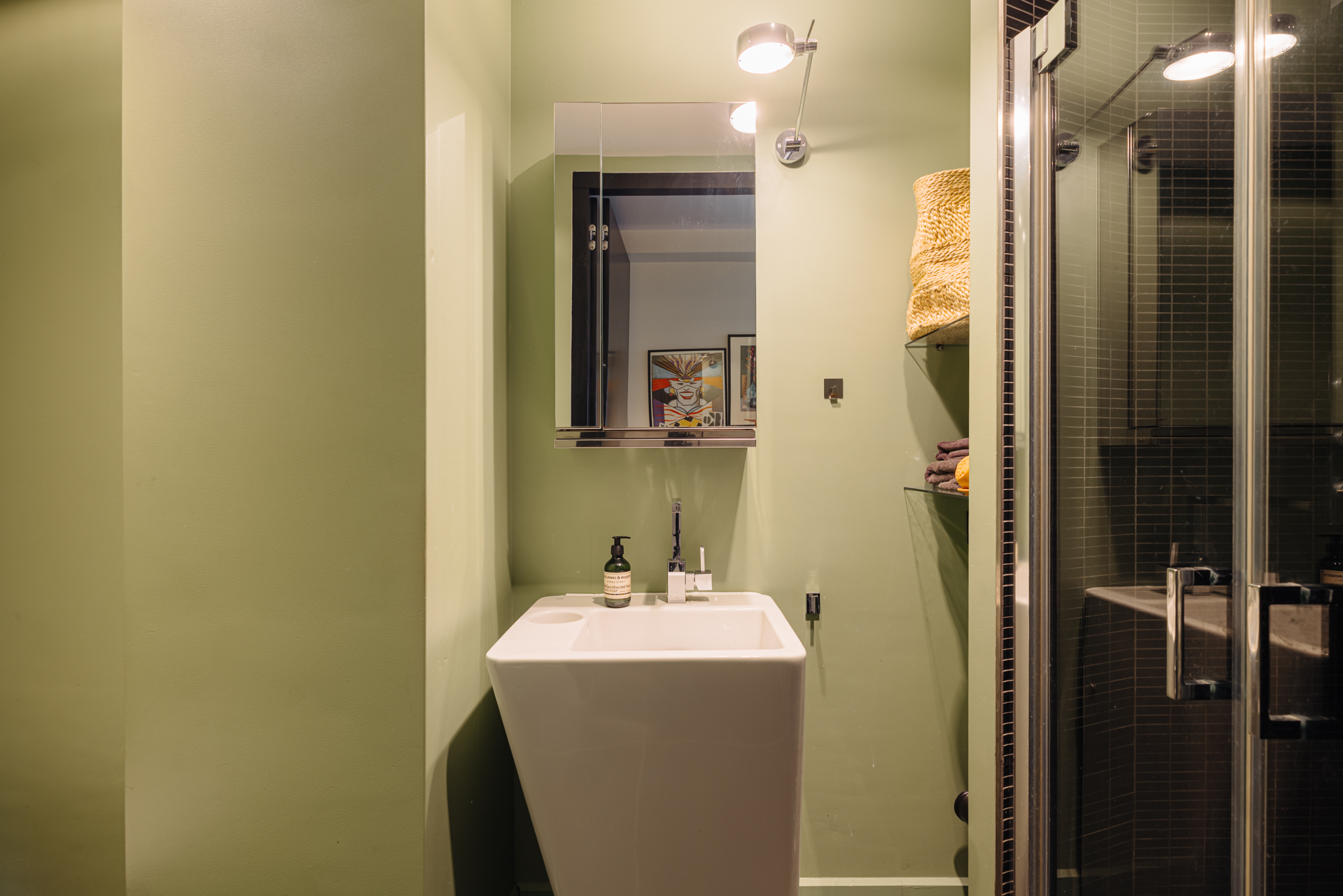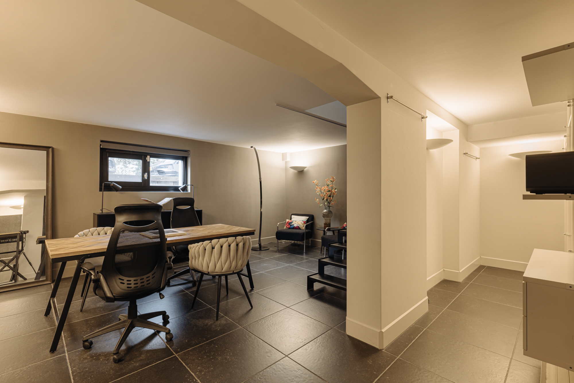 Next to the main house is a second, self-contained unit currently used as a home office. This space includes an open-plan work area with kitchen on the ground floor, an internal staircase leading to the basement, and a bathroom.