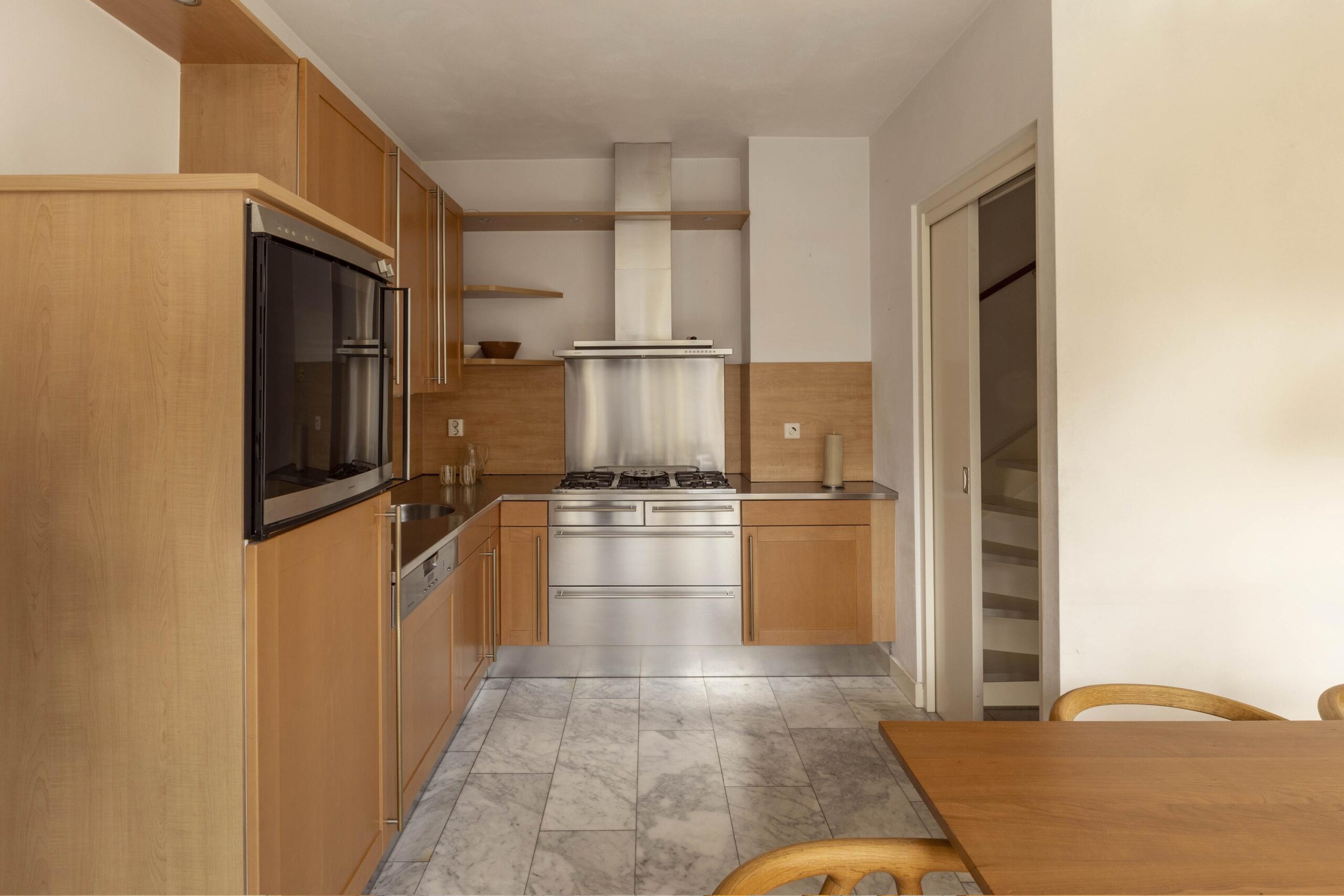 The first floor is arranged as a kitchen and dining area. The open mezzanine visually connects this level with the ground floor, while large windows on the canal side across both levels provide an abundance of natural light.