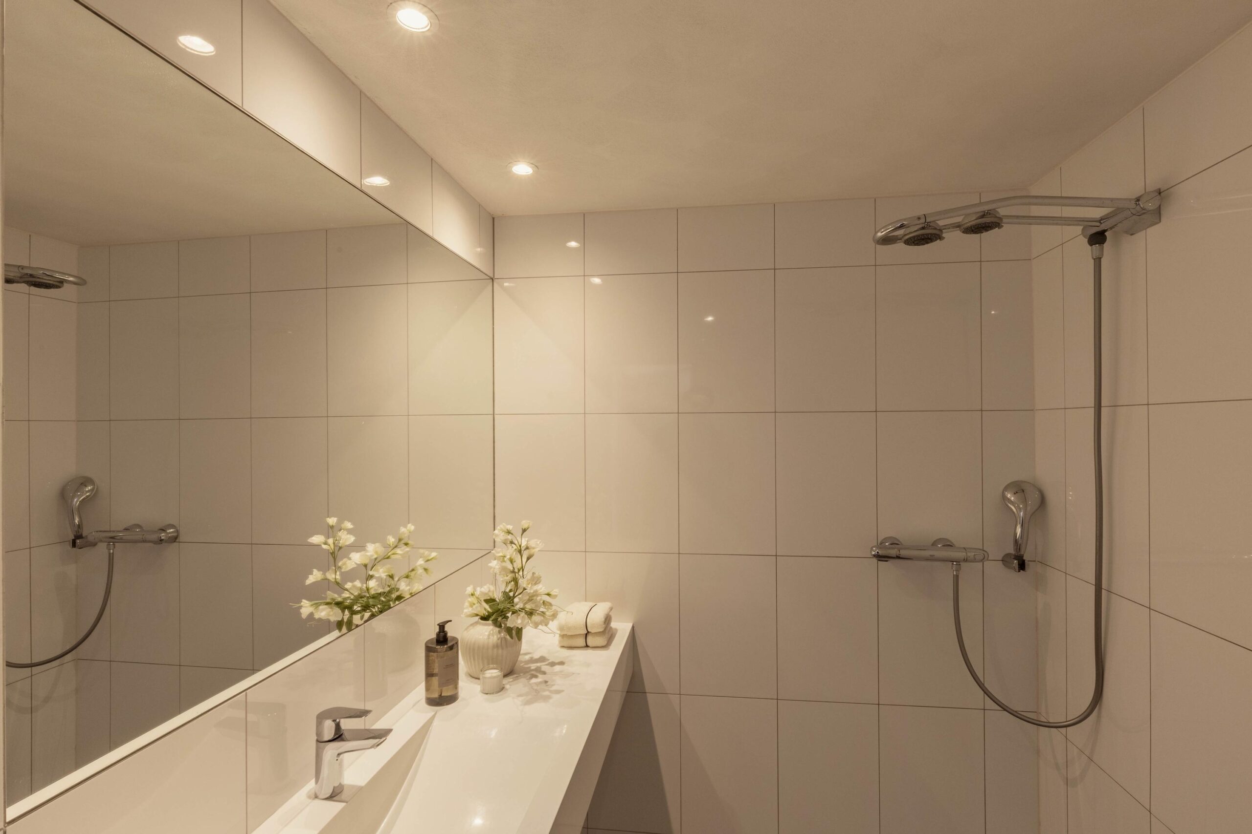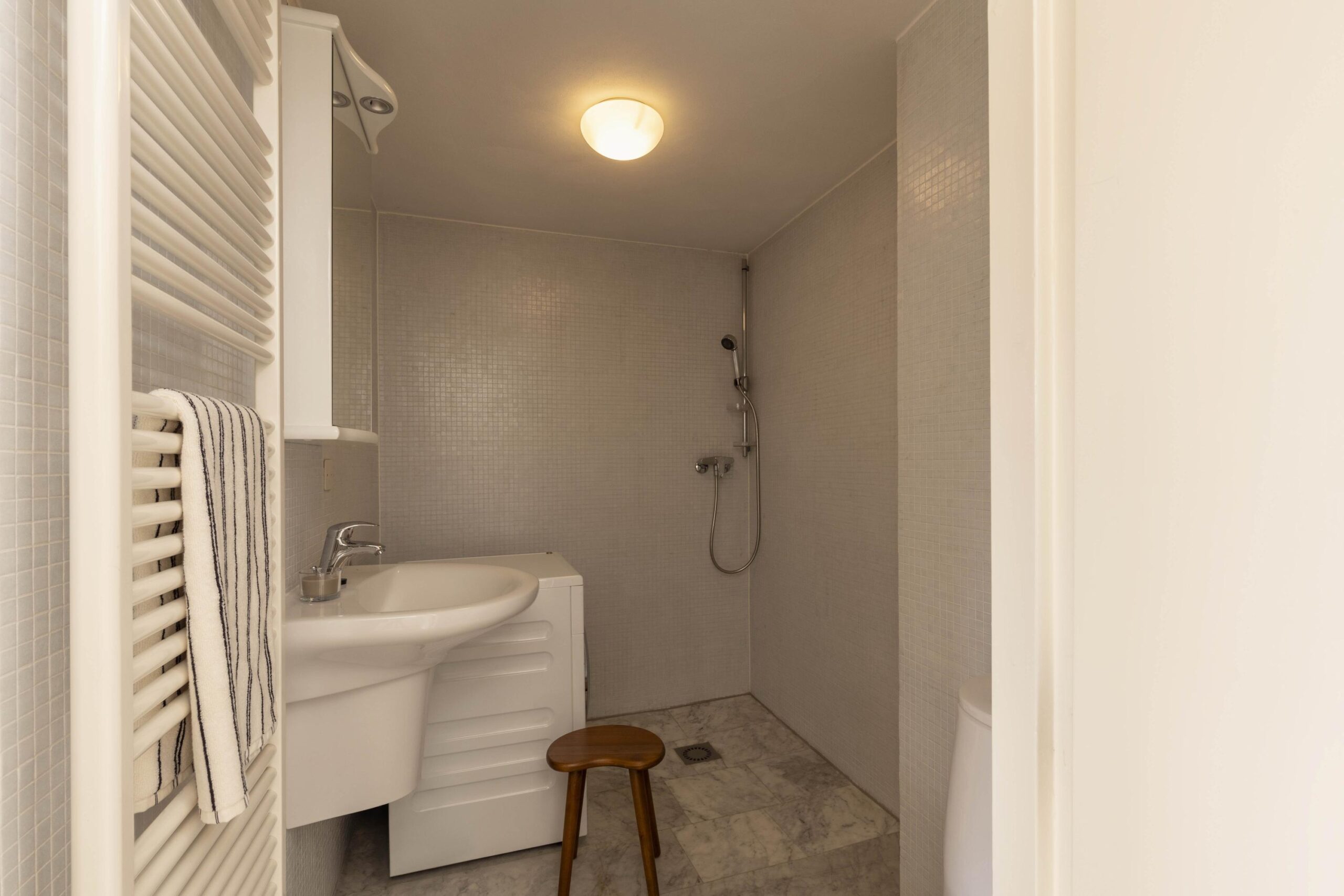 The third and fourth floors are arranged as sleeping quarters. Both bedrooms offer ample space for a bed, wardrobe, and a work or sitting area, and each features an en-suite bathroom, one of which is equipped with a connection for a washing machine.