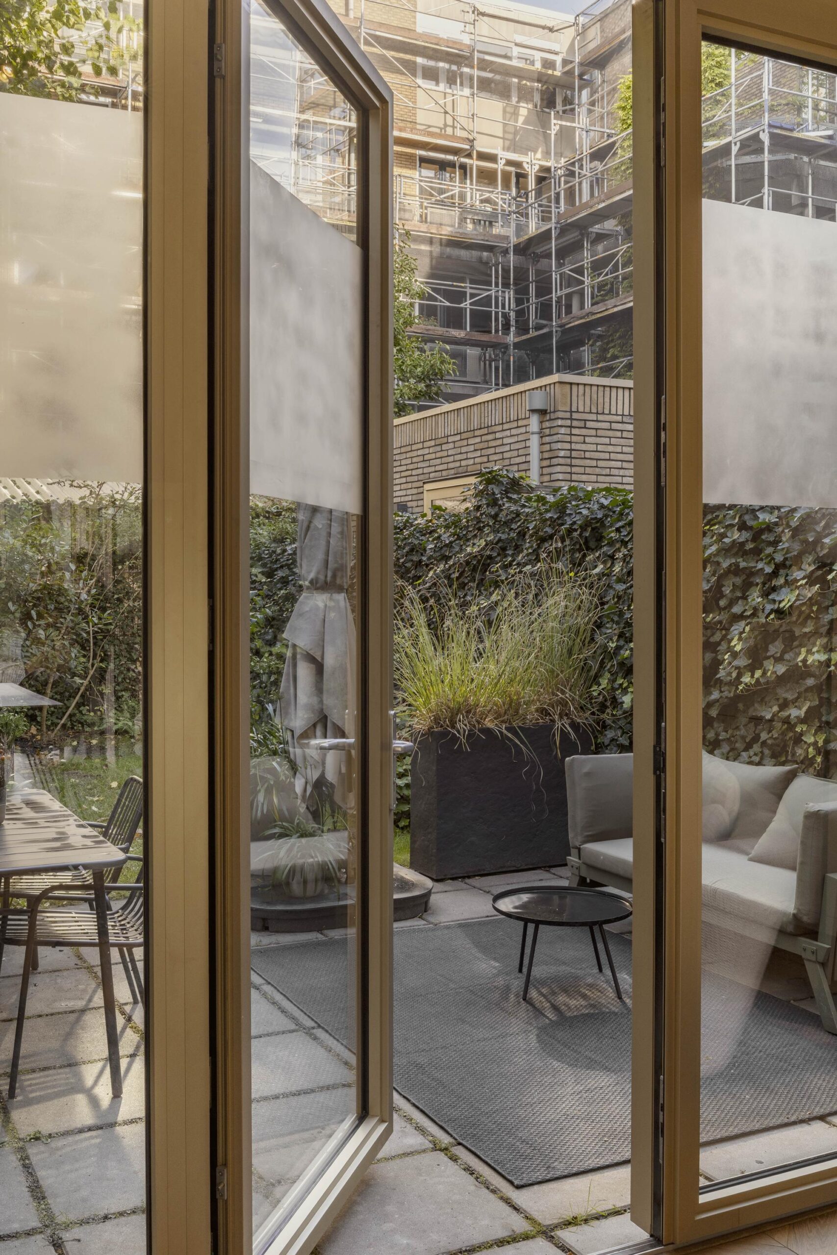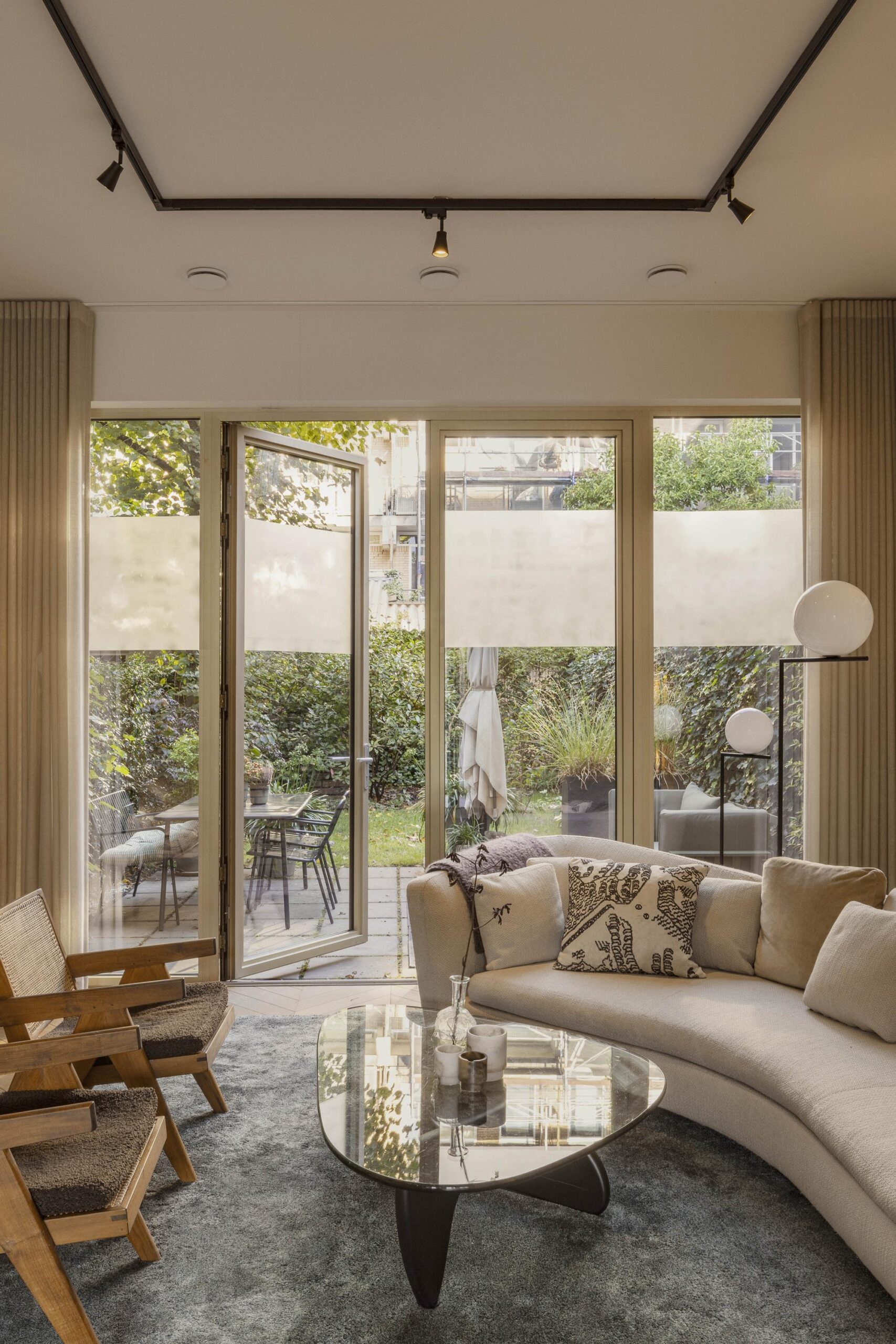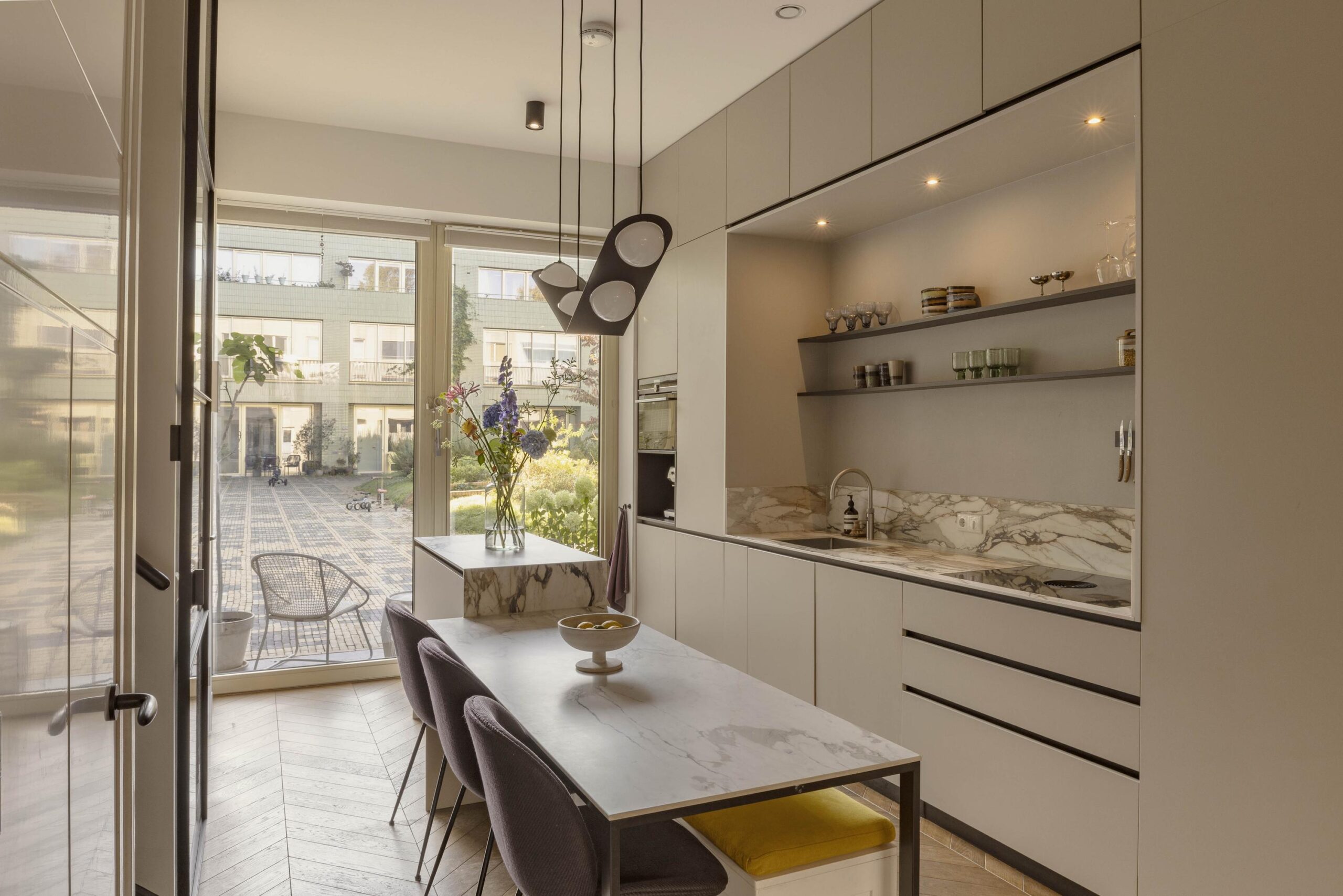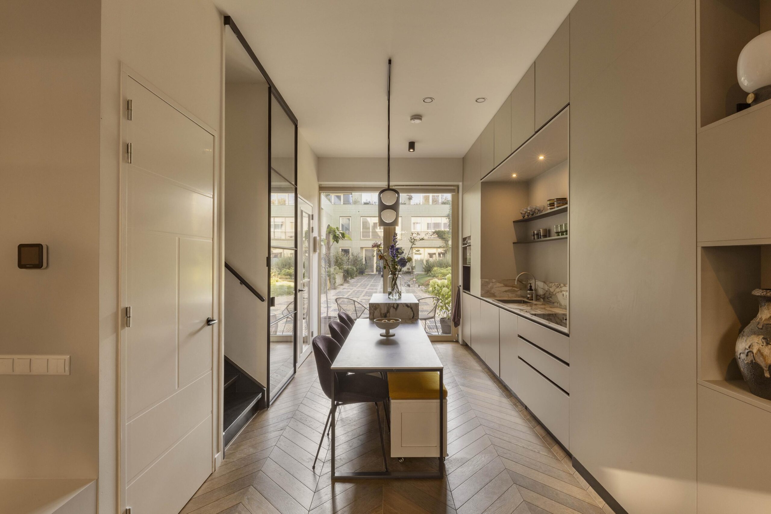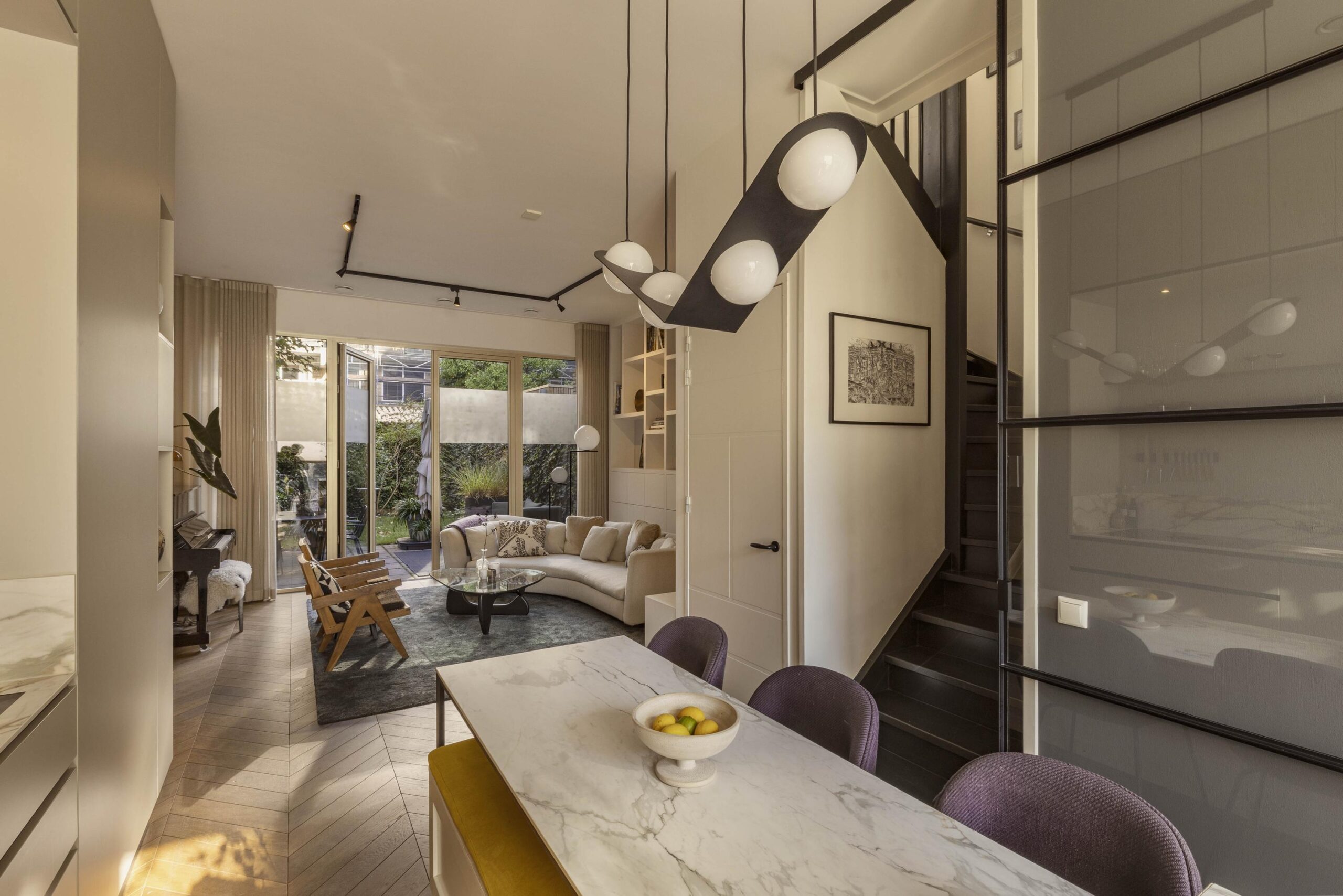 The ground floor offers an open and light-filled living area with a ceiling height of 3.28 meters, custom-built cabinetry, and a luxurious kitchen. French doors open onto the private terrace and the shared garden, facing northwest and enjoying the afternoon and evening sun.
