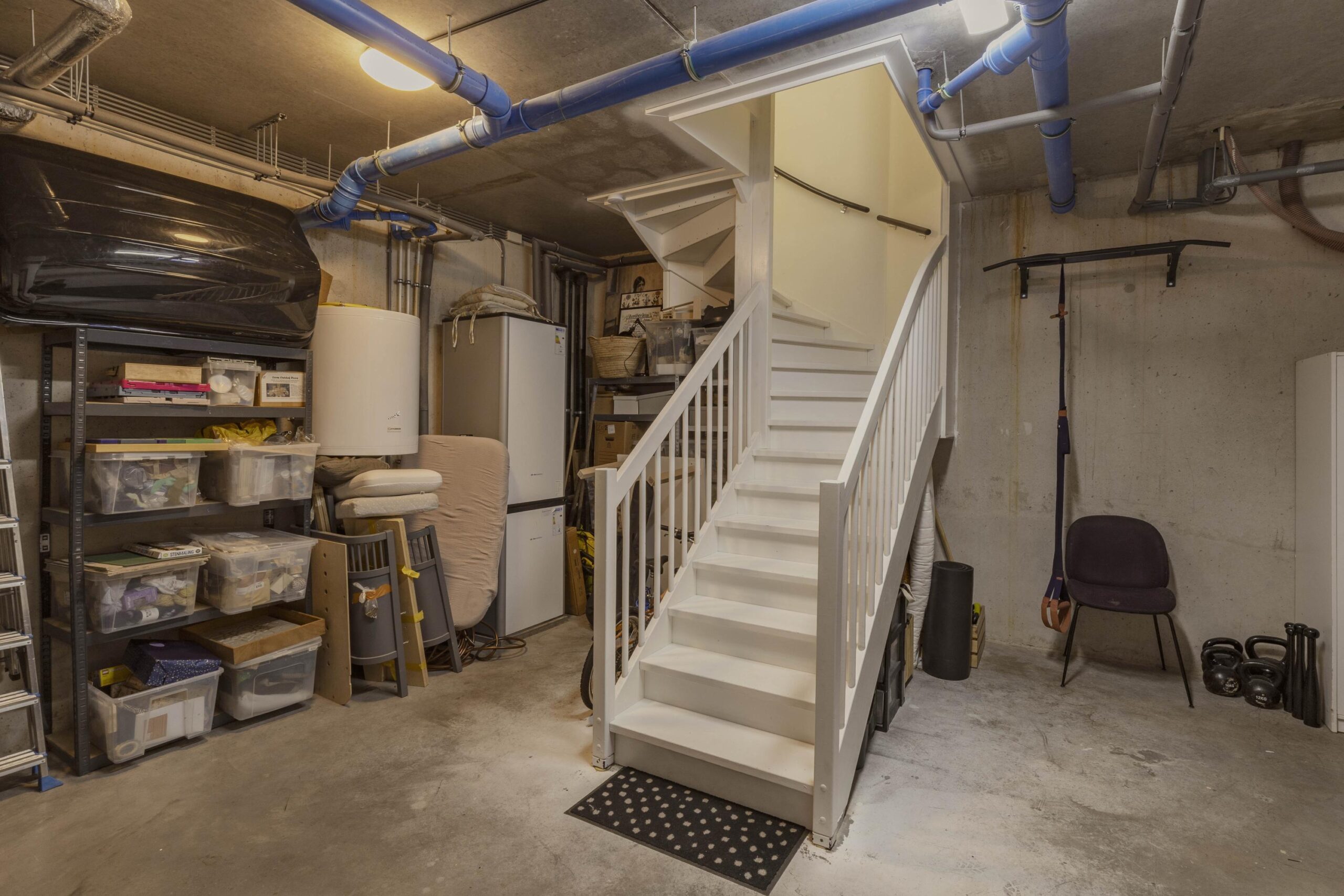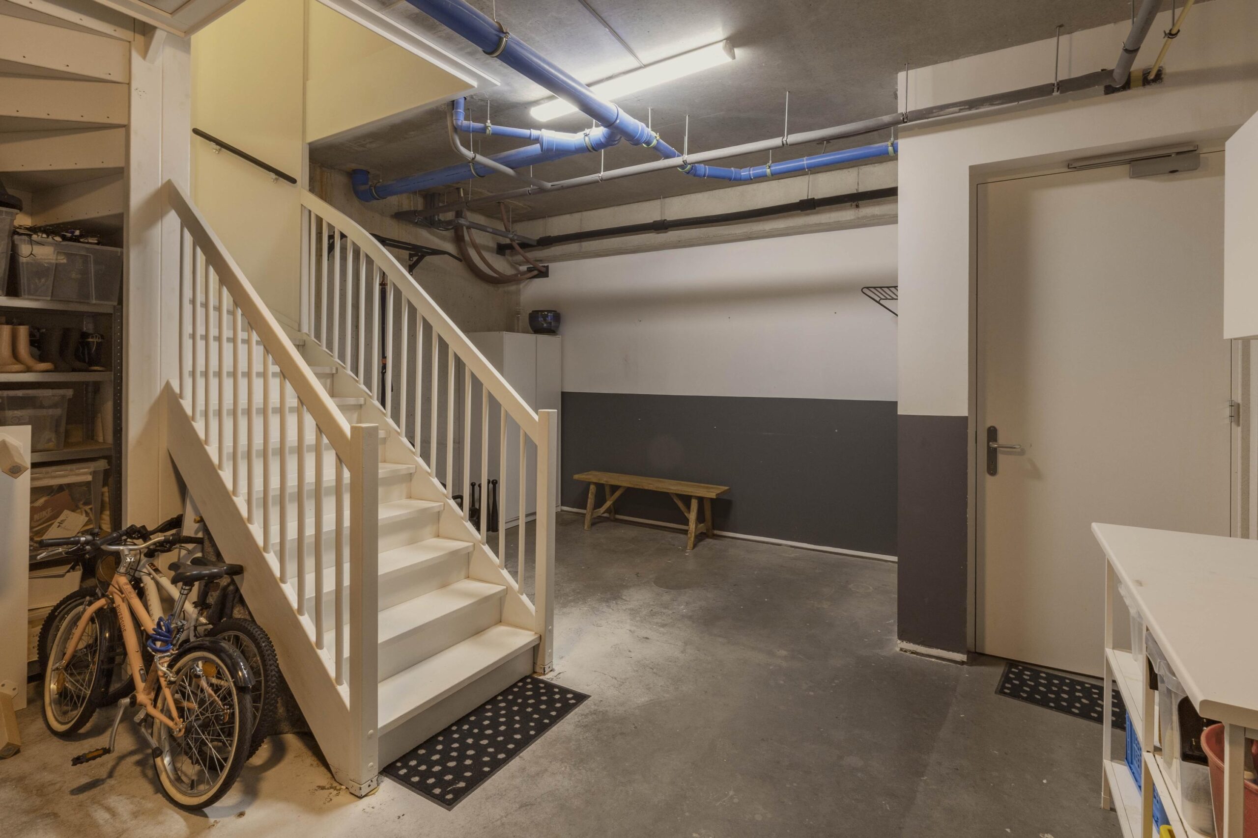 The spacious basement, with a ceiling height of 3.28 meters, is accessible via a fixed staircase from the living room and offers a variety of uses, such as a gym, workspace, or additional storage. From here, there is direct access to the parking garage.