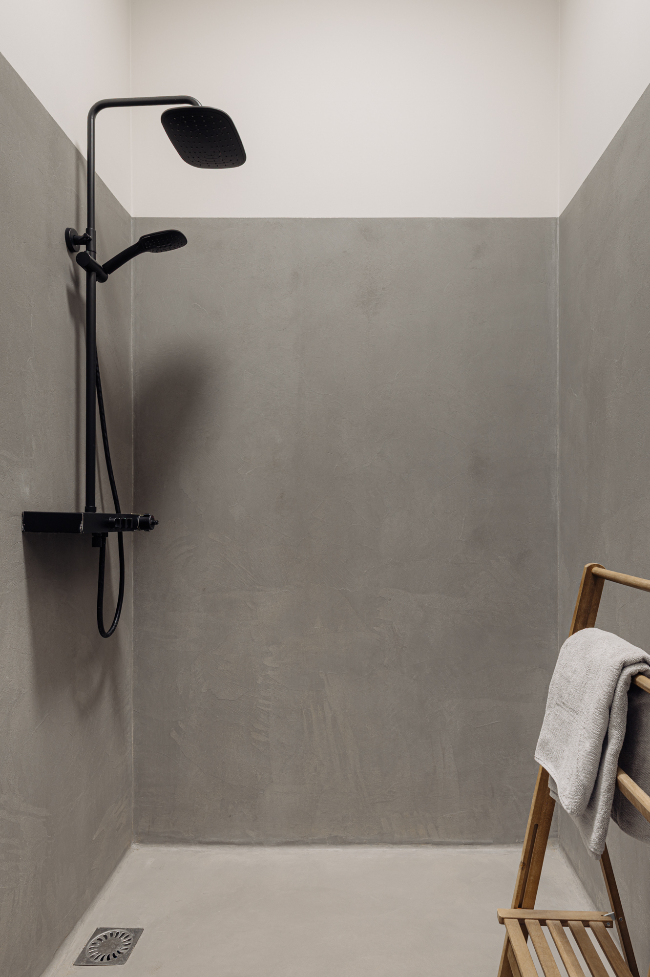 • Luxury bathroom with walk-in shower, double vanity, and Mortex finish.