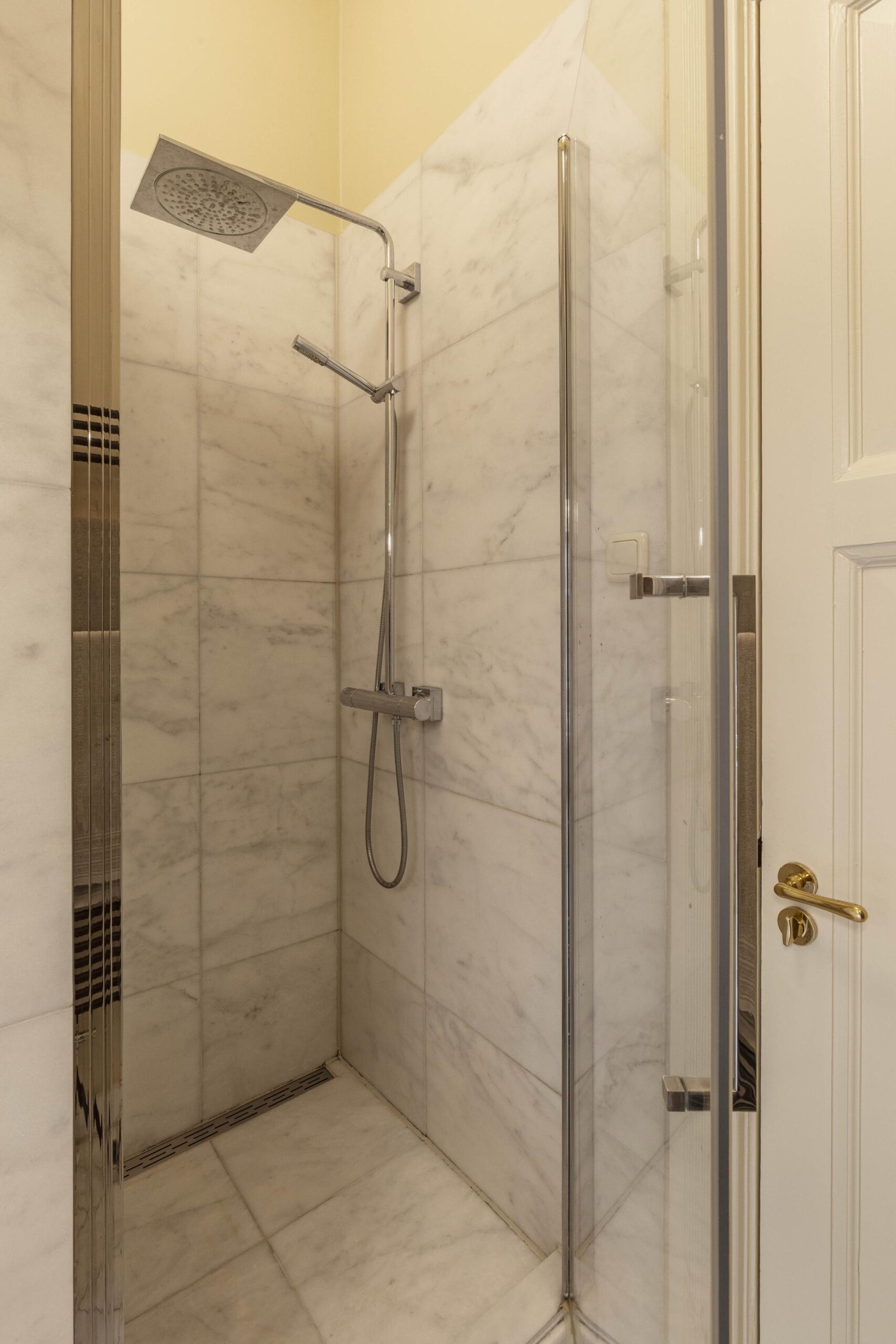 Adjacent to the living room is the first bedroom, featuring an en-suite bathroom with a walk-in shower, vanity, and towel radiator. The second, equally spacious bedroom is located at the rear of the apartment. The apartment’s single-level layout enhances its sense of openness and flow, making it both elegant and highly liveable.