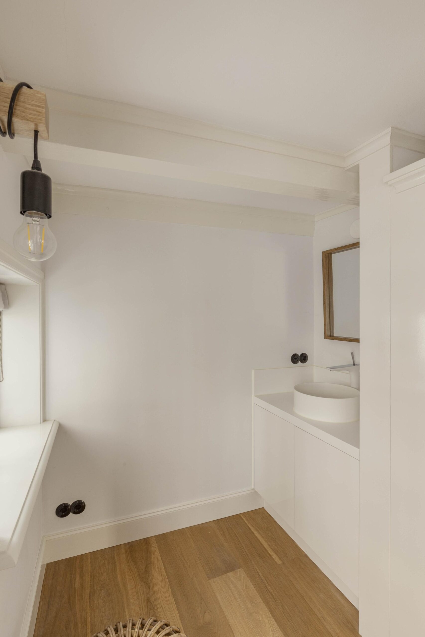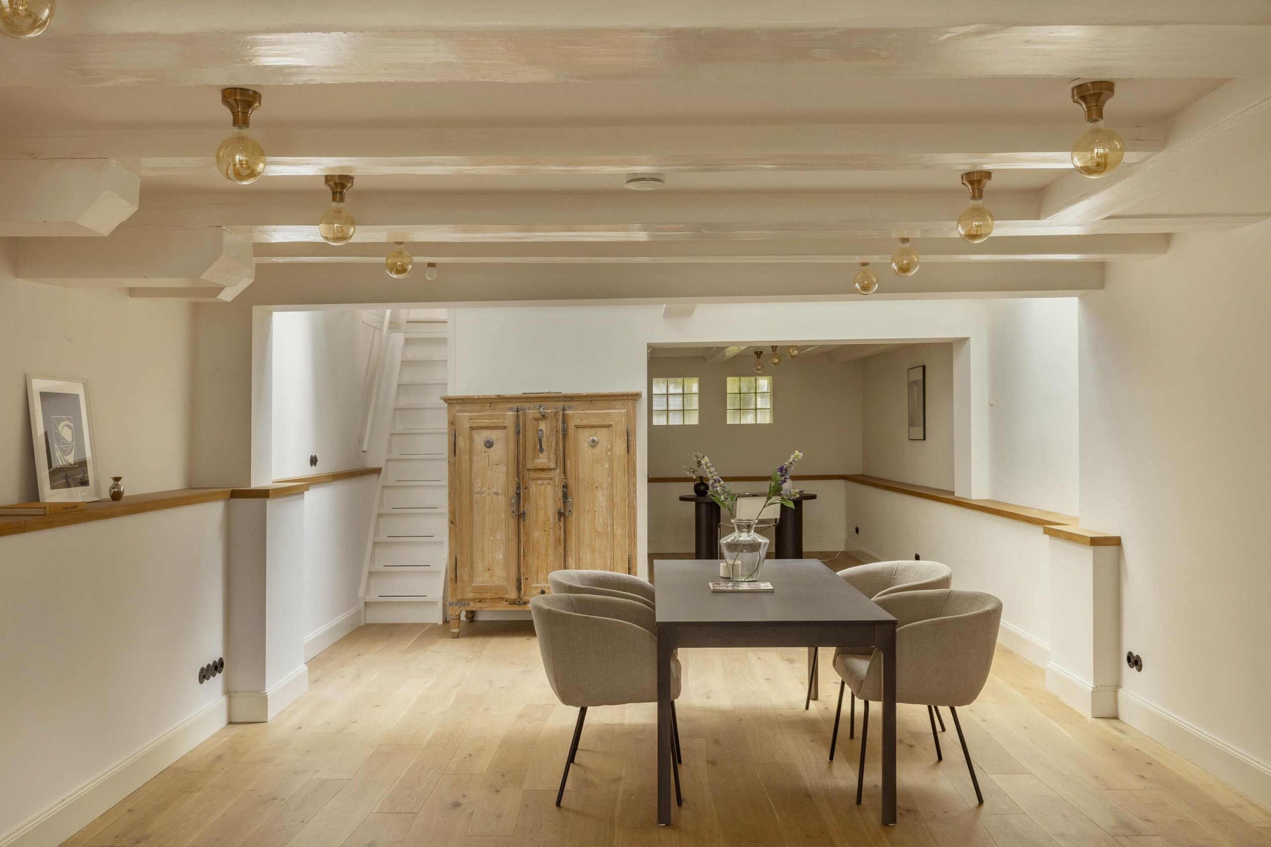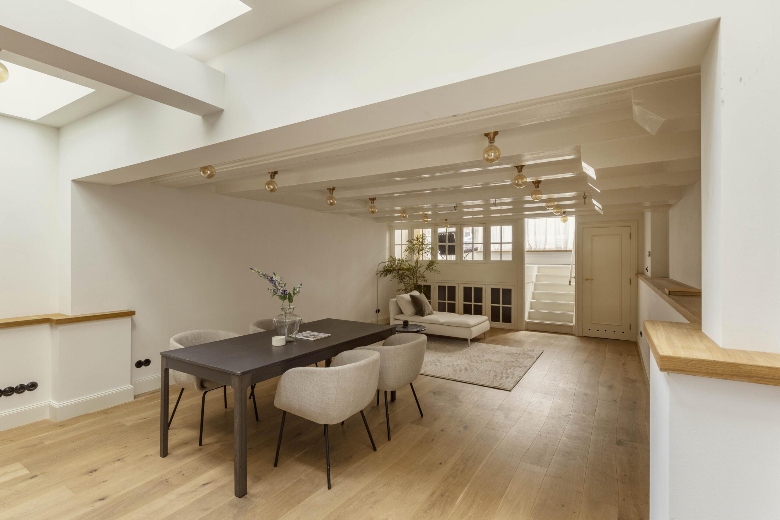 The basement level is fully finished and benefits from generous daylight through several skylights. A fixed staircase leads down to a cellar, which currently serves as a laundry room and houses the technical installations. This level is presently arranged as a second living room and workspace, and includes a second bathroom with walk in shower, bath, wash basin and toilet. Underfloor heating is installed in the basement.