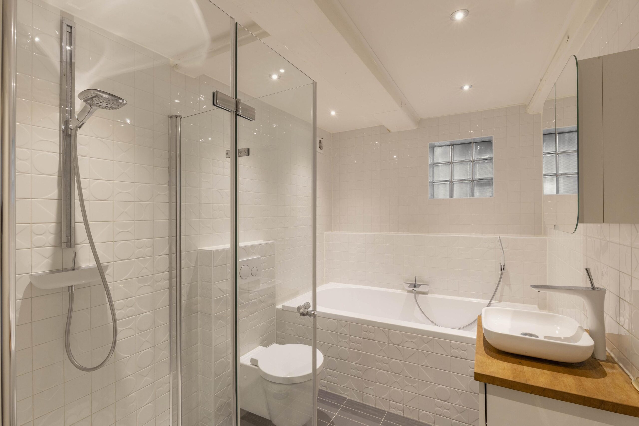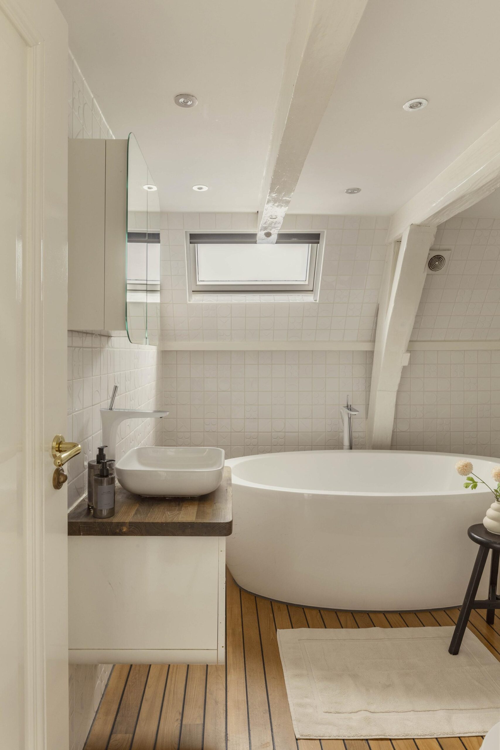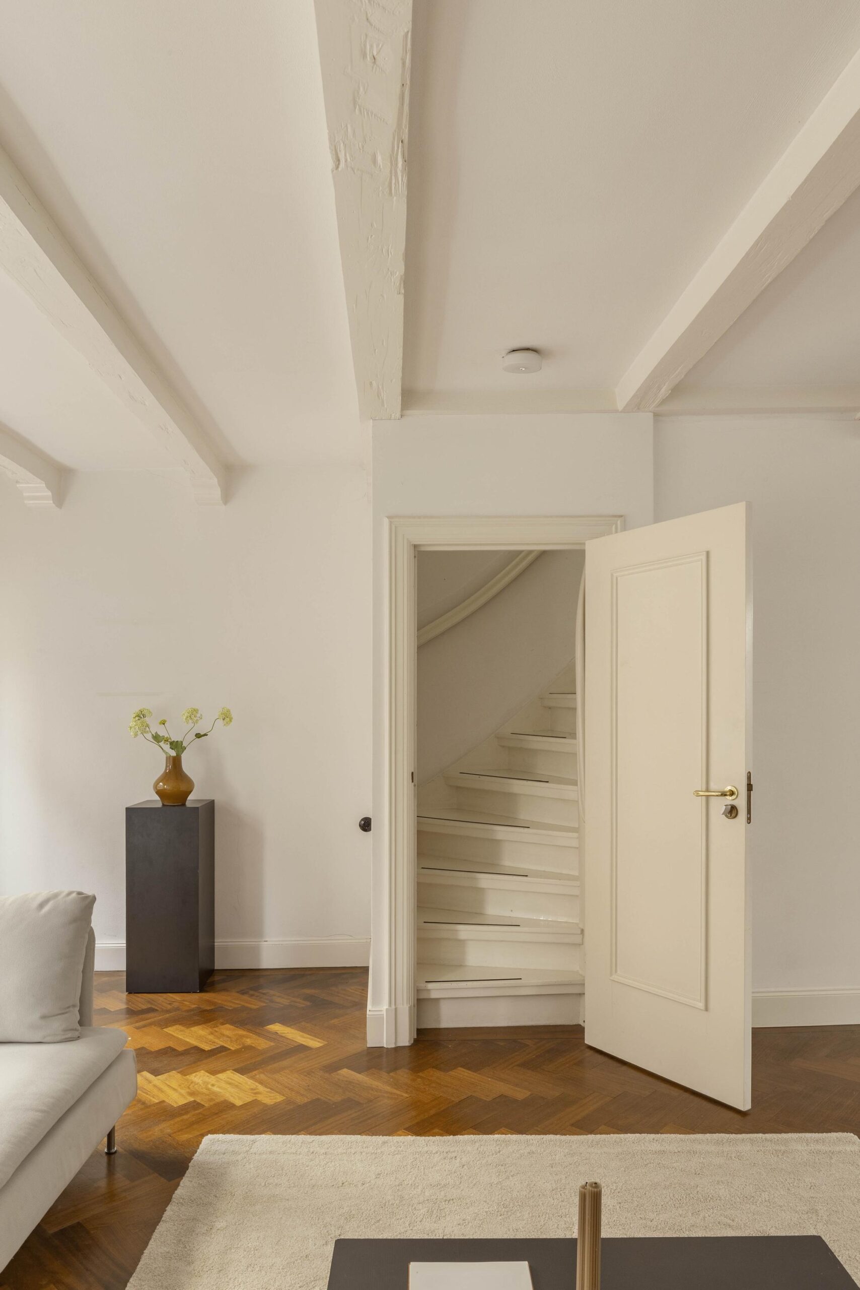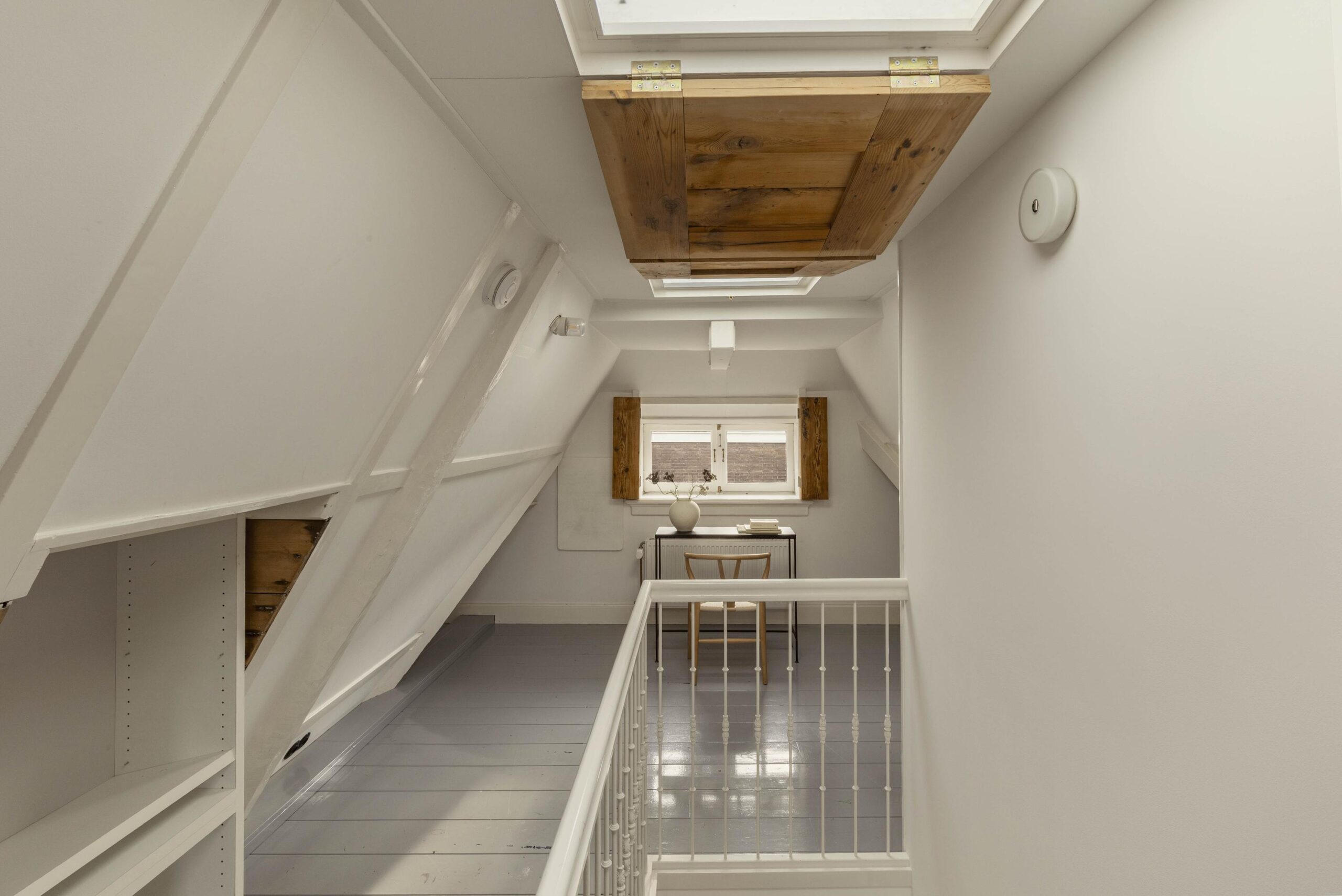 The basement level is fully finished and benefits from generous daylight through several skylights. A fixed staircase leads down to a cellar, which currently serves as a laundry room and houses the technical installations. This level is presently arranged as a second living room and workspace, and includes a second bathroom with walk in shower, bath, wash basin and toilet. Underfloor heating is installed in the basement.