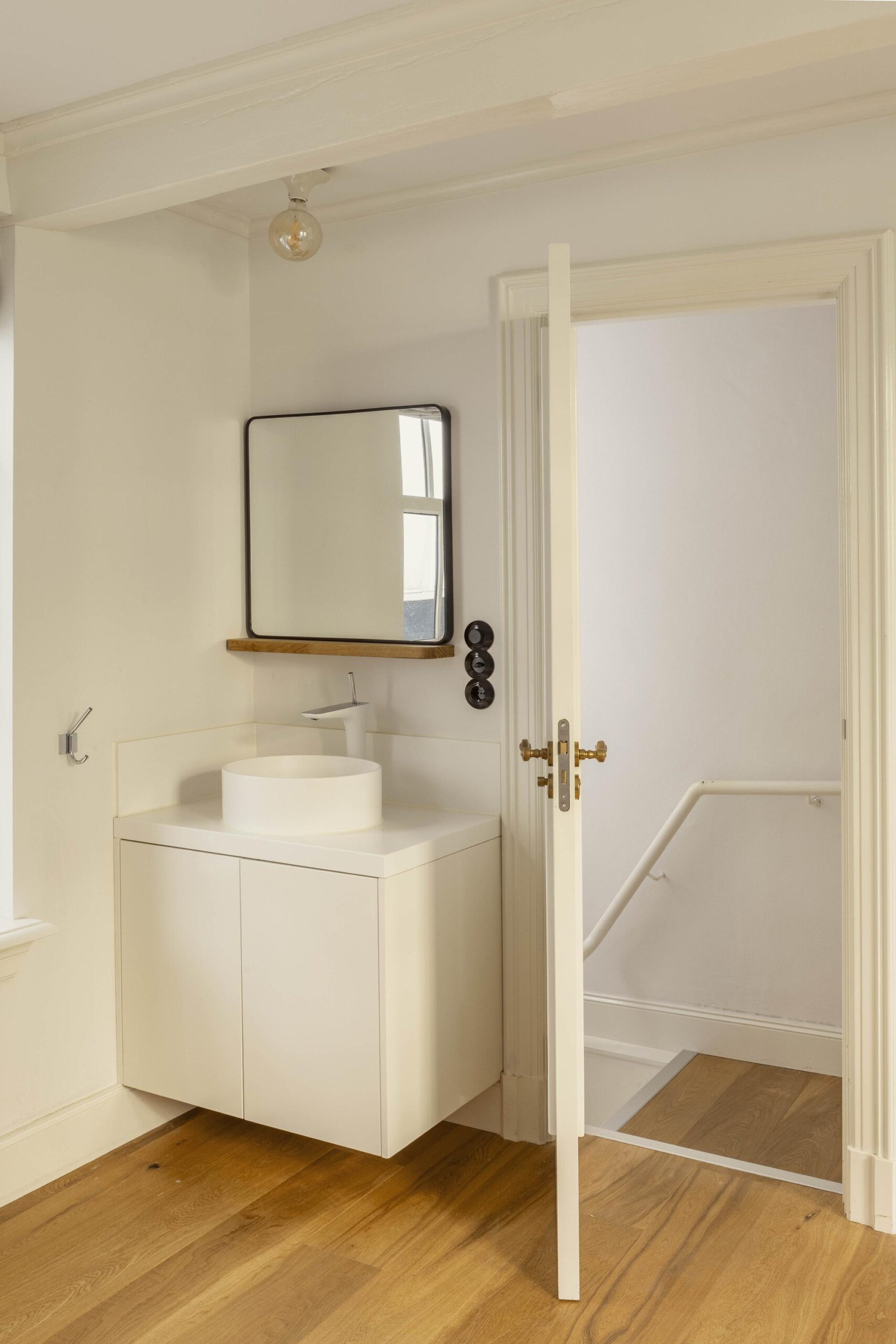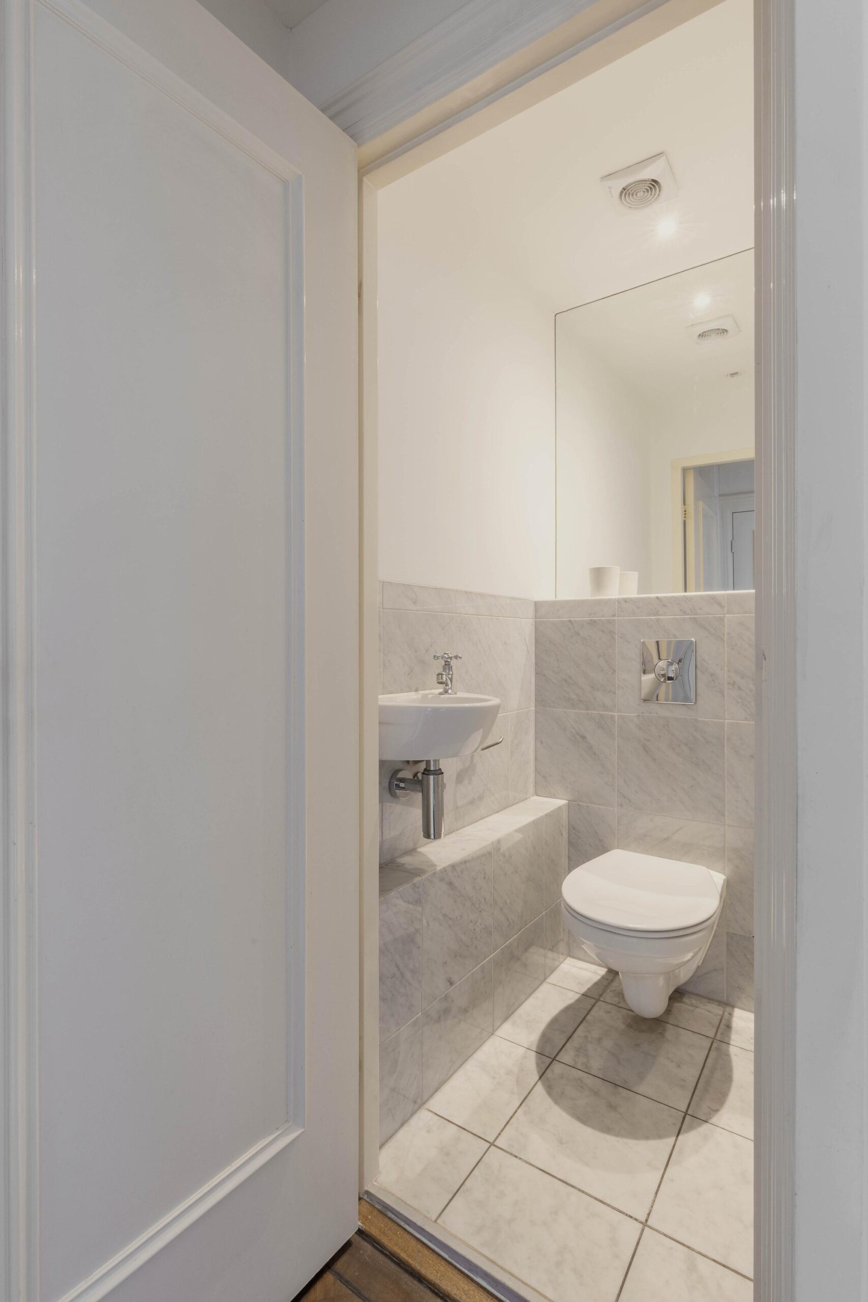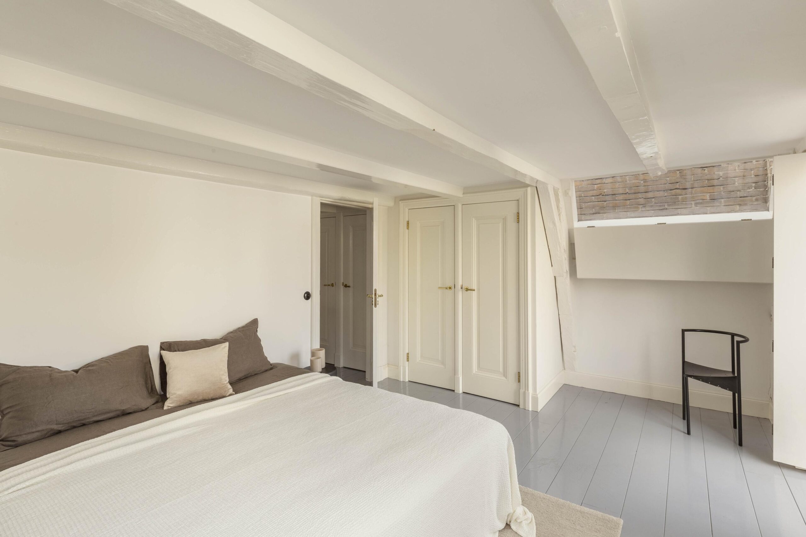 On the second floor you will find two bedrooms with built in wardrobes and a centrally located bathroom. The rear bedroom enjoys views over the terrace; the front bedroom offers views onto the street and canal. The bathroom is fitted with a walk in shower, freestanding bath, wash basin and toilet. This floor retains original panel doors and is laid with a pale blue timber floor.