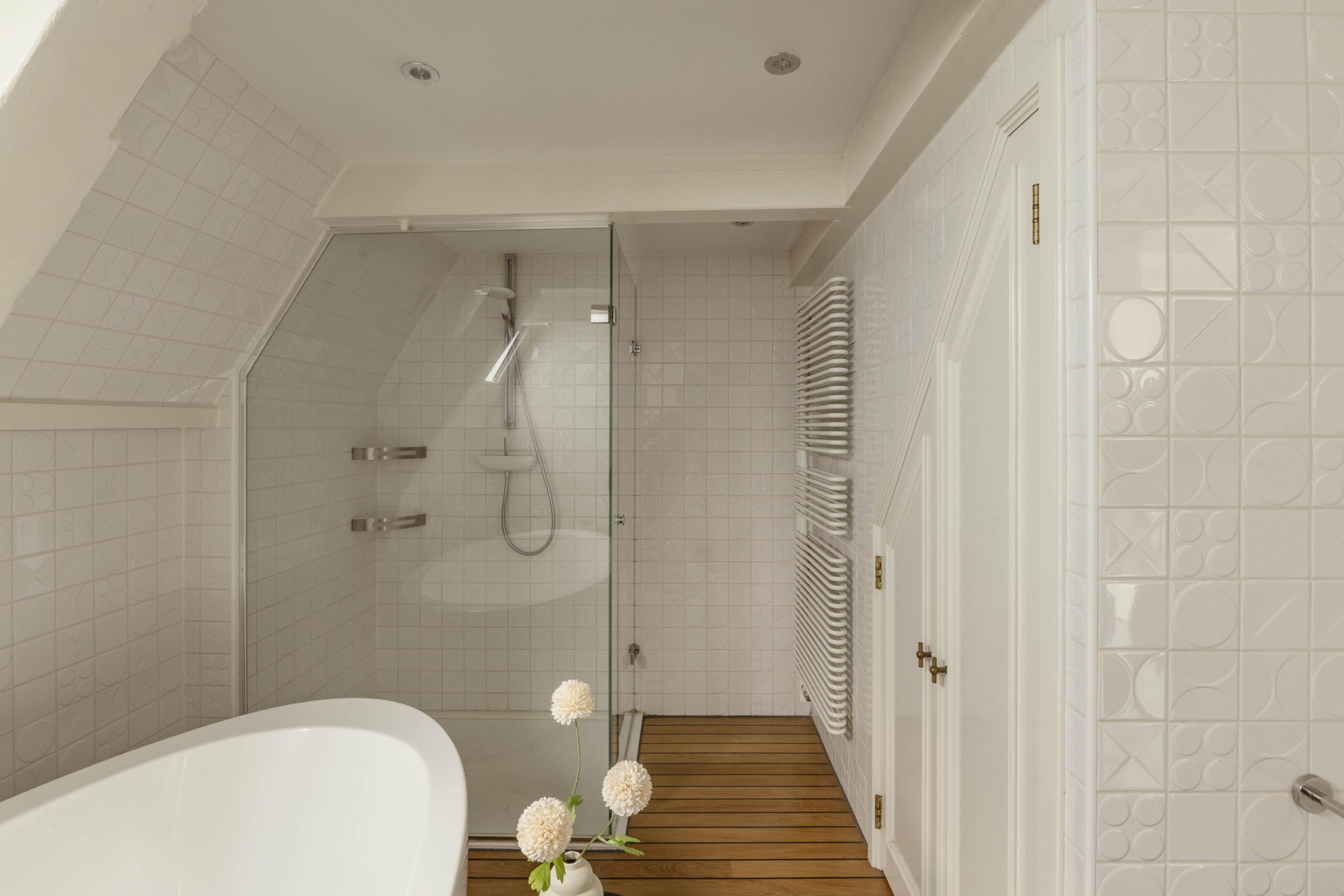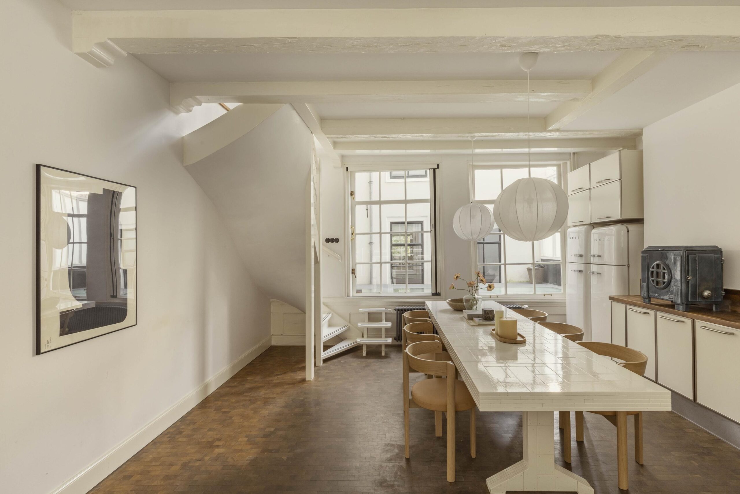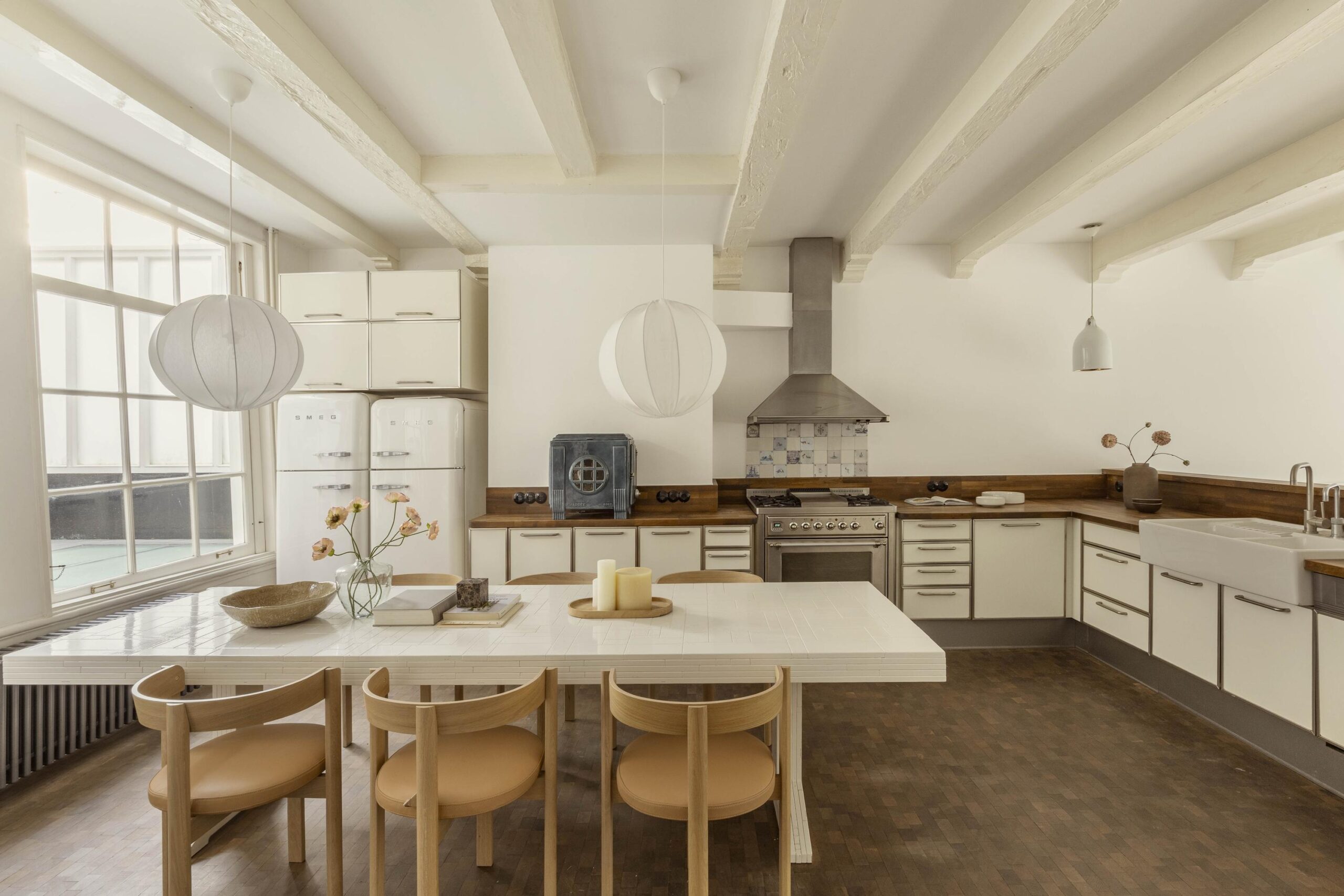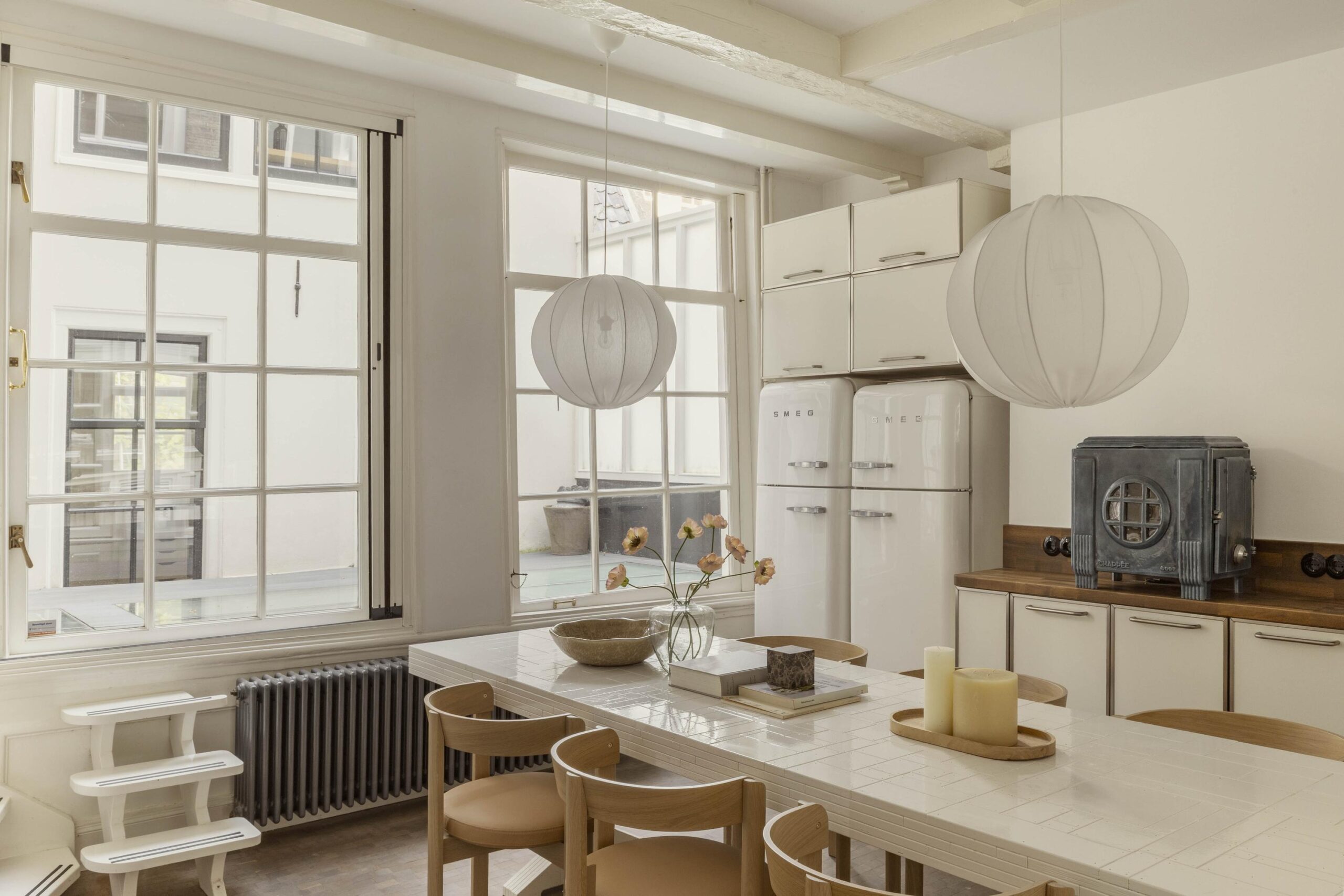 The living kitchen is located half a level up and features high exposed beam ceilings, an authentic cast iron stove and a wooden floor. The kitchen is designed in a corner layout with wooden worktop, double sink with mixer tap and separate Quooker, a Smeg stovetop and a wide oven. The tiled fireplace and blue and white classic tiling reflect the original character of the house. Rear windows provide access to a sheltered patio.