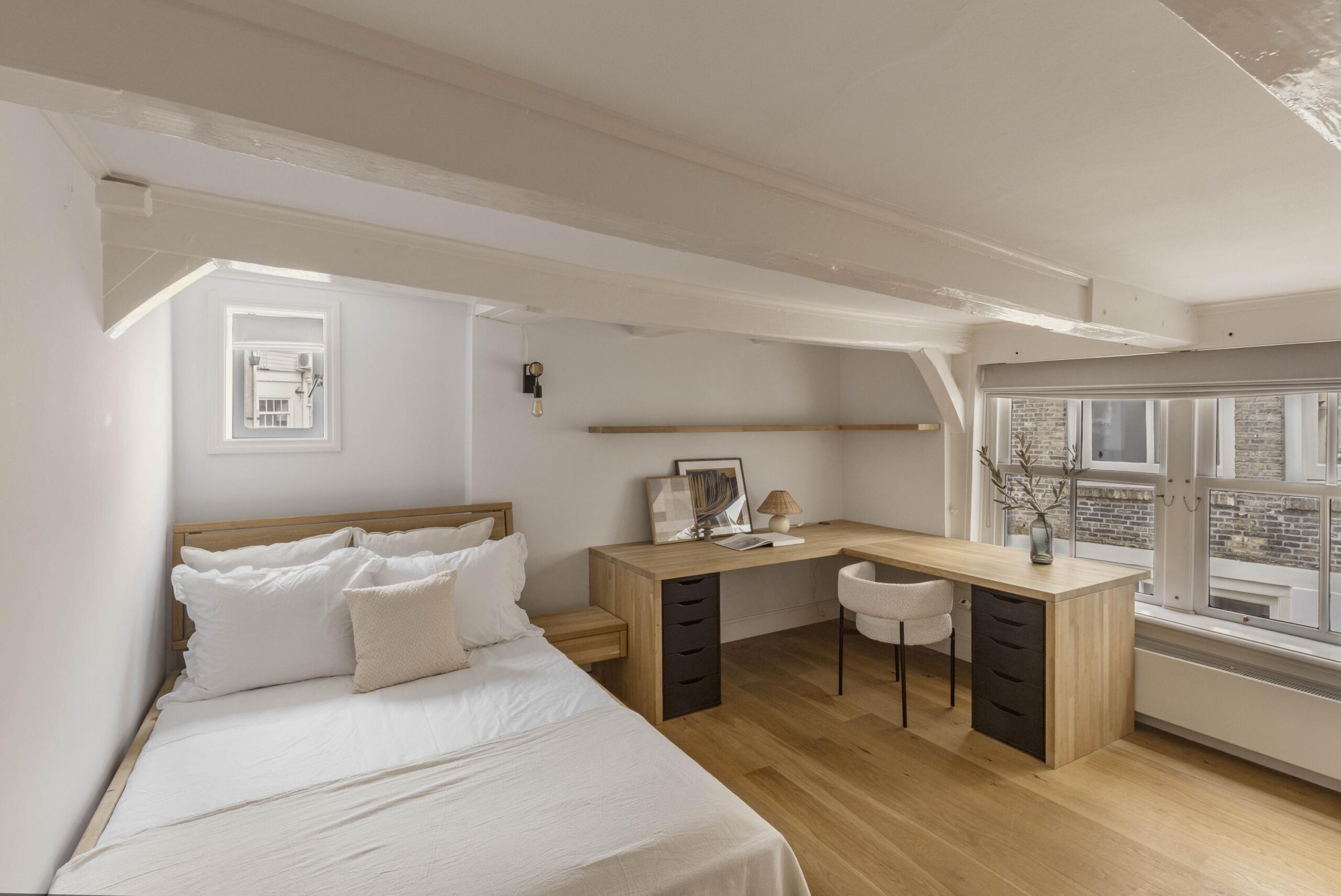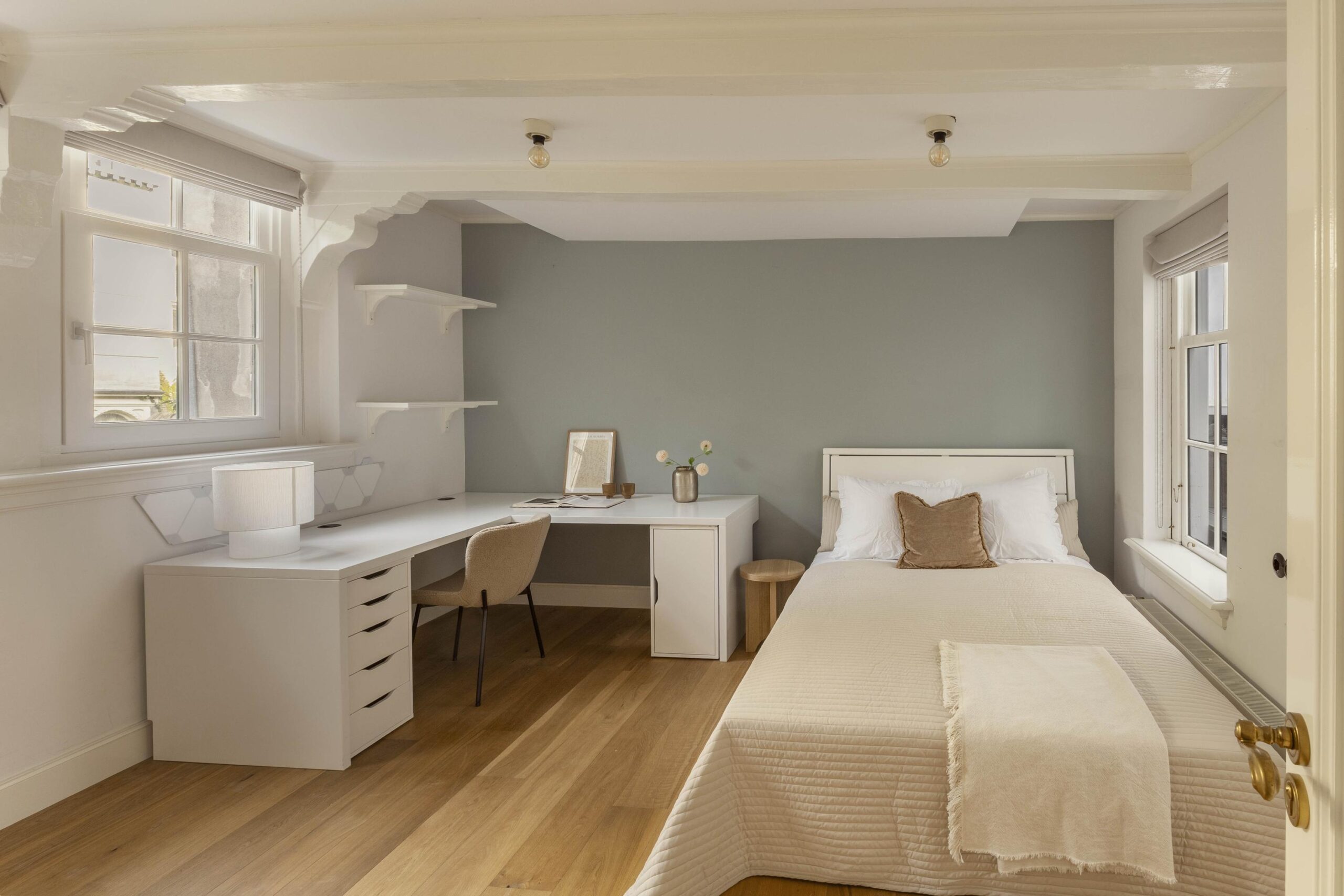 The third floor is arranged as a bedroom, featuring exposed roof structure, built in storage and a separate workspace. With multiple skylights and the same pale blue timber floor, this floor offers a serene, light filled space. There is a wash basin and separate toilet on this floor.