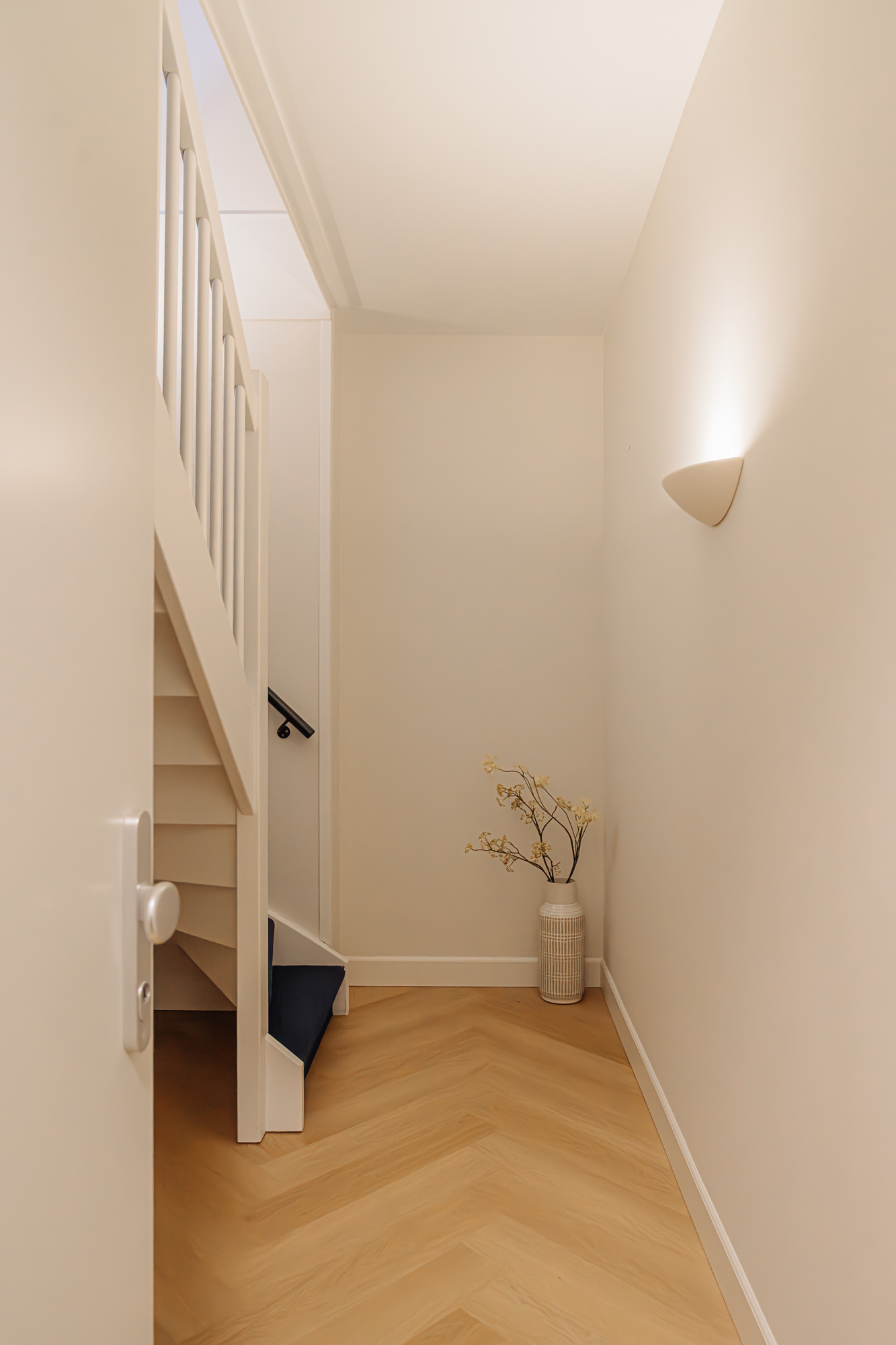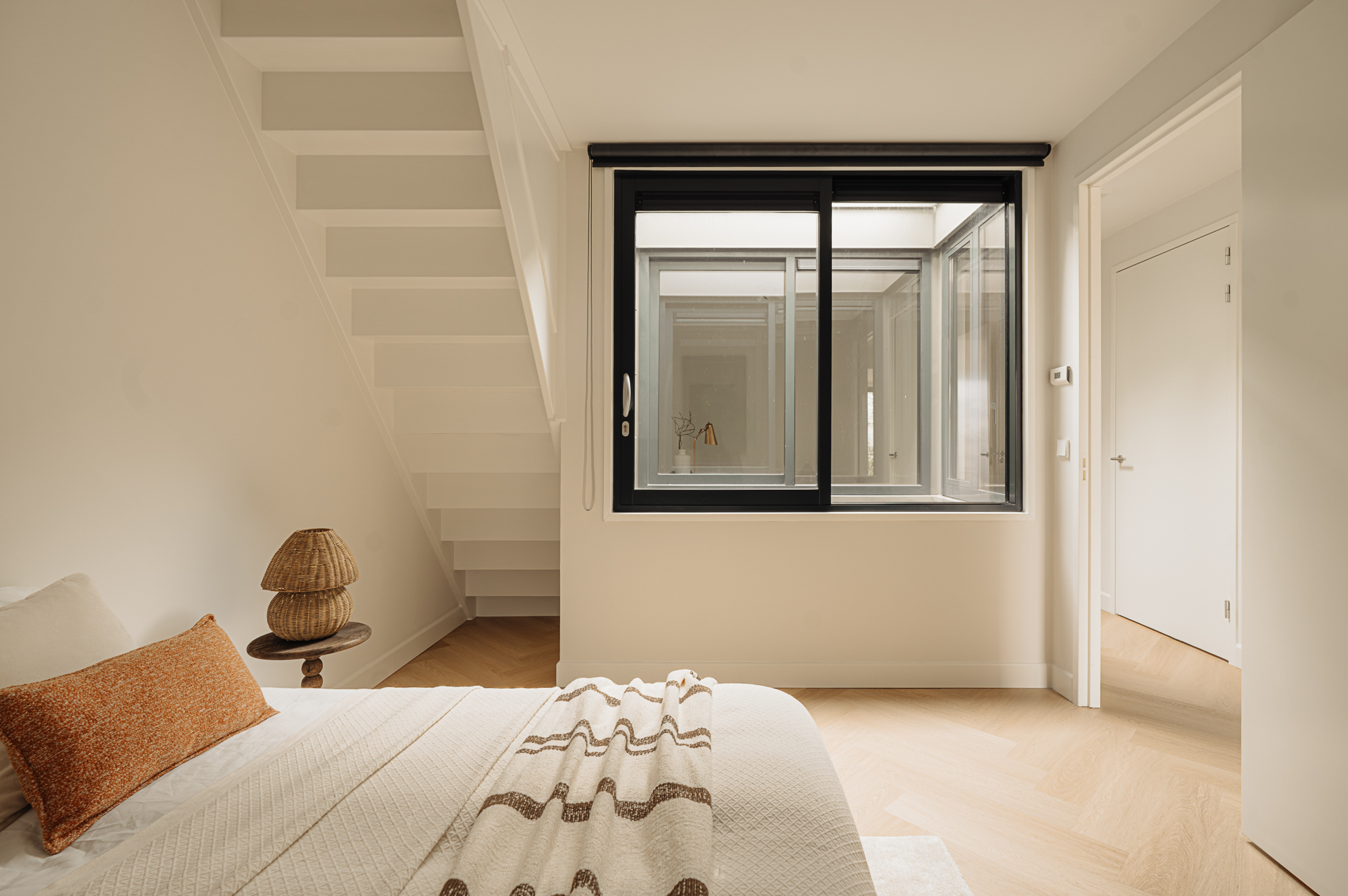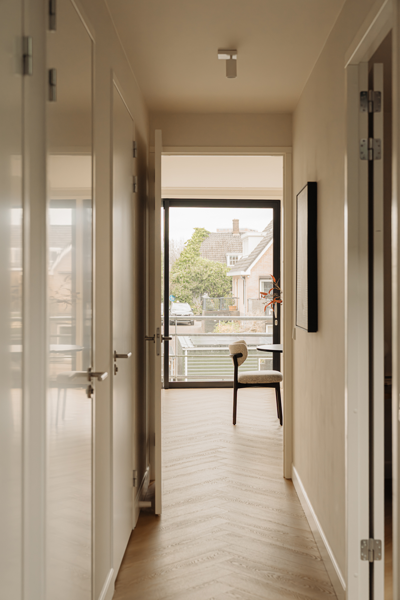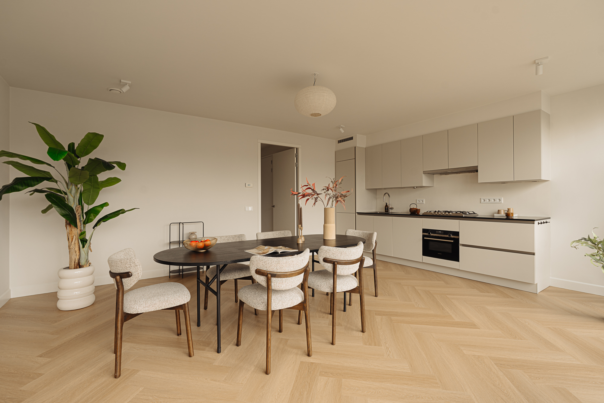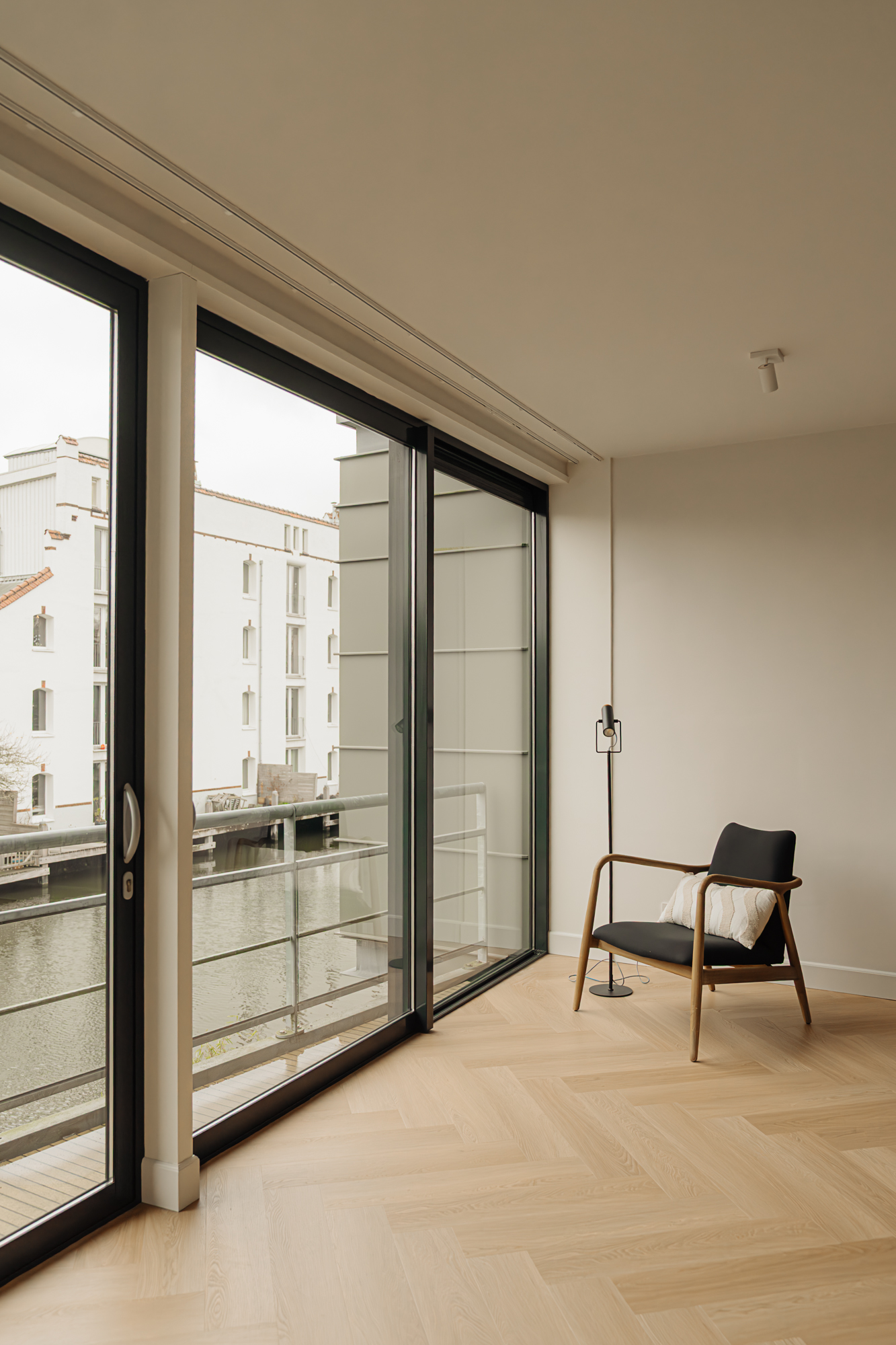 At the front is the sitting room with large windows and French doors leading to the covered south-facing balcony. At the rear is the dining room with an adjoining balcony overlooking the Pereboomsloot. Both spaces have extensive glazing, giving this floor an open and bright feel. The semi-open kitchen features sleek cabinetry and is fully equipped with built-in appliances, including a Quooker, gas hob, integrated extractor, combi oven, fridge and freezer.