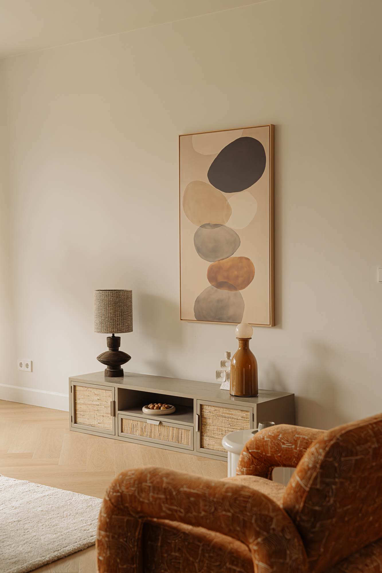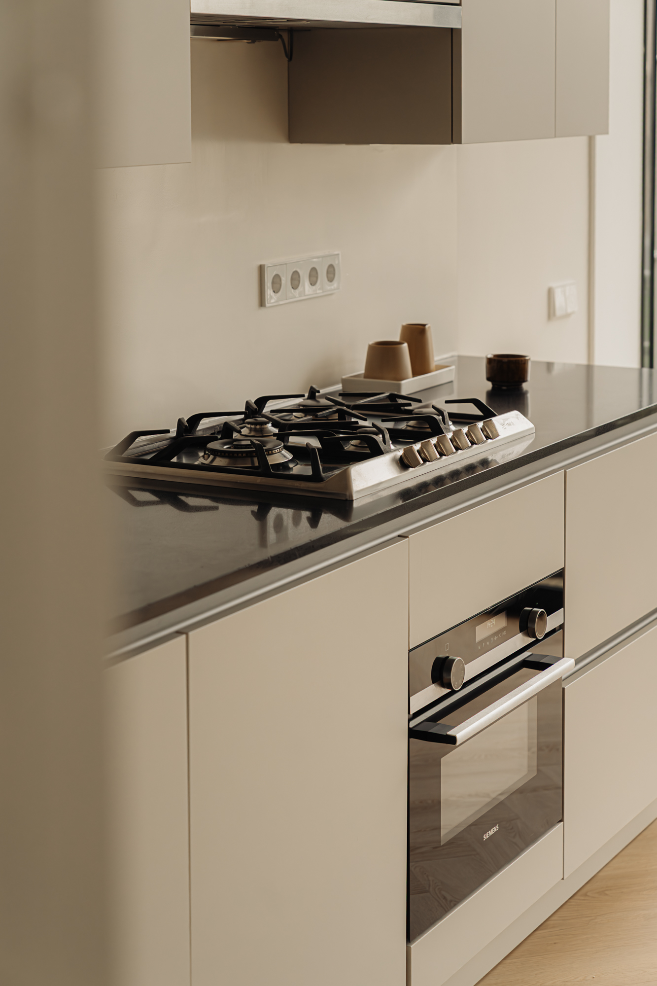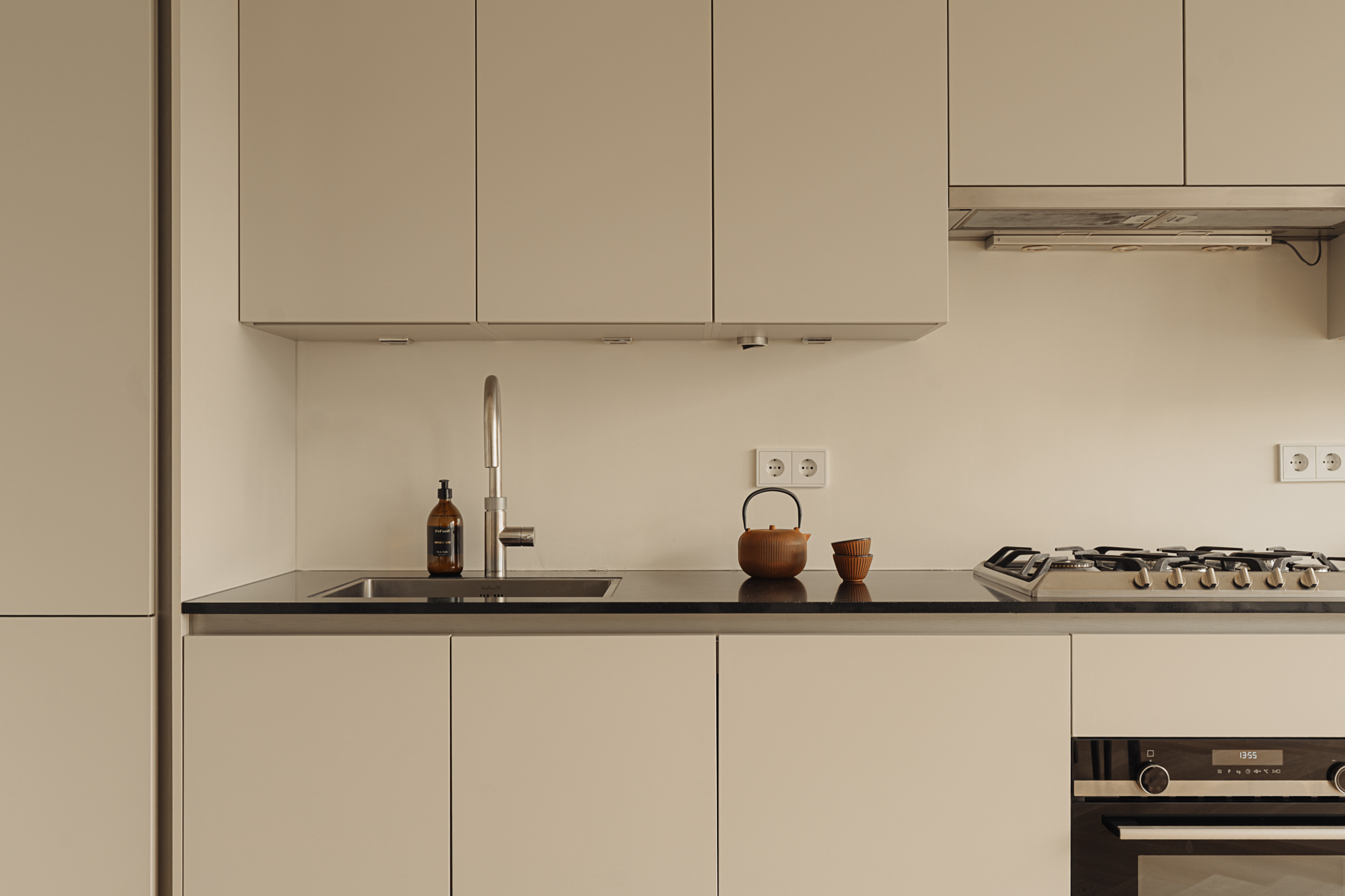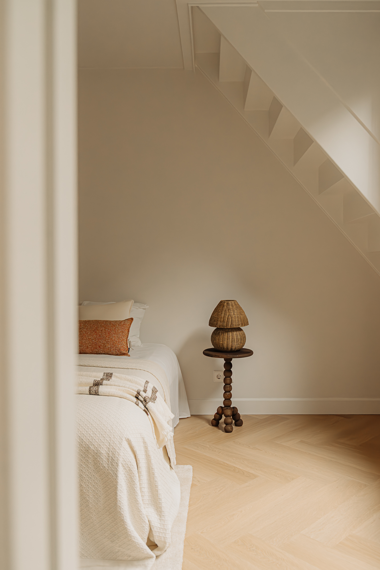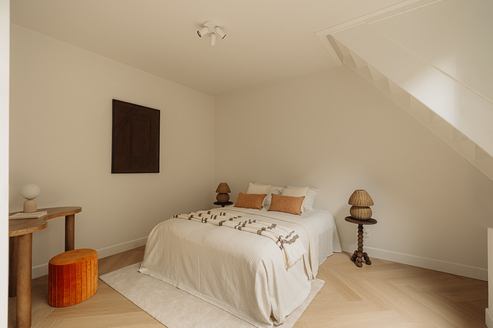 At the front is the sitting room with large windows and French doors leading to the covered south-facing balcony. At the rear is the dining room with an adjoining balcony overlooking the Pereboomsloot. Both spaces have extensive glazing, giving this floor an open and bright feel. The semi-open kitchen features sleek cabinetry and is fully equipped with built-in appliances, including a Quooker, gas hob, integrated extractor, combi oven, fridge and freezer.