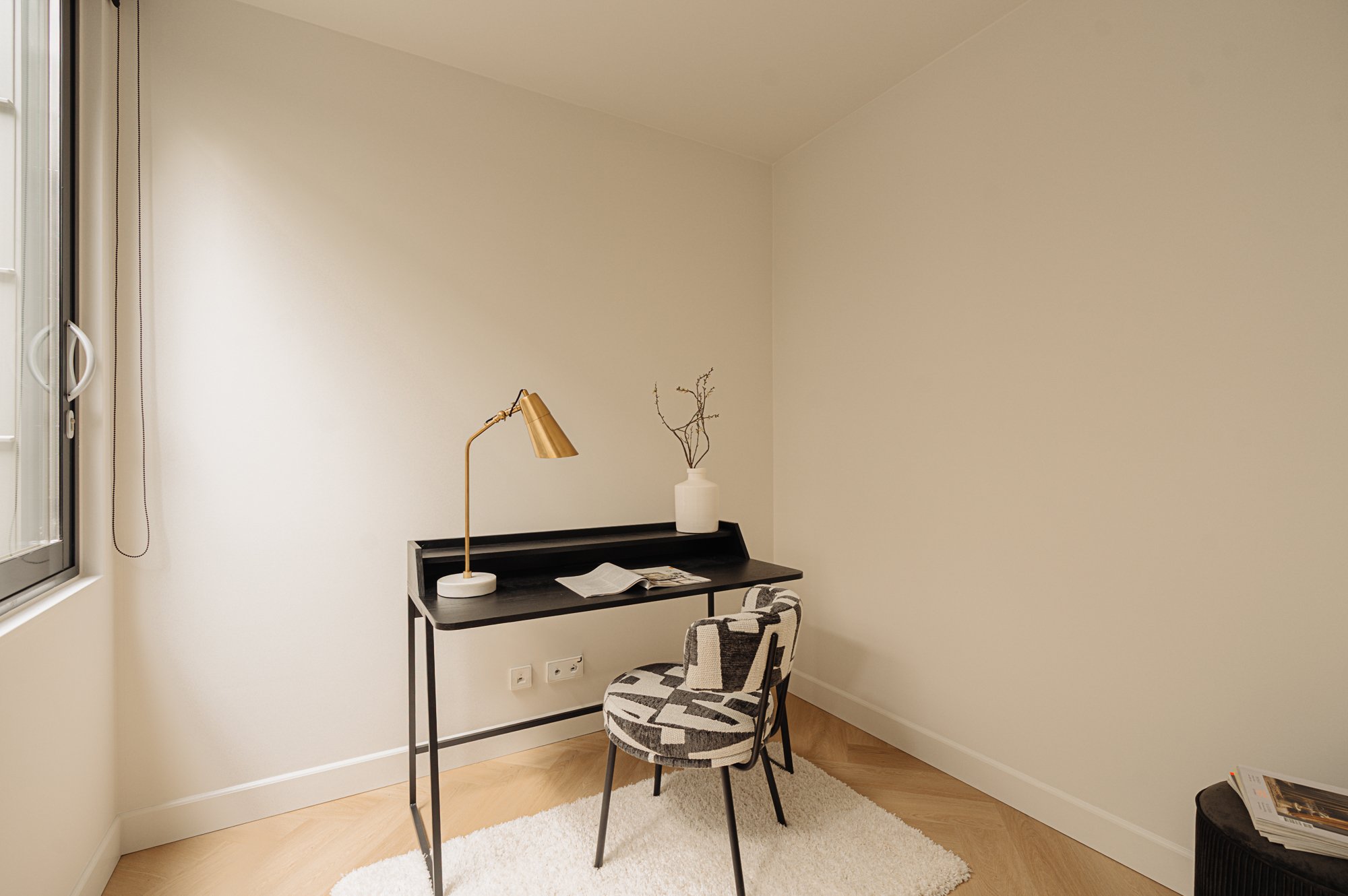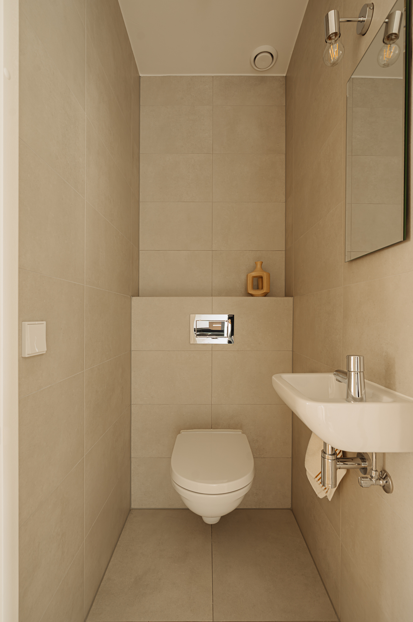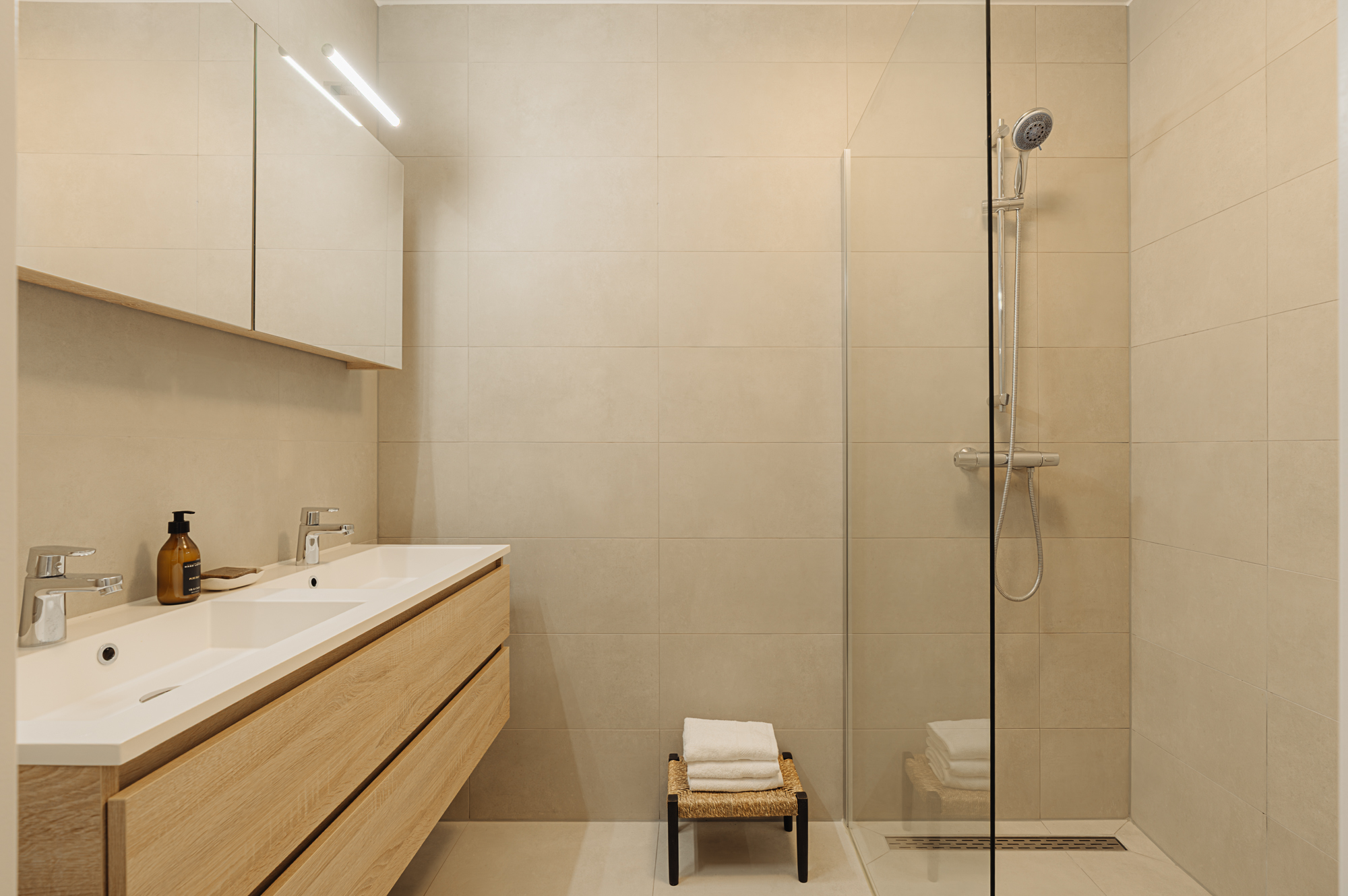 Centrally located within the apartment are two rooms with large windows facing the lightwell, as well as the bathroom. The larger room is suitable as a bedroom with space for a double bed and wardrobe. The second room is slightly more compact and works well as a study, children’s room, guest room or dressing room. The bathroom is finished in neutral tones and fitted with a walk-in rain shower and vanity unit. On this floor there are also two separate toilets and a spacious technical room, which can also serve as a laundry room and storage space.