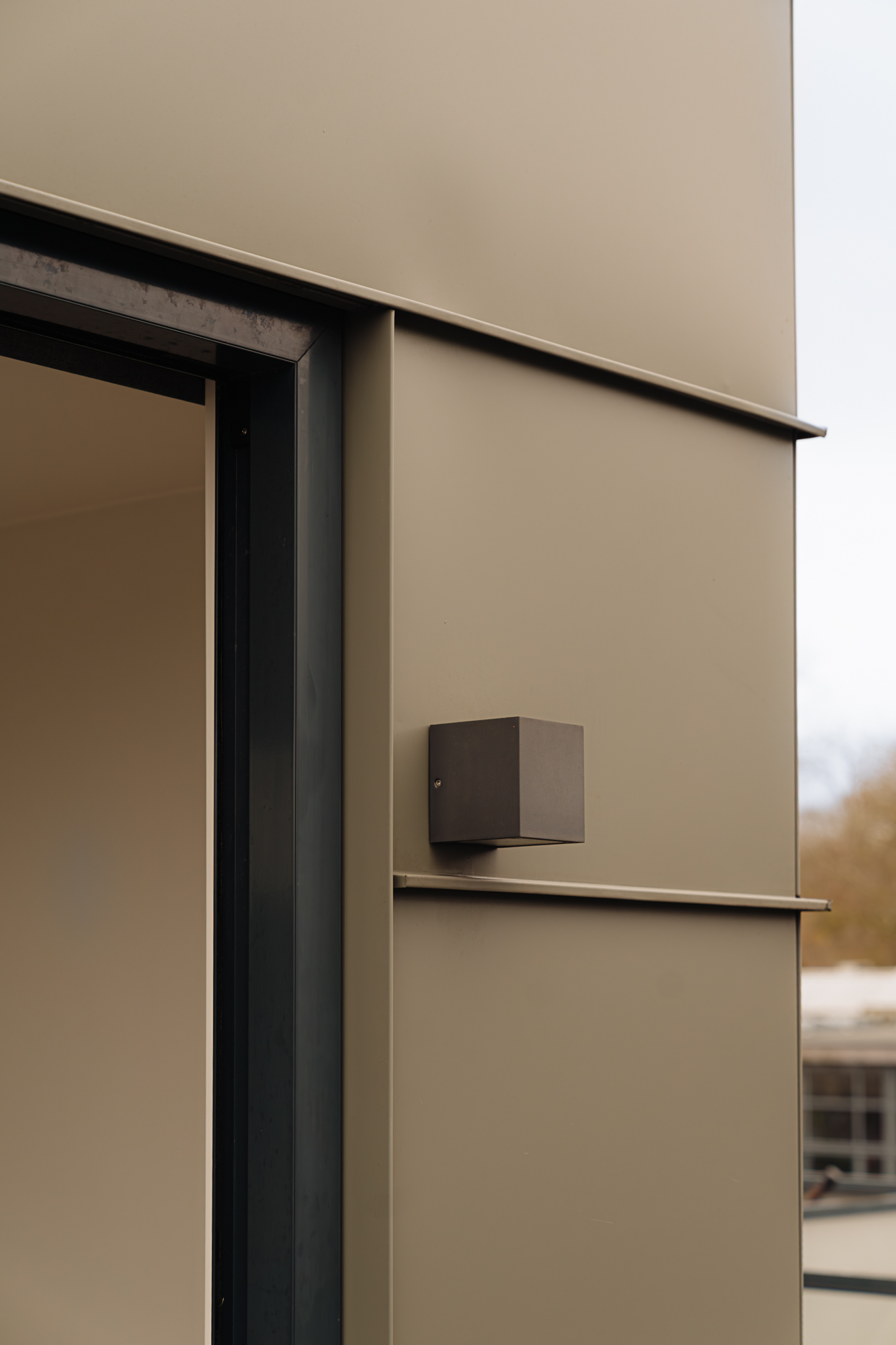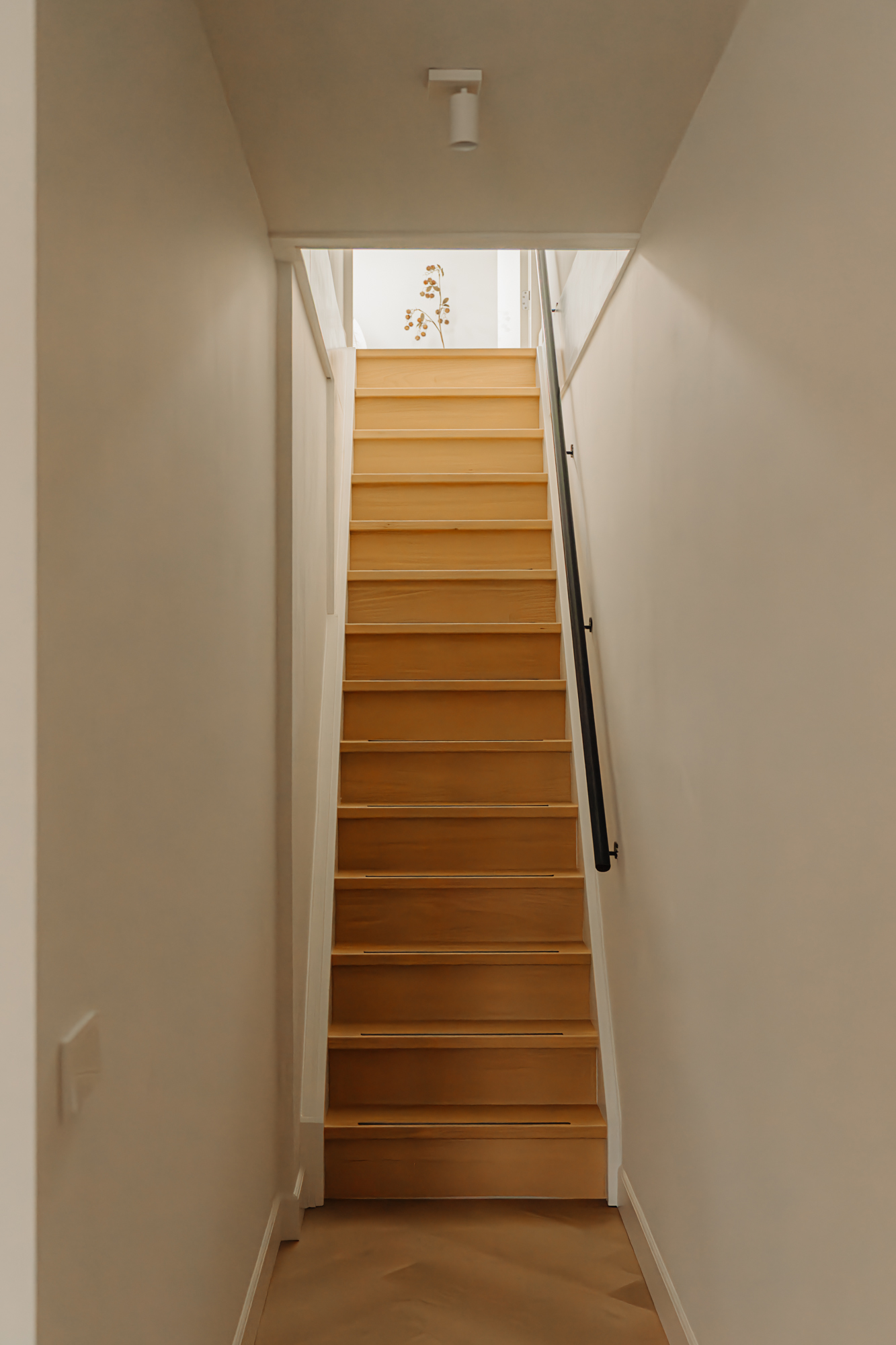 A fixed staircase in the sitting room leads to the top floor. Here you will find a multifunctional room with direct access to the roof terrace. The terrace is well positioned and enjoys sun throughout the day. Thanks to its corner location, it offers plenty of privacy and views over the surrounding rooftops and woodland.