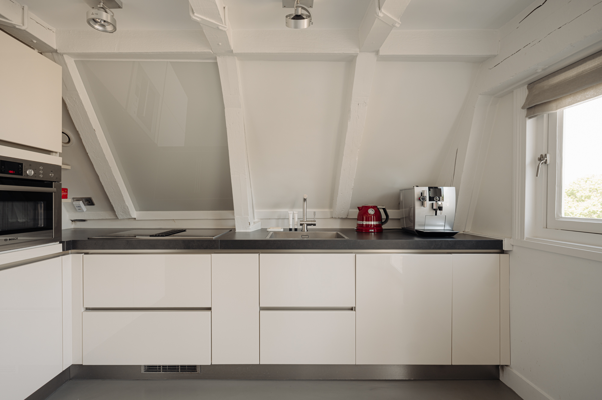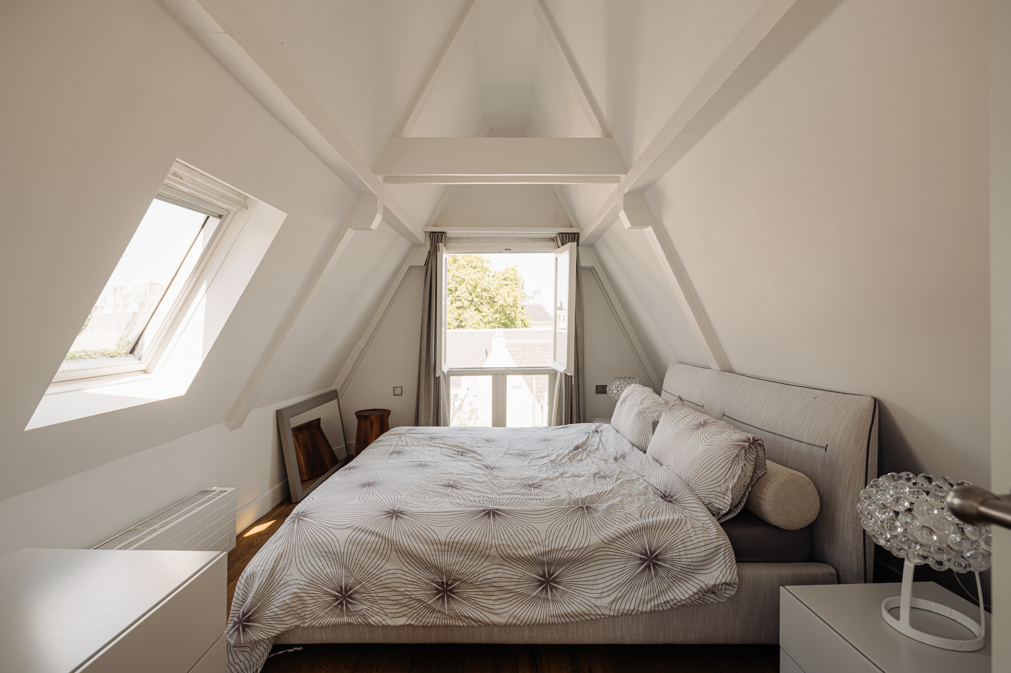 The charming living room is situated at the front, overlooking the canal, with large windows that provide plenty of natural light and picturesque views of the Prinsengracht. The open kitchen is fitted with built-in appliances and includes a washing machine that is integrated into the cabinetry. The space is stylishly furnished and offers ample storage. The visible wooden beam ceilings throughout the apartment add to its authentic and charming atmosphere.