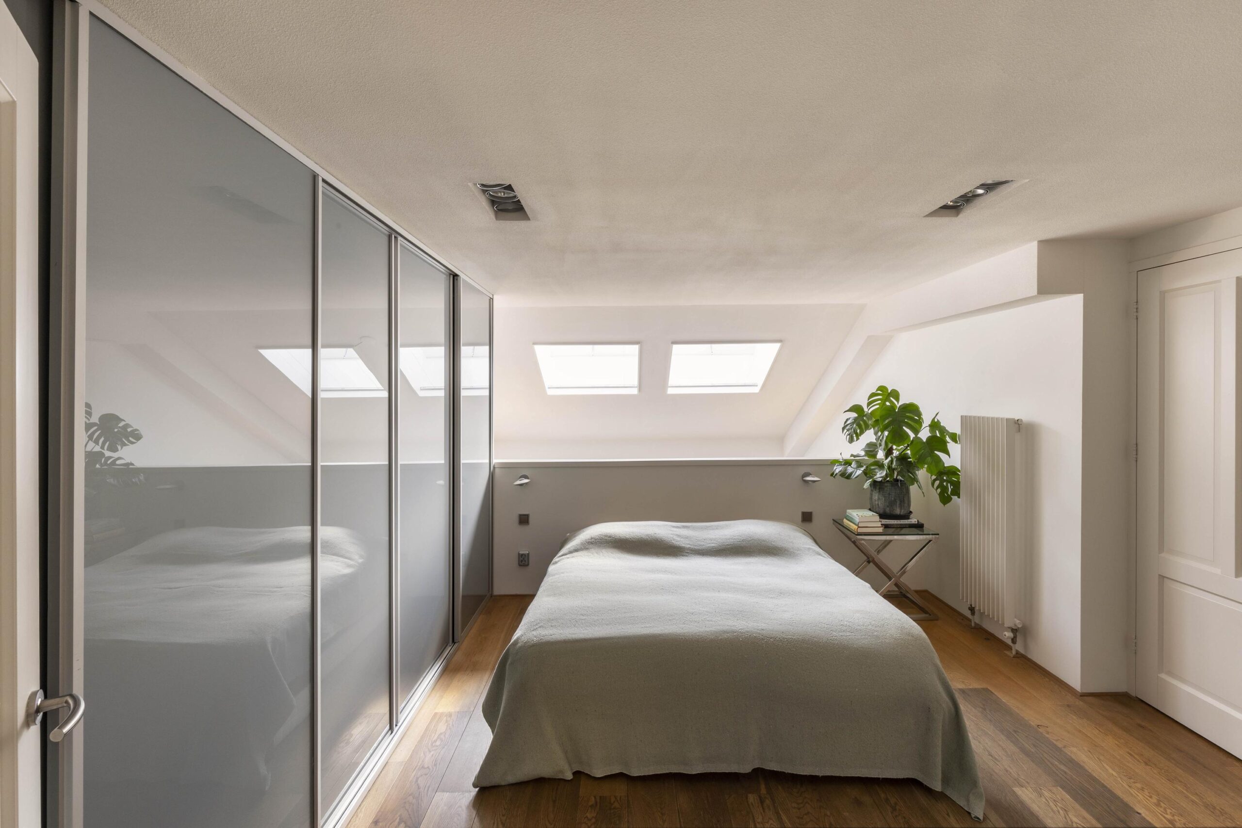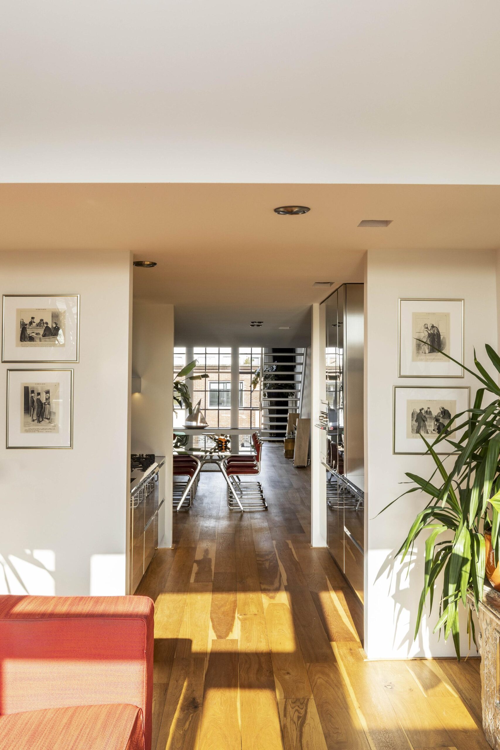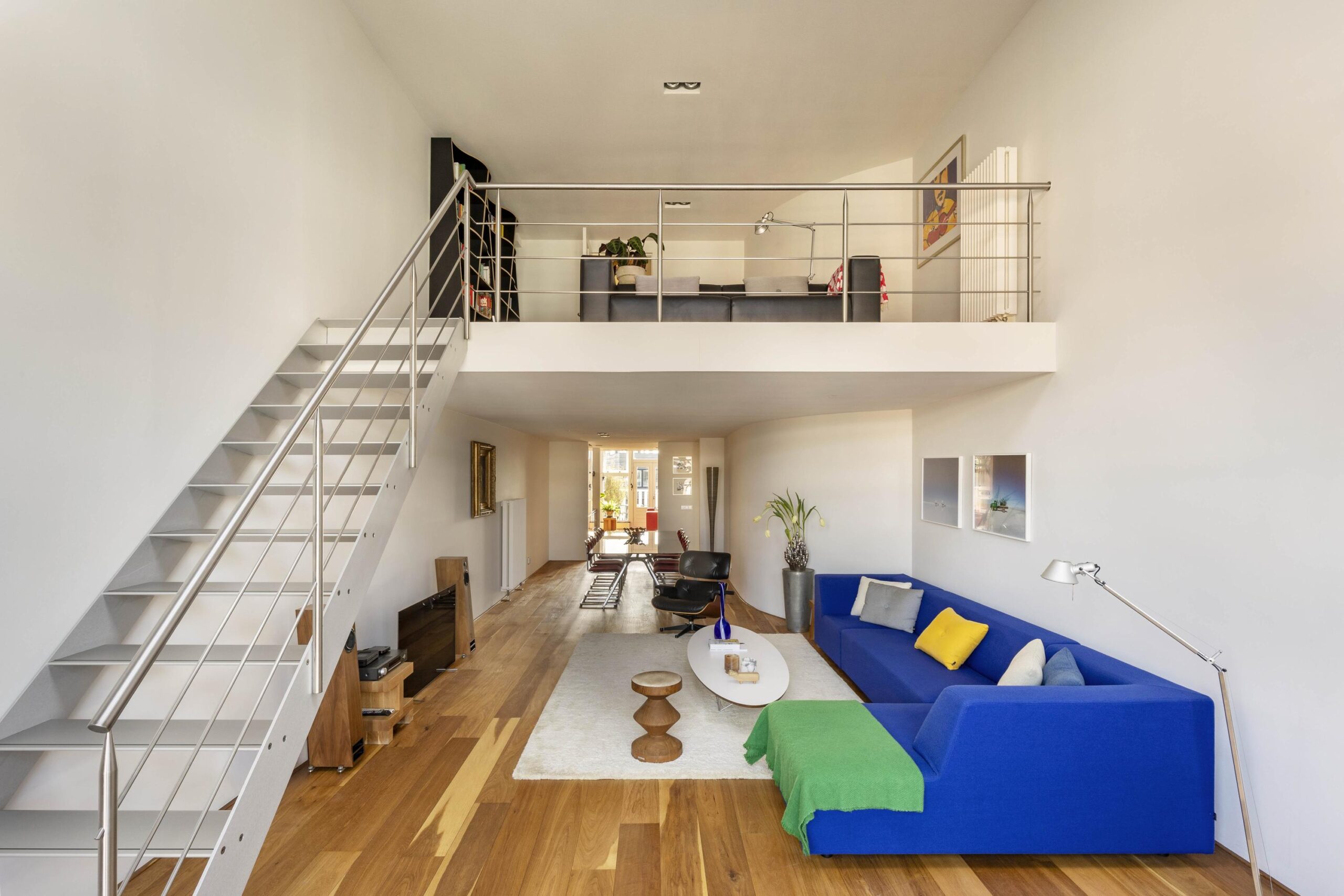 The loft is accessed via the monumental entrance and spacious stairwell or by lift. The generous living room is located at the front, immediately distinguished by the large windows. The exclusive stainless-steel Arclinea kitchen is fully equipped with high-quality built-in appliances, including a Quooker, and offers ample workspace and storage.