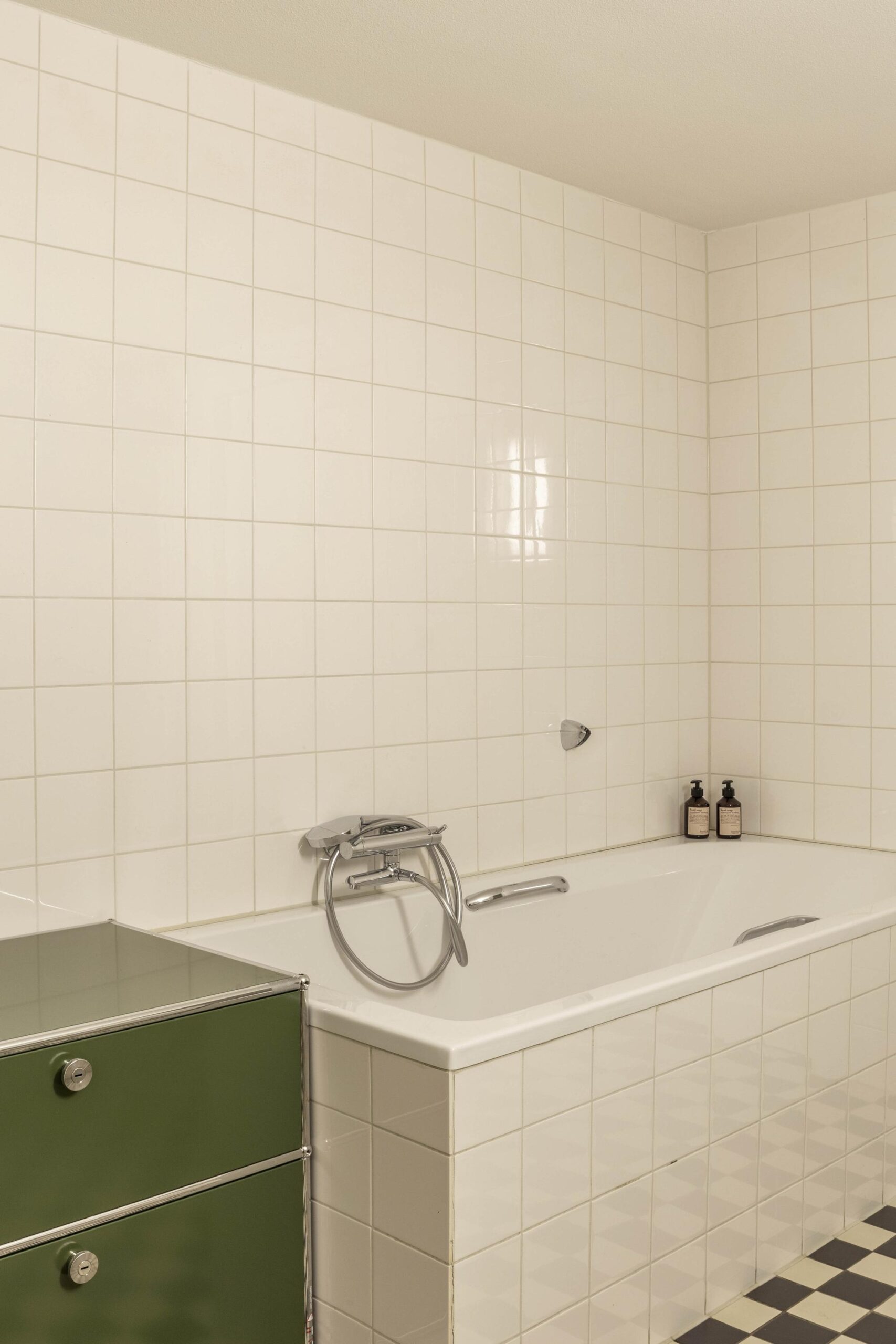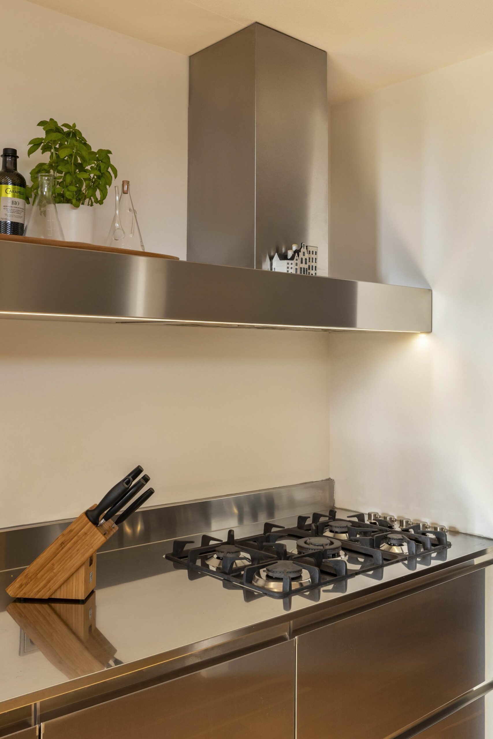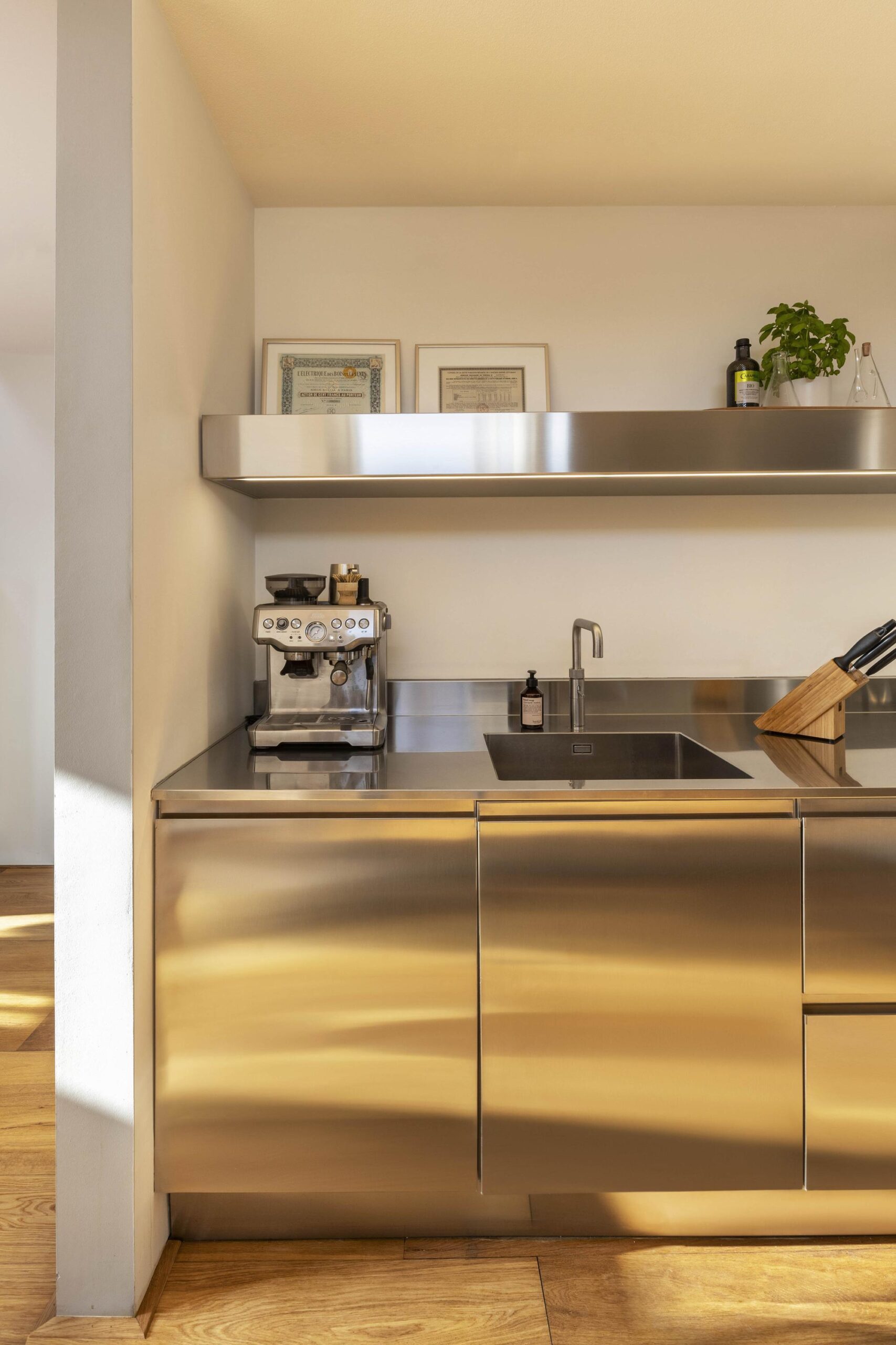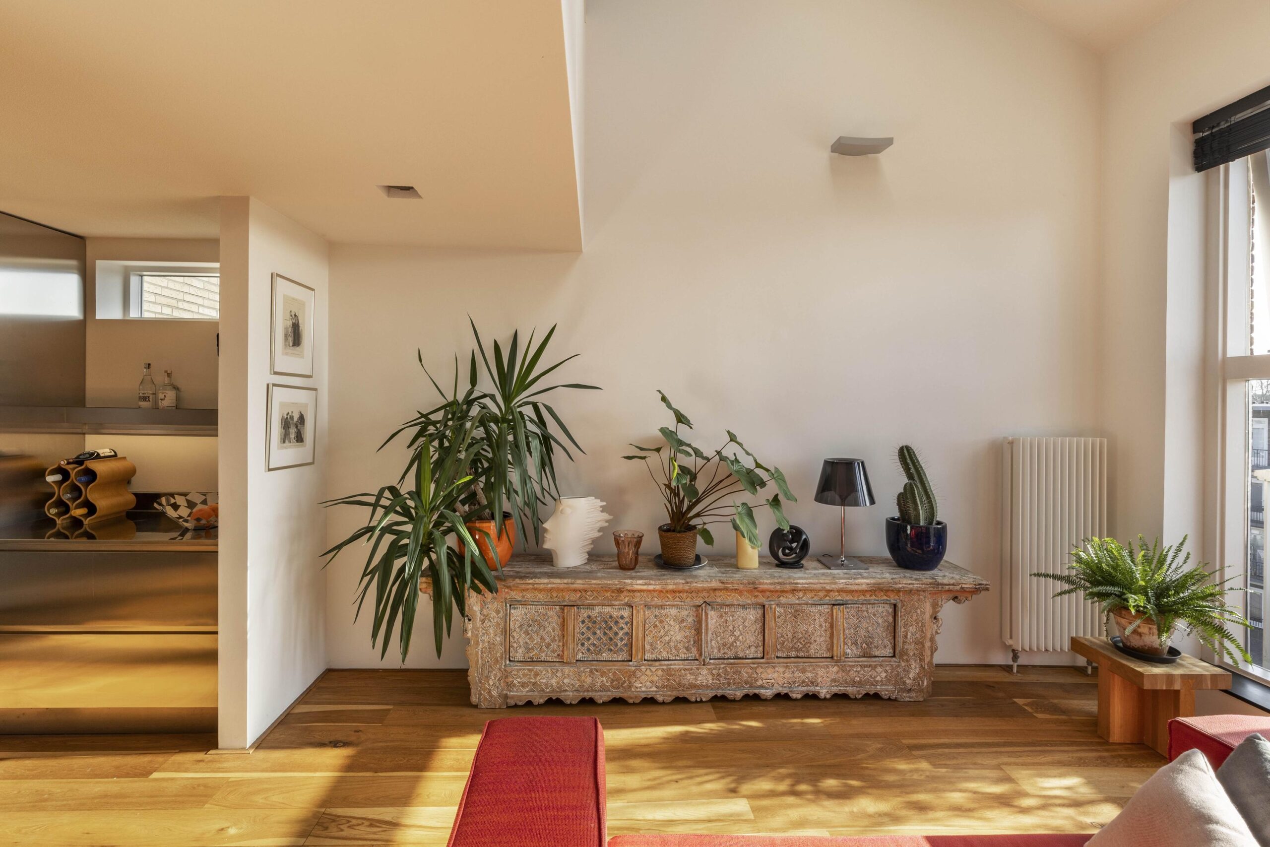 The loft is accessed via the monumental entrance and spacious stairwell or by lift. The generous living room is located at the front, immediately distinguished by the large windows. The exclusive stainless-steel Arclinea kitchen is fully equipped with high-quality built-in appliances, including a Quooker, and offers ample workspace and storage.