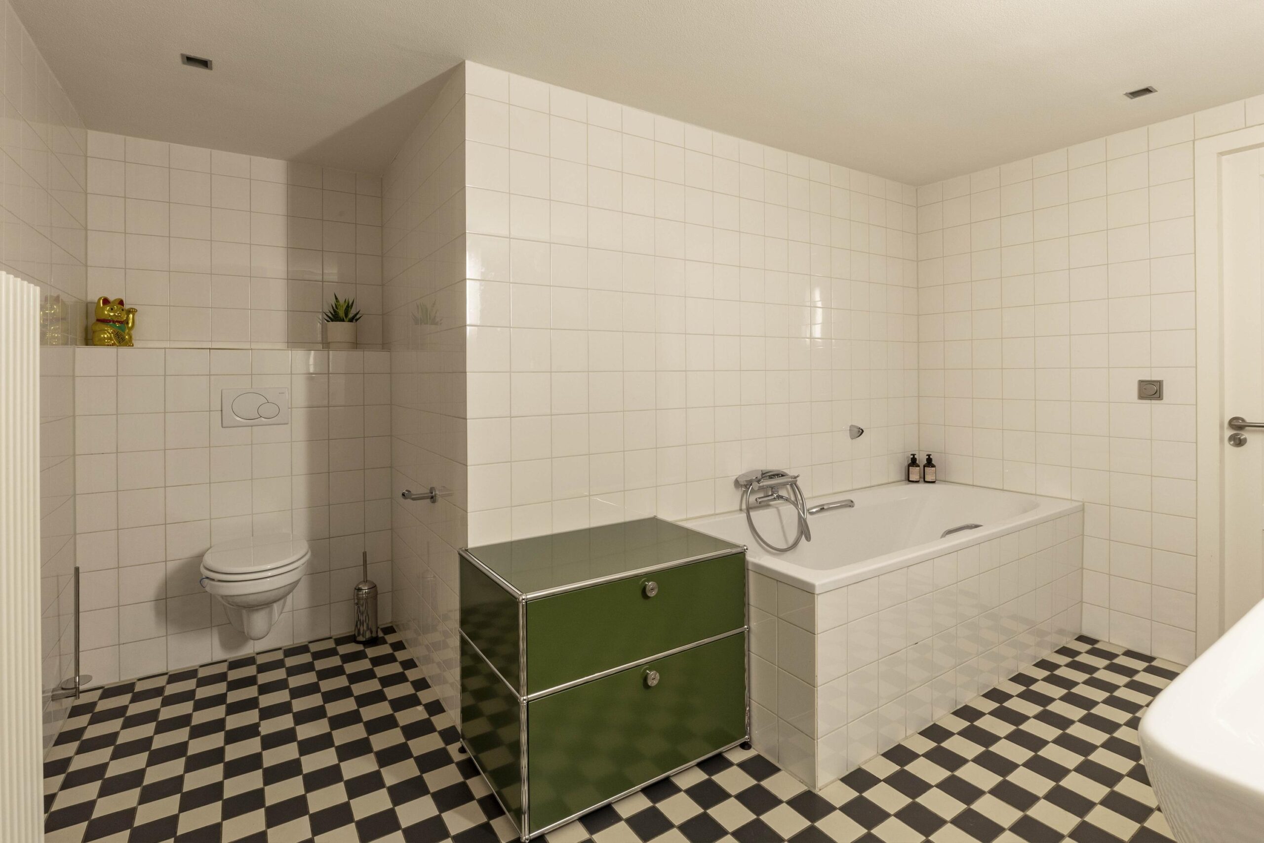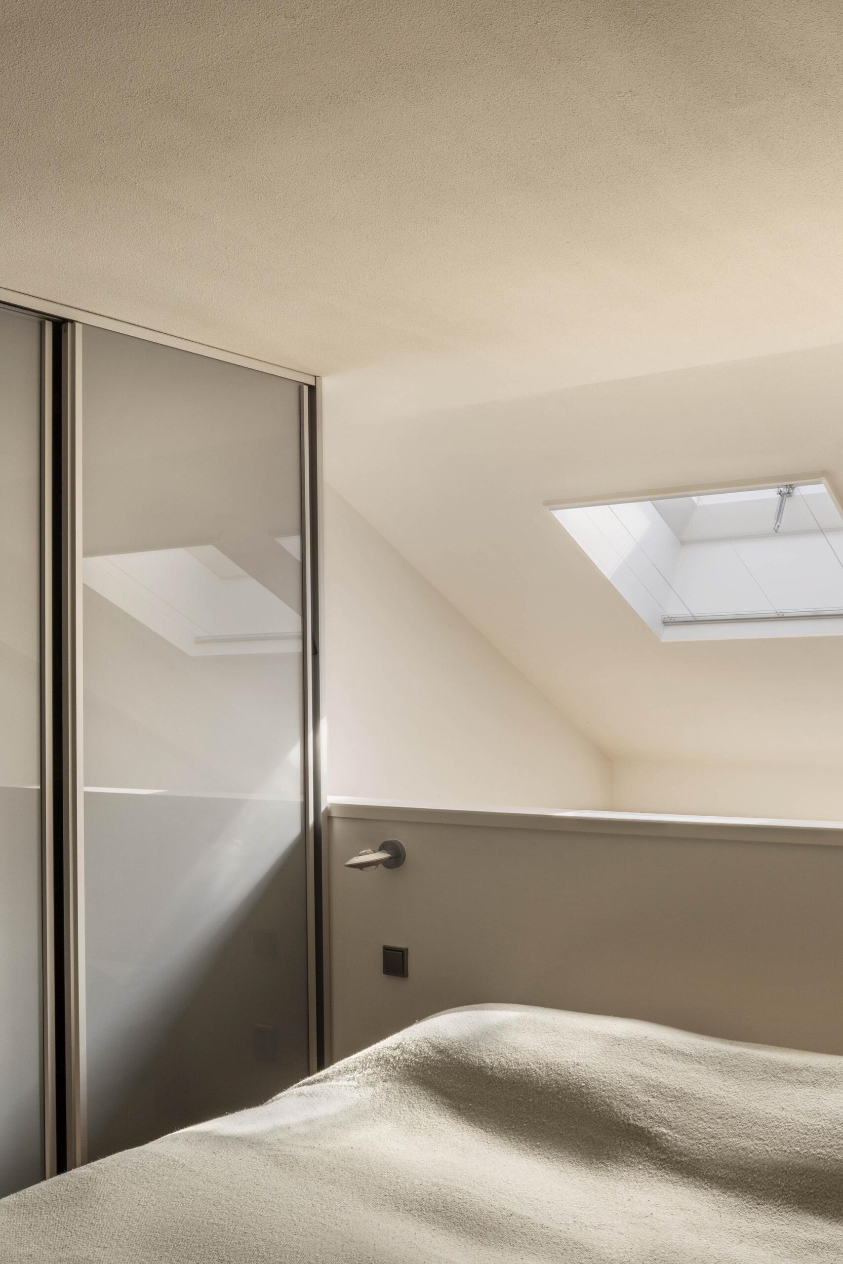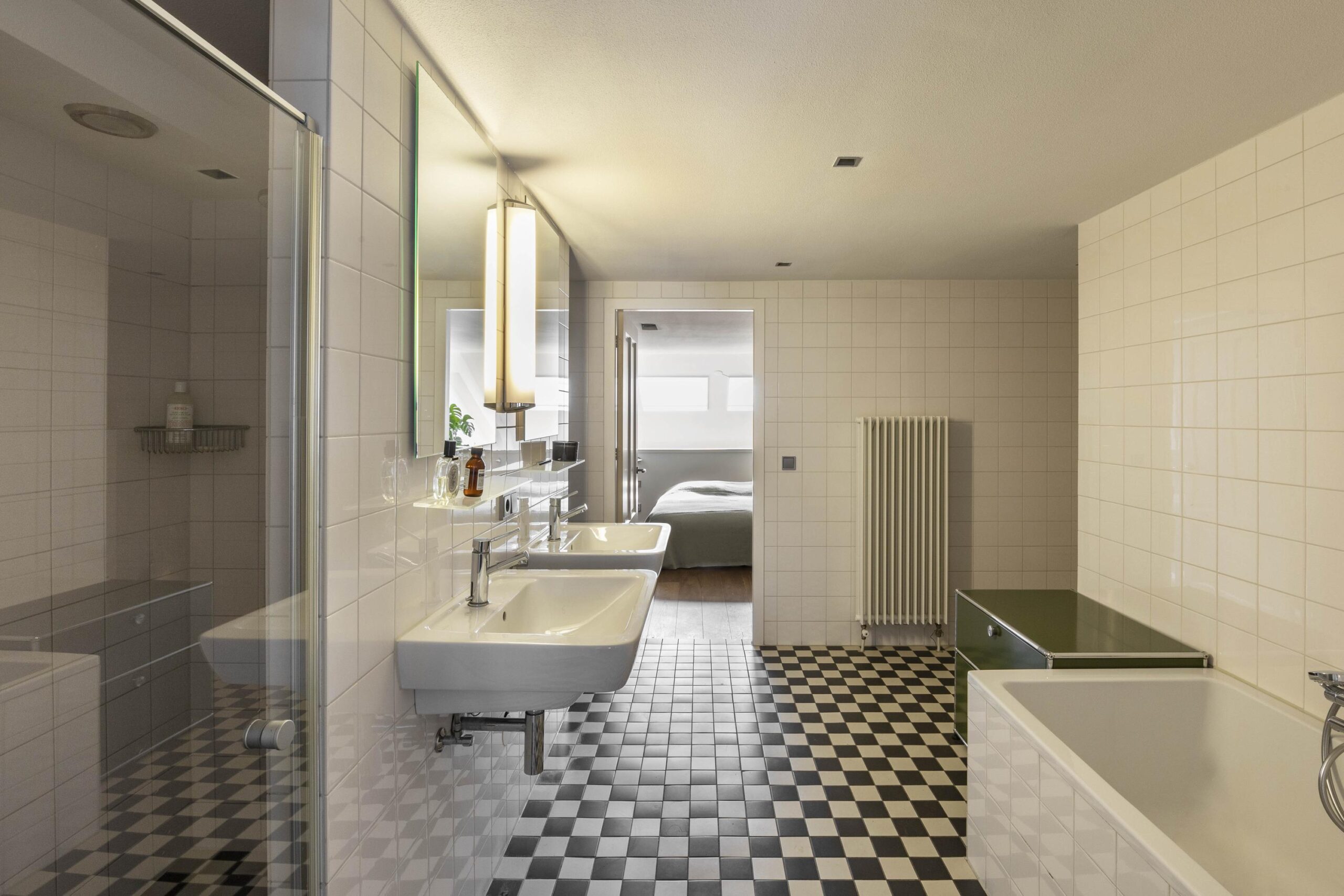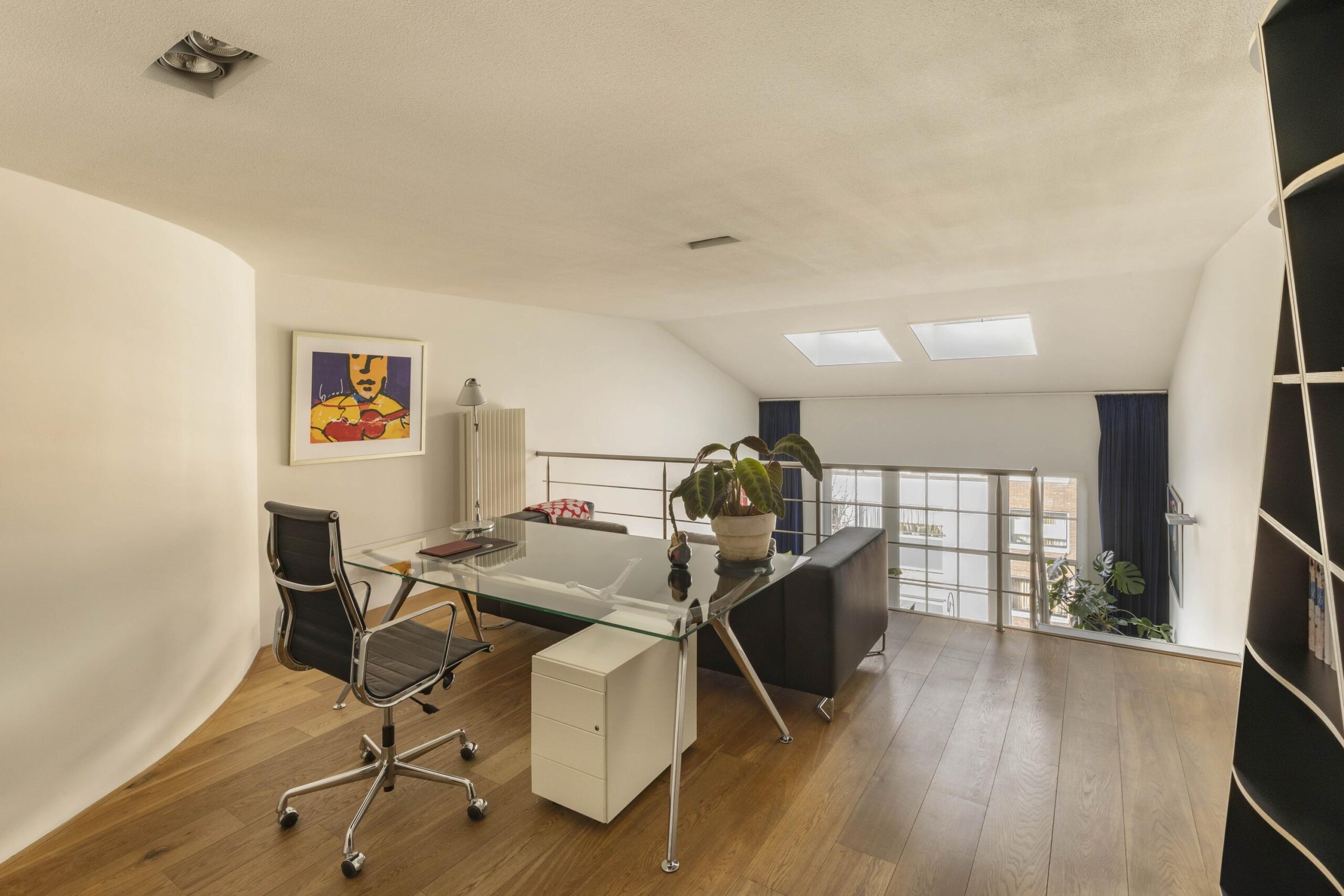 A striking metal staircase in the living room leads to the upper floor. Here are two rooms, one of which is currently used as an office. The rooms are connected by a spacious bathroom with a bathtub, walk-in shower, double washbasin and toilet.