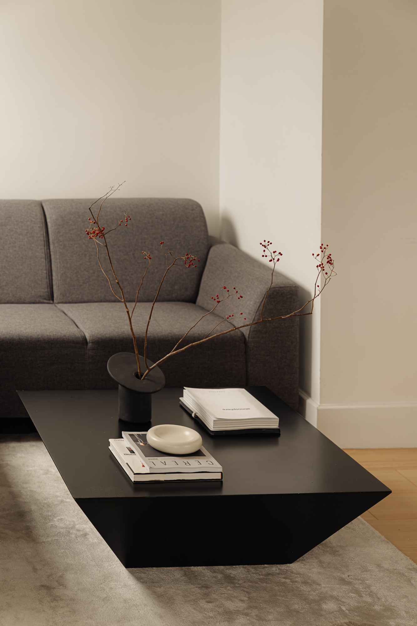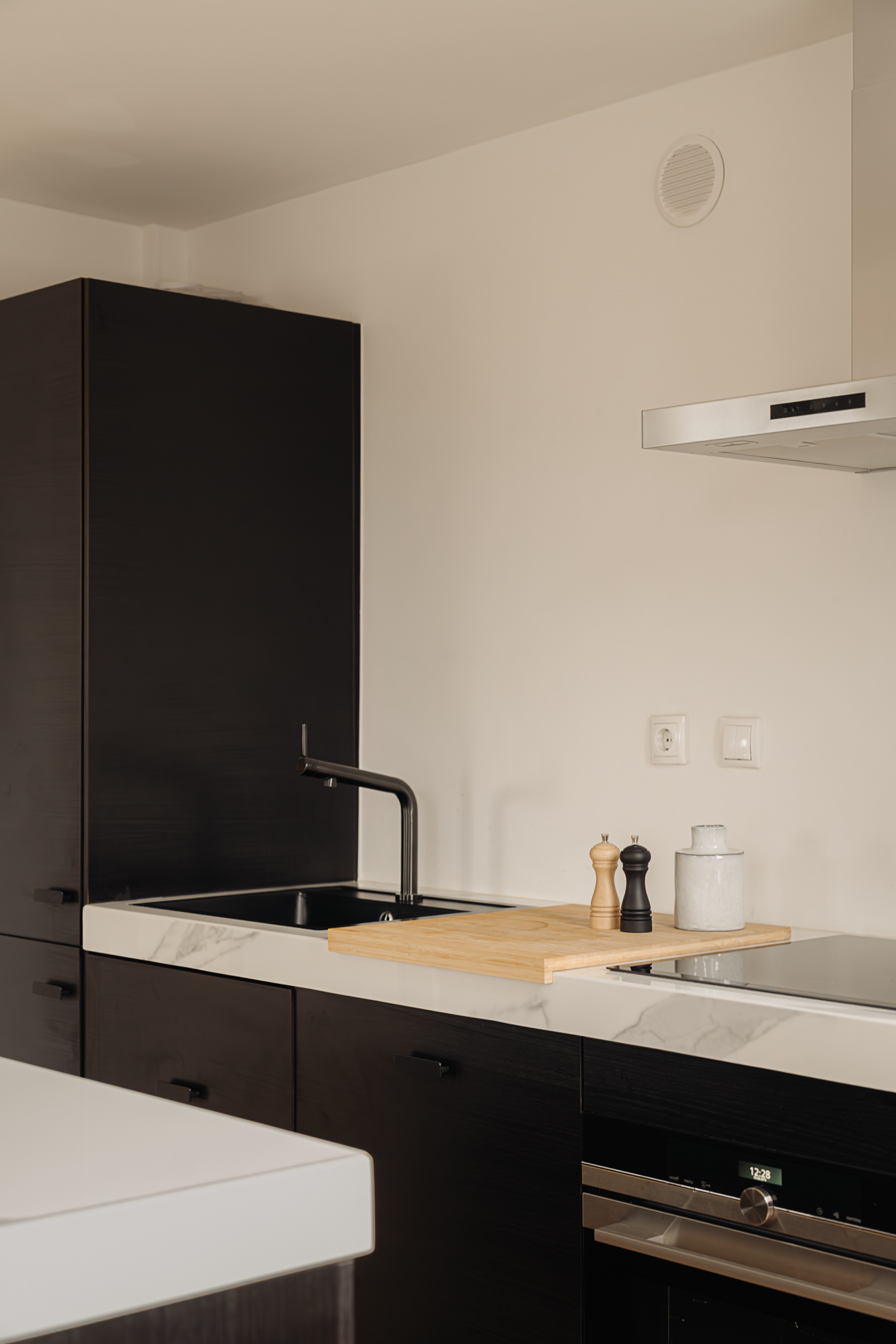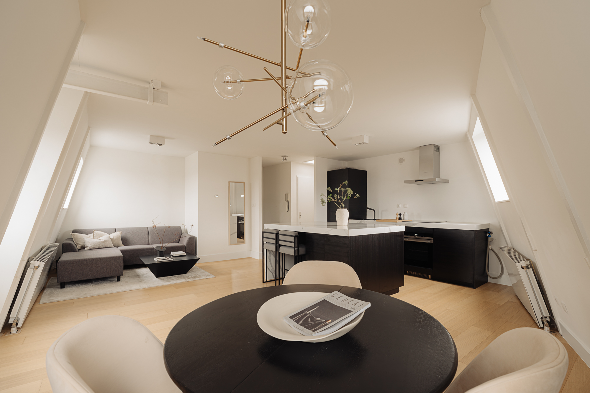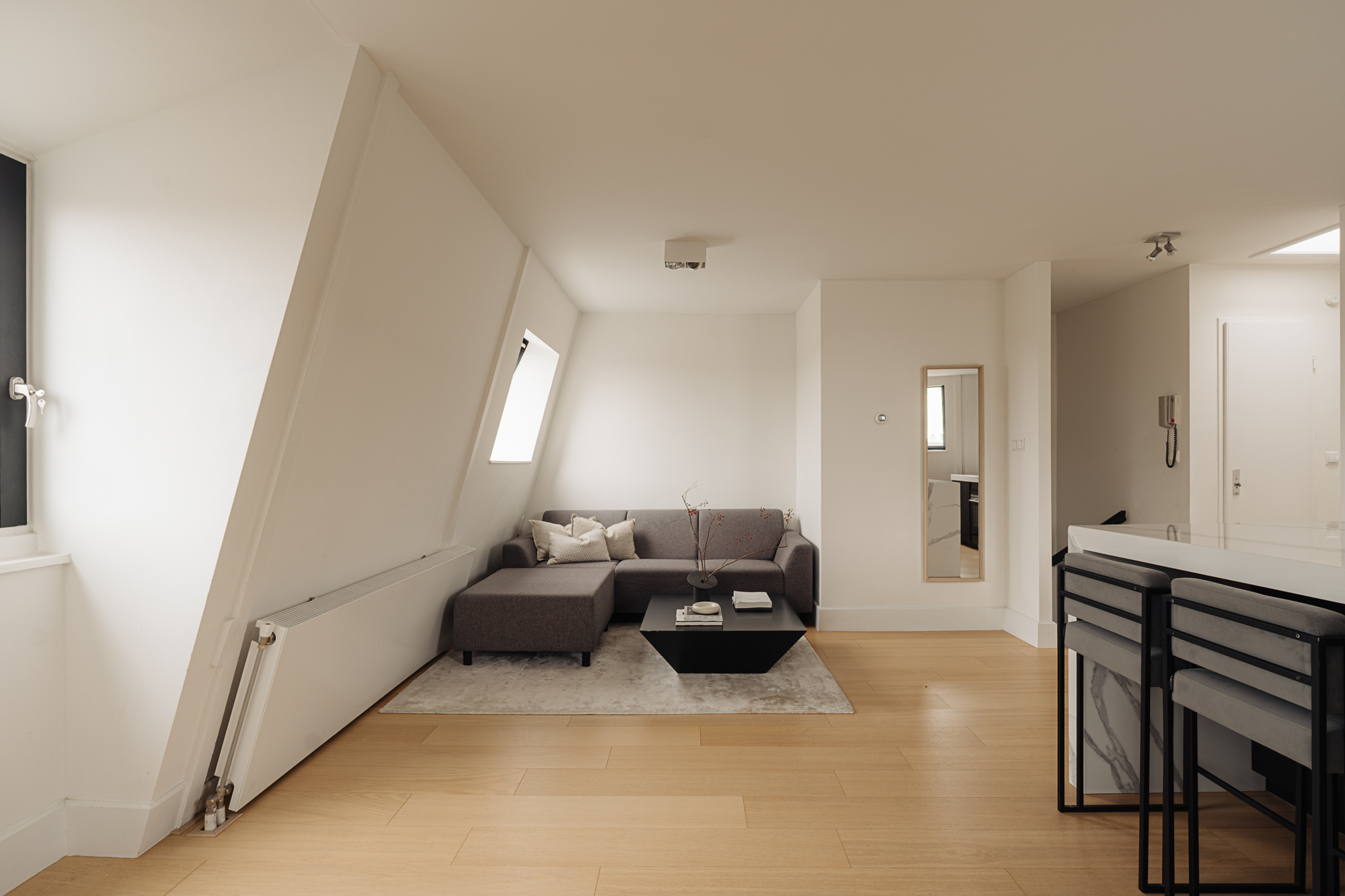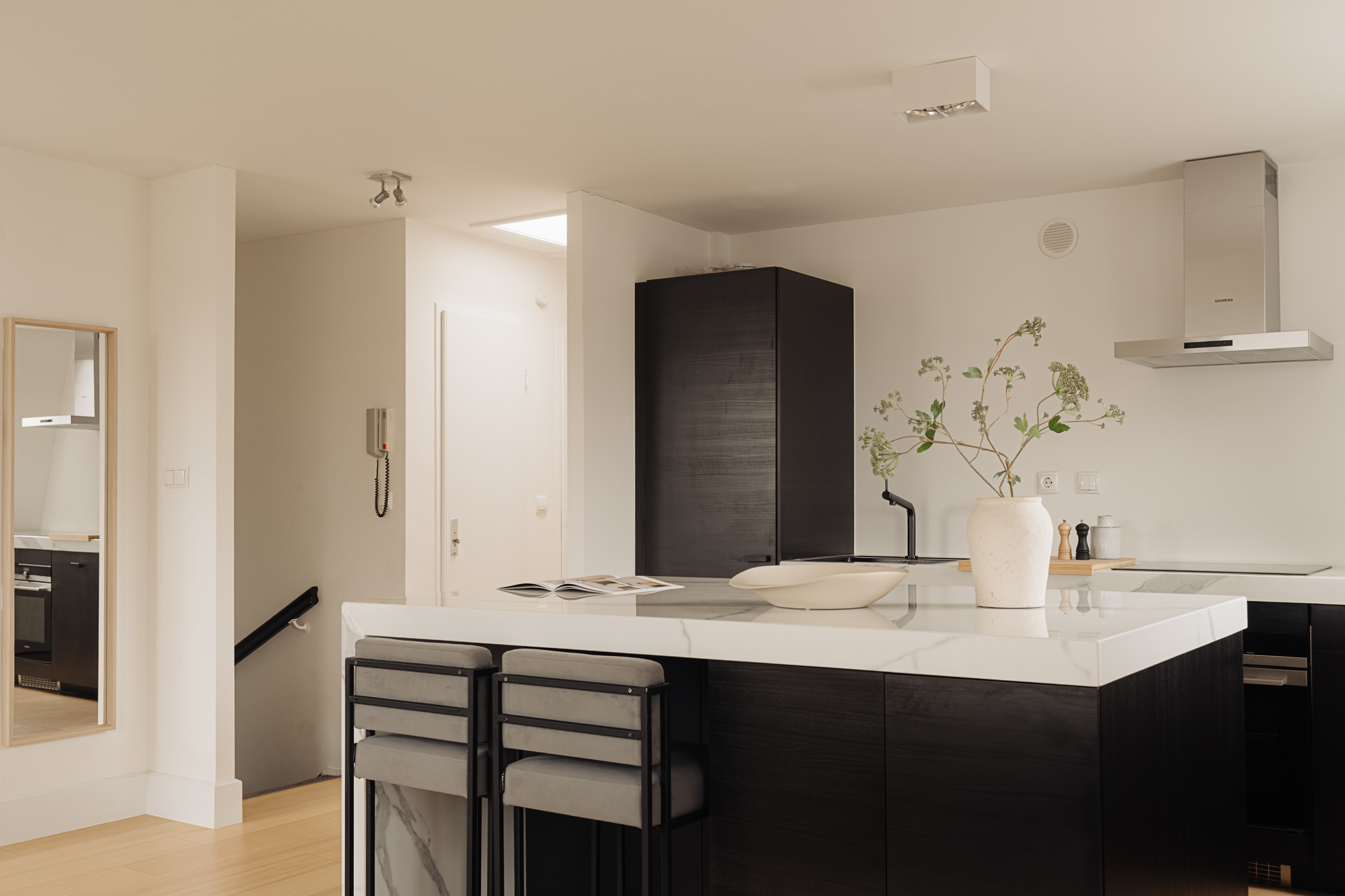 At the front of the apartment is the living room, which benefits from ample natural light due to its corner position and characteristic corner window, offering a lively street view. The open kitchen adjoins the living area and is finished in a modern style with a sleek cooking island. The kitchen is equipped with various Siemens built-in appliances, including an electric cooktop with integrated extraction and a combi oven.