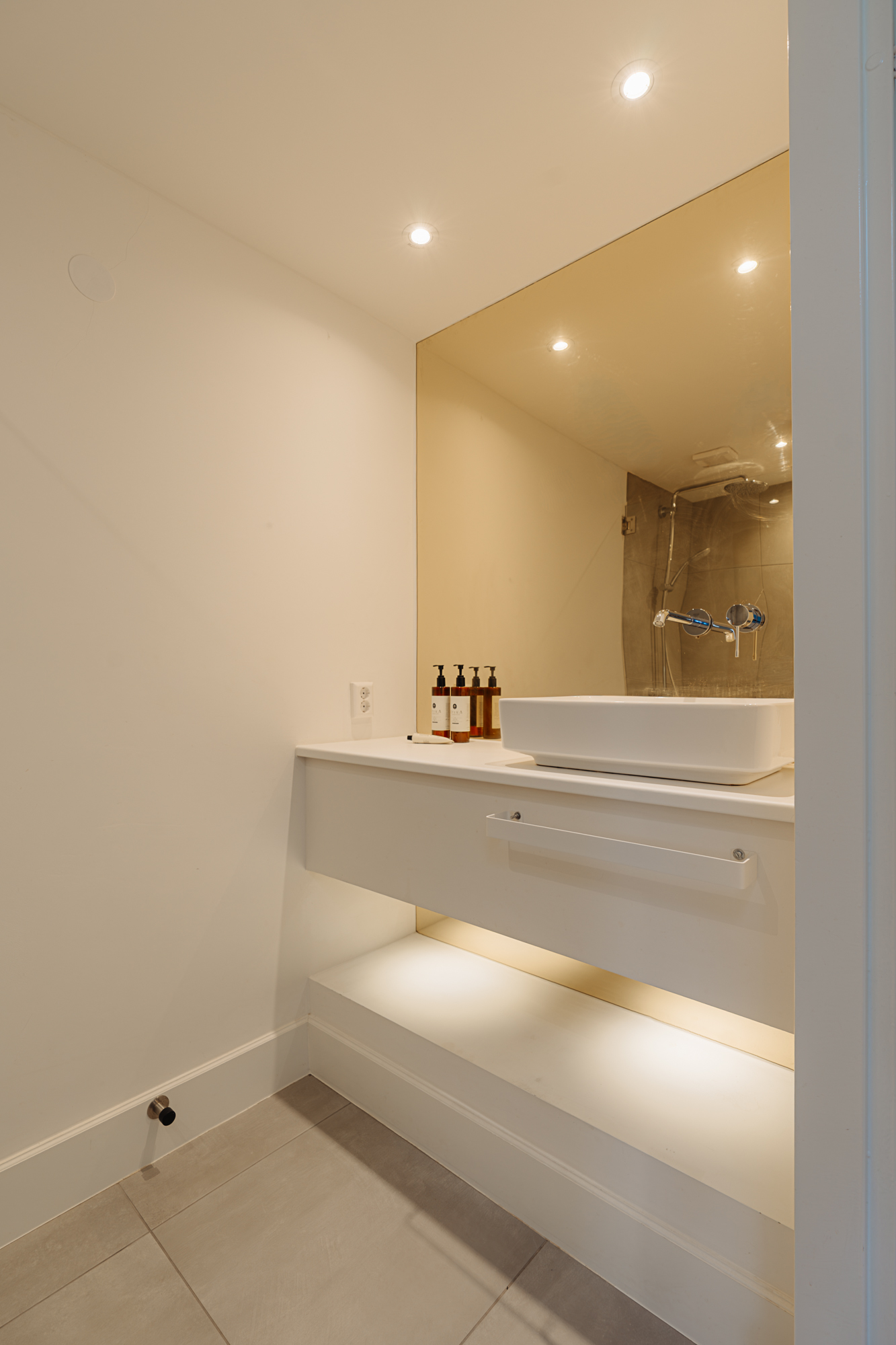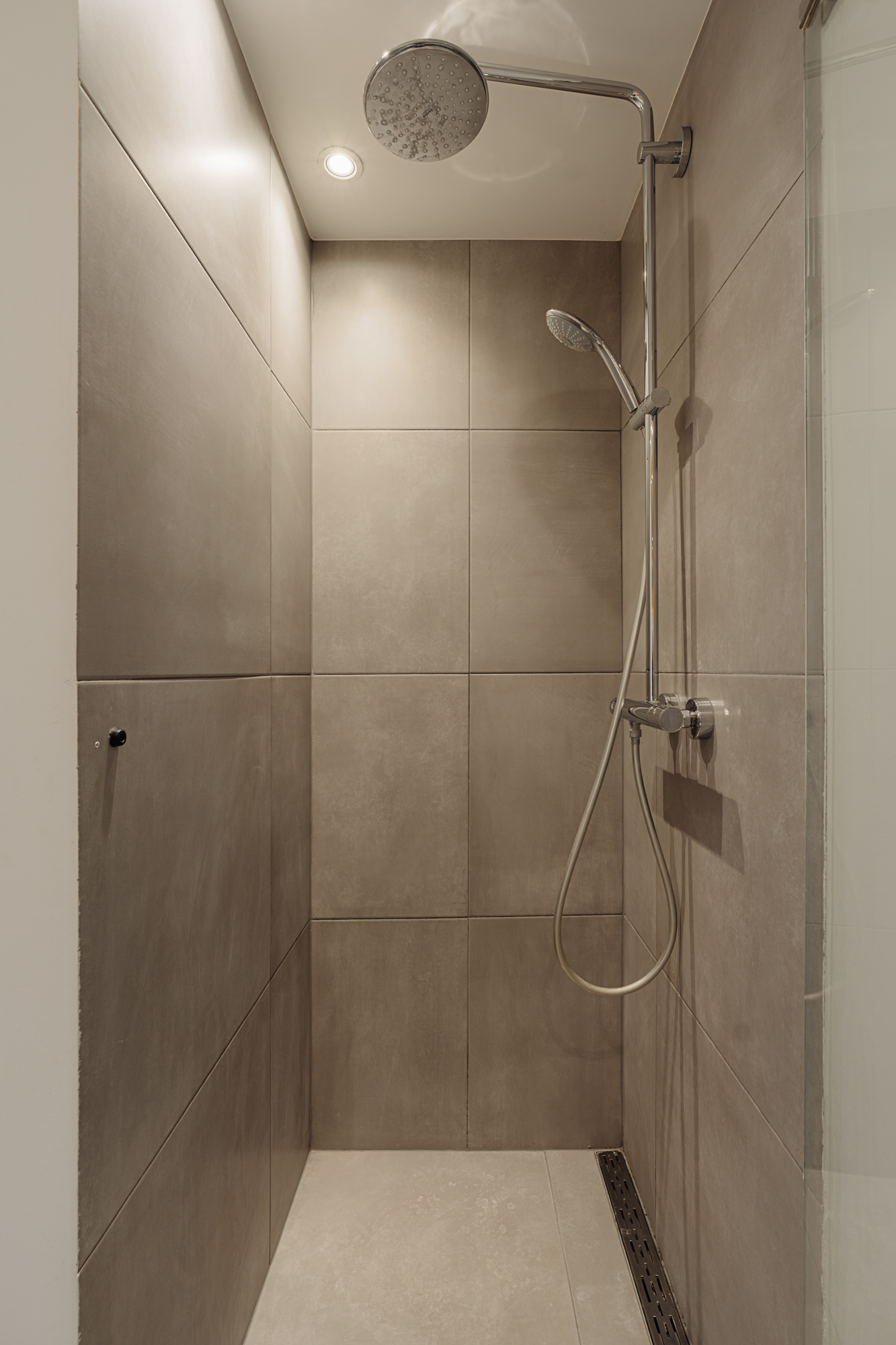 The bathroom is finished in a clean design using natural stone and is fitted with a shower cabin and a washbasin unit. The toilet is separate.
