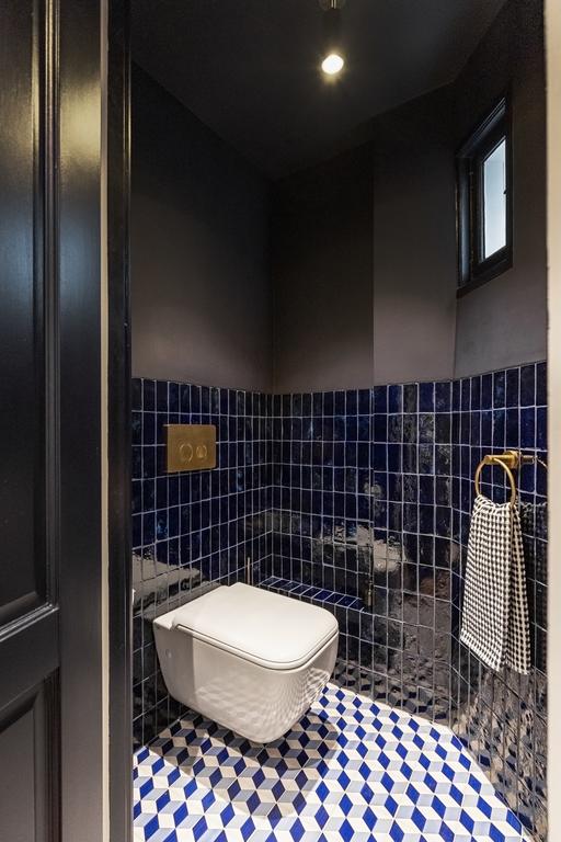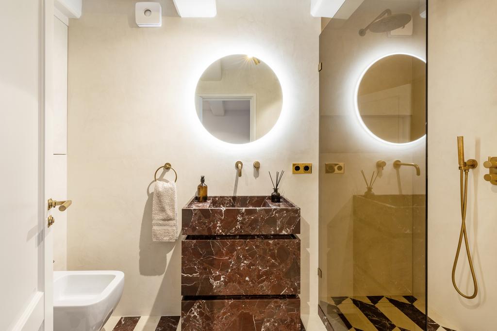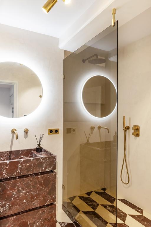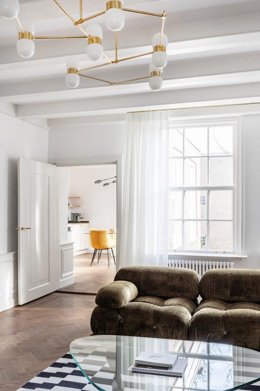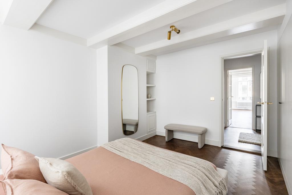 The communal entrance leads to the hallway on the first floor. From here, all rooms, including the living room, kitchen, bathroom, and two generous bedrooms, are easily accessible. The living room, situated at the apartment’s rear, flows into the kitchen, both bathed in natural light. The kitchen is equipped with high-end appliances and offers convenient access to a rear balcony. Positioned at the apartment’s front, you’ll find the two spacious bedrooms with exquisite dark wooden herringbone floors, along with a stylish bathroom complete with a bathtub, double sink, and walk-in shower.