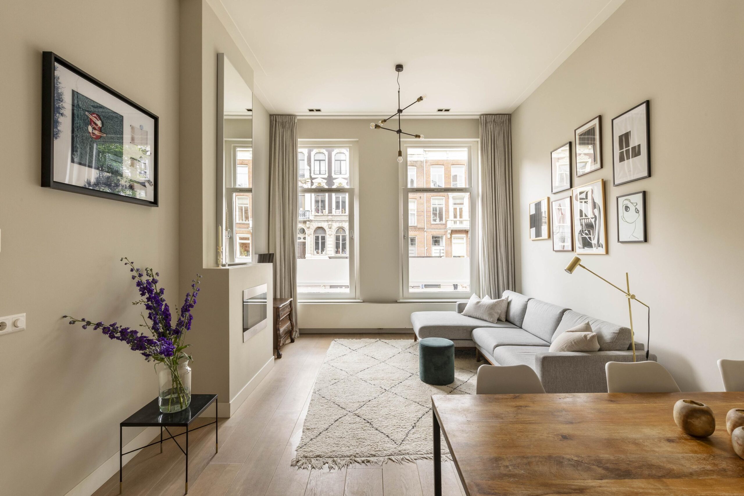 60 metres. The tall windows at the front not only provide an abundance of natural light, but also create a strong sense of space and tranquillity. The apartment forms part of a classic building dating from 1908 and is situated in an exceptionally central location, within walking distance of the Amstel River, Utrechtsestraat, and Theatre Carré.