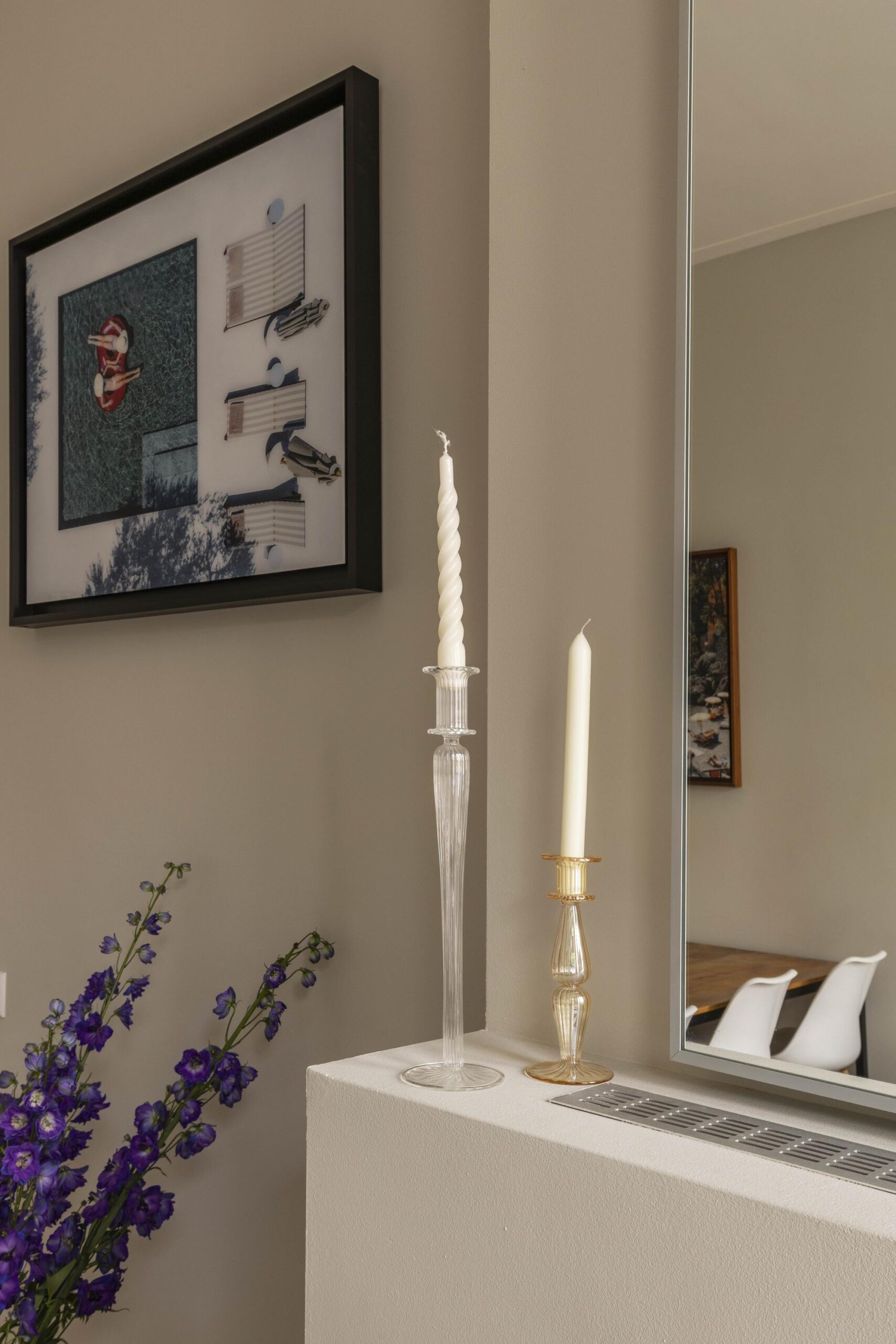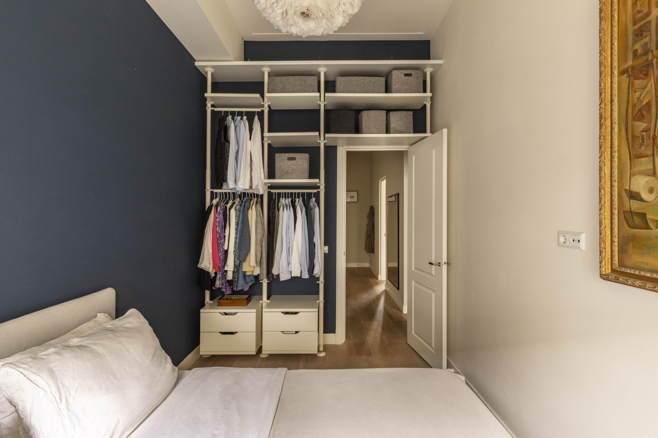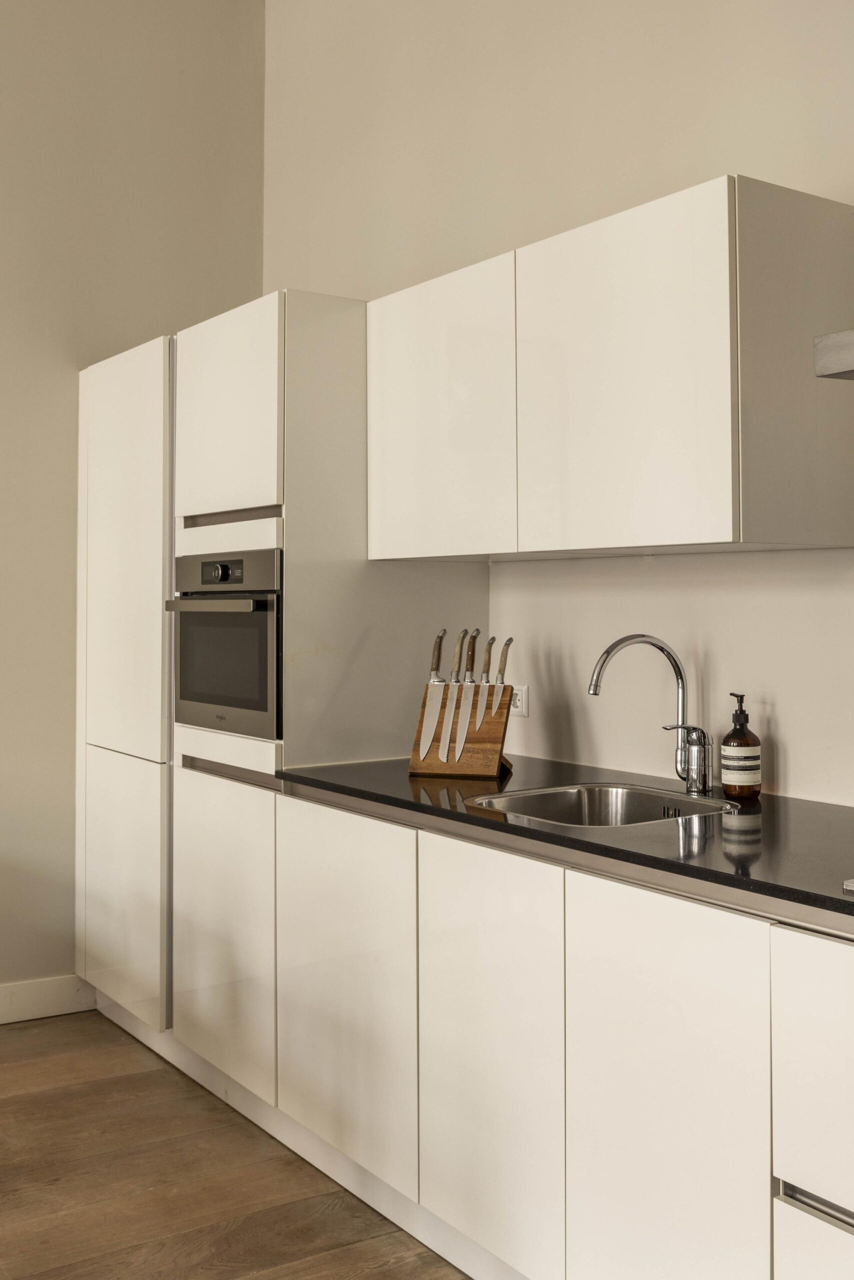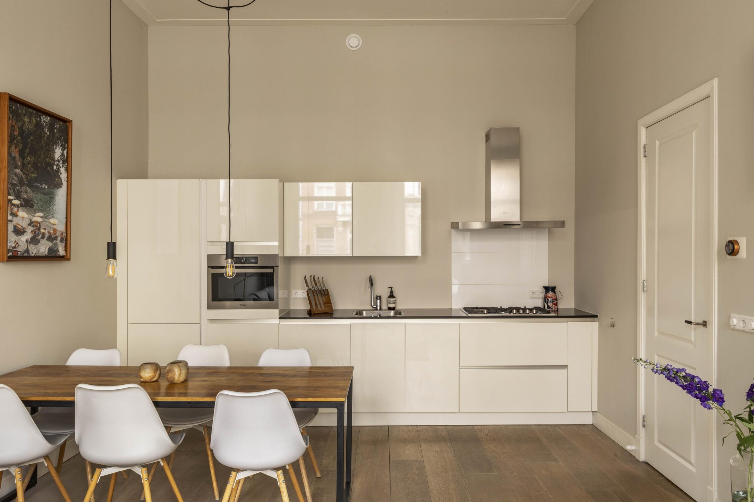 The apartment is located on the bel-etage (raised ground floor) of the building and has a very logical and comfortable layout. The private entrance leads into a spacious hallway providing access to all rooms. At the front is the bright living room overlooking the Sarphatistraat, where the generous ceiling height and large windows immediately stand out. The living room flows seamlessly into a cosy dining area and a modern kitchen fitted with contemporary built-in appliances.