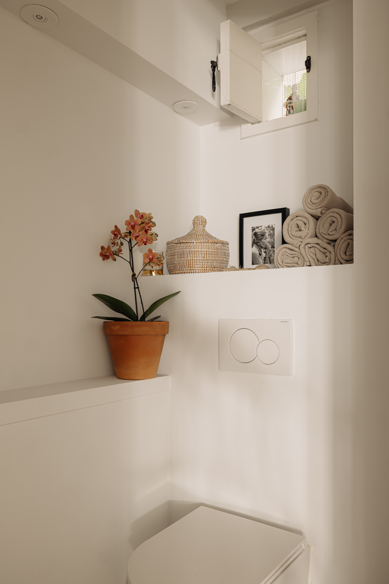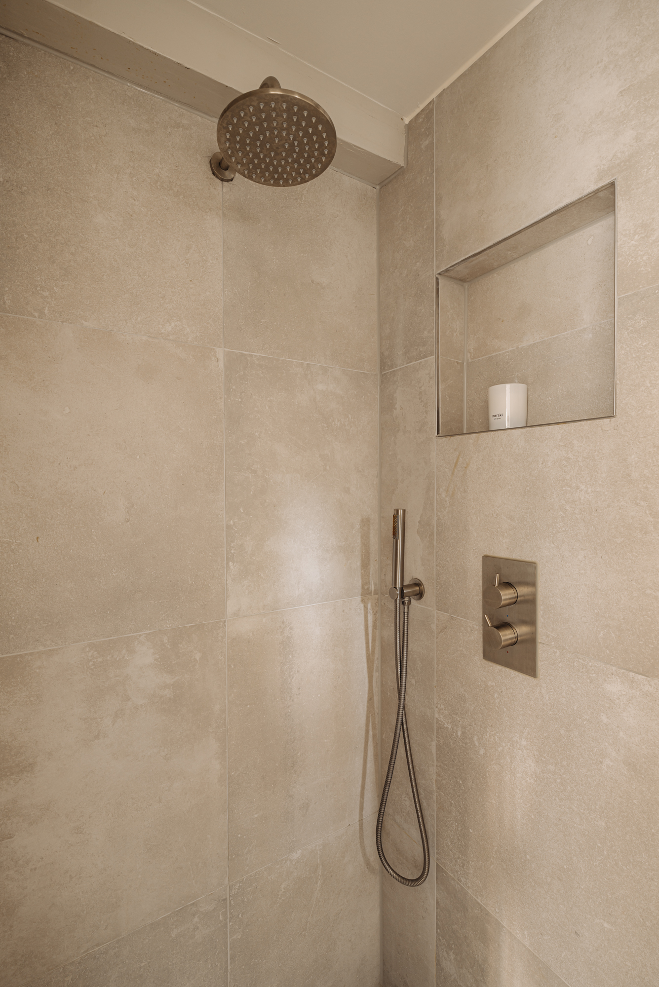 The kitchen is situated on the lower ground floor and includes an extra-deep marble countertop, as well as access to the communal, enclosed patio. This level also houses a bathroom and an internal utility room with washing machine connection.