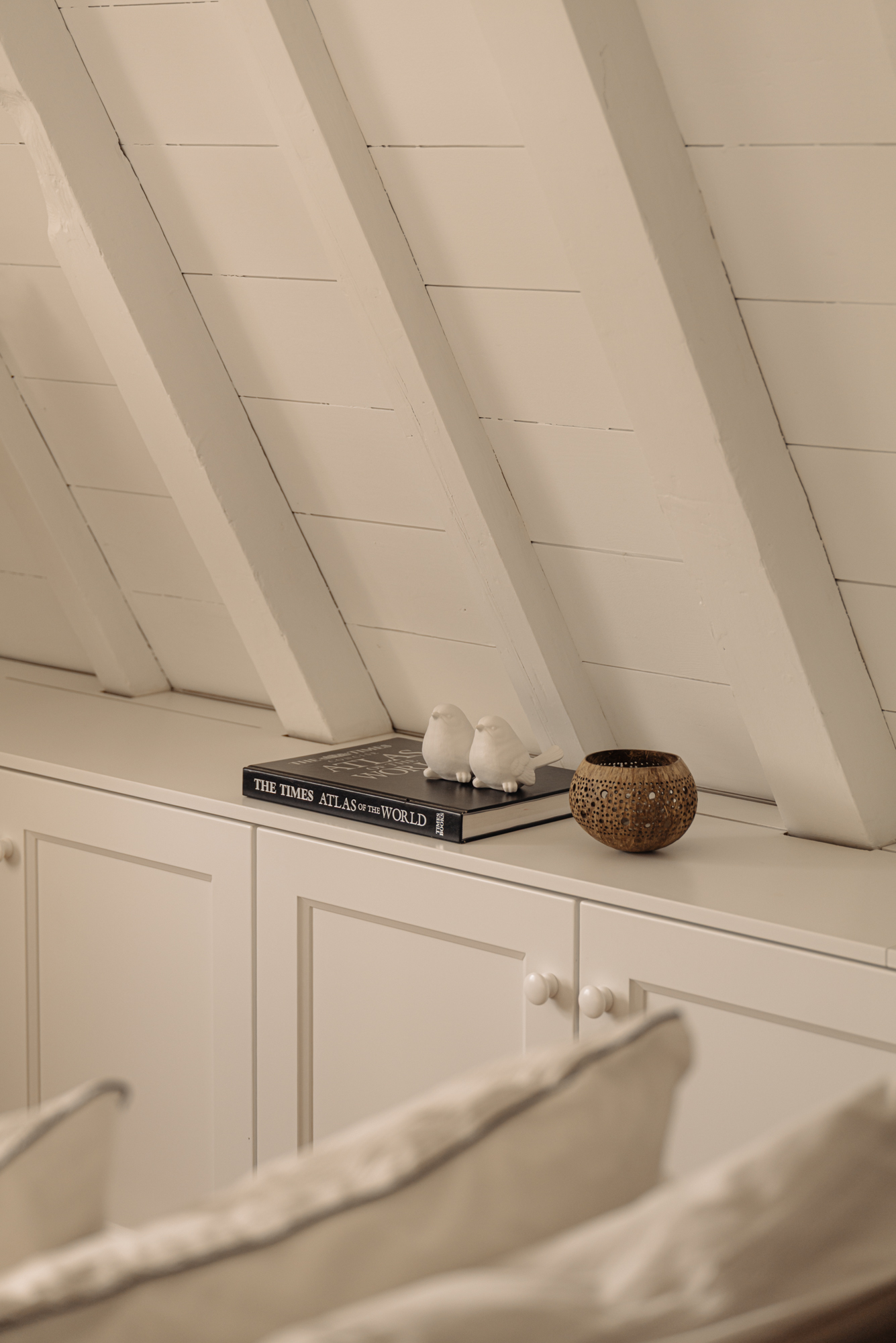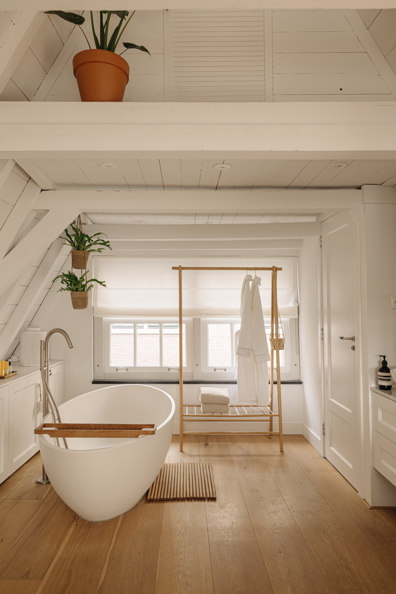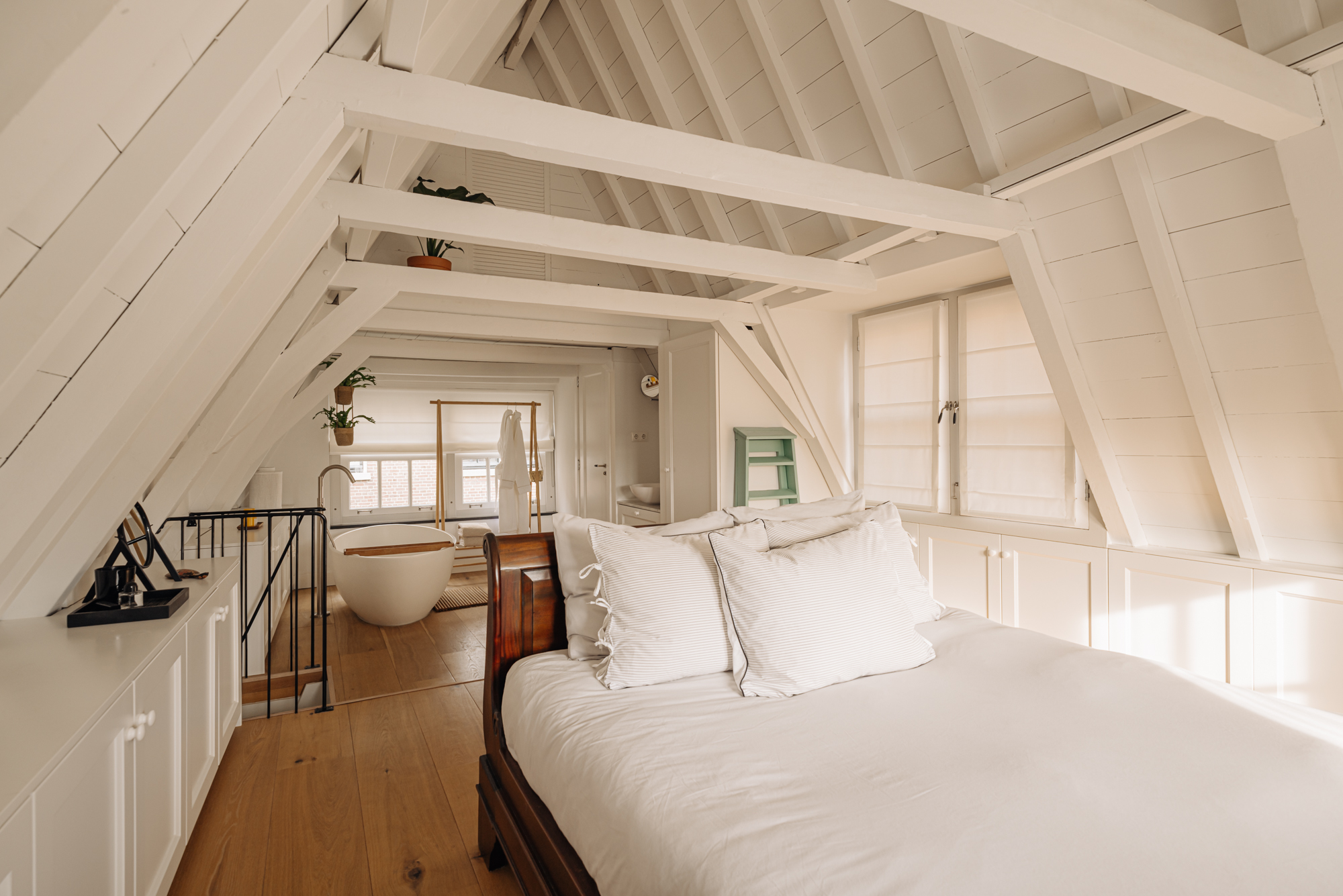 The top floor comprises the main bedroom, complete with ample bespoke storage, a freestanding bathtub, and stunning views over the water.