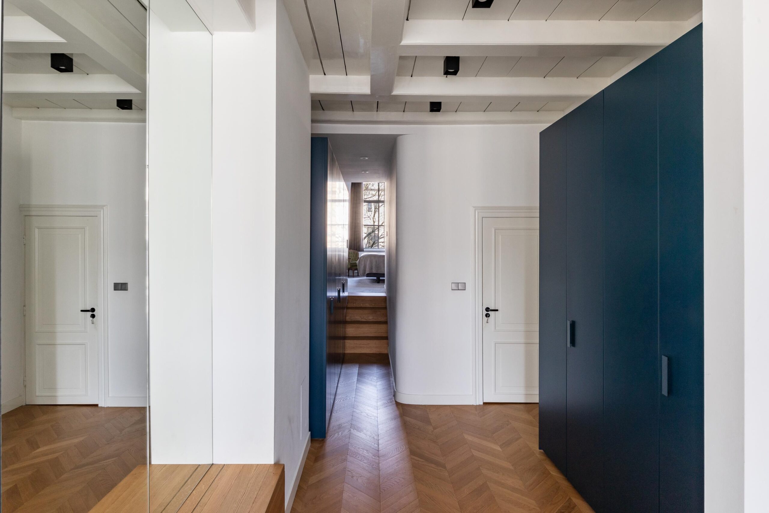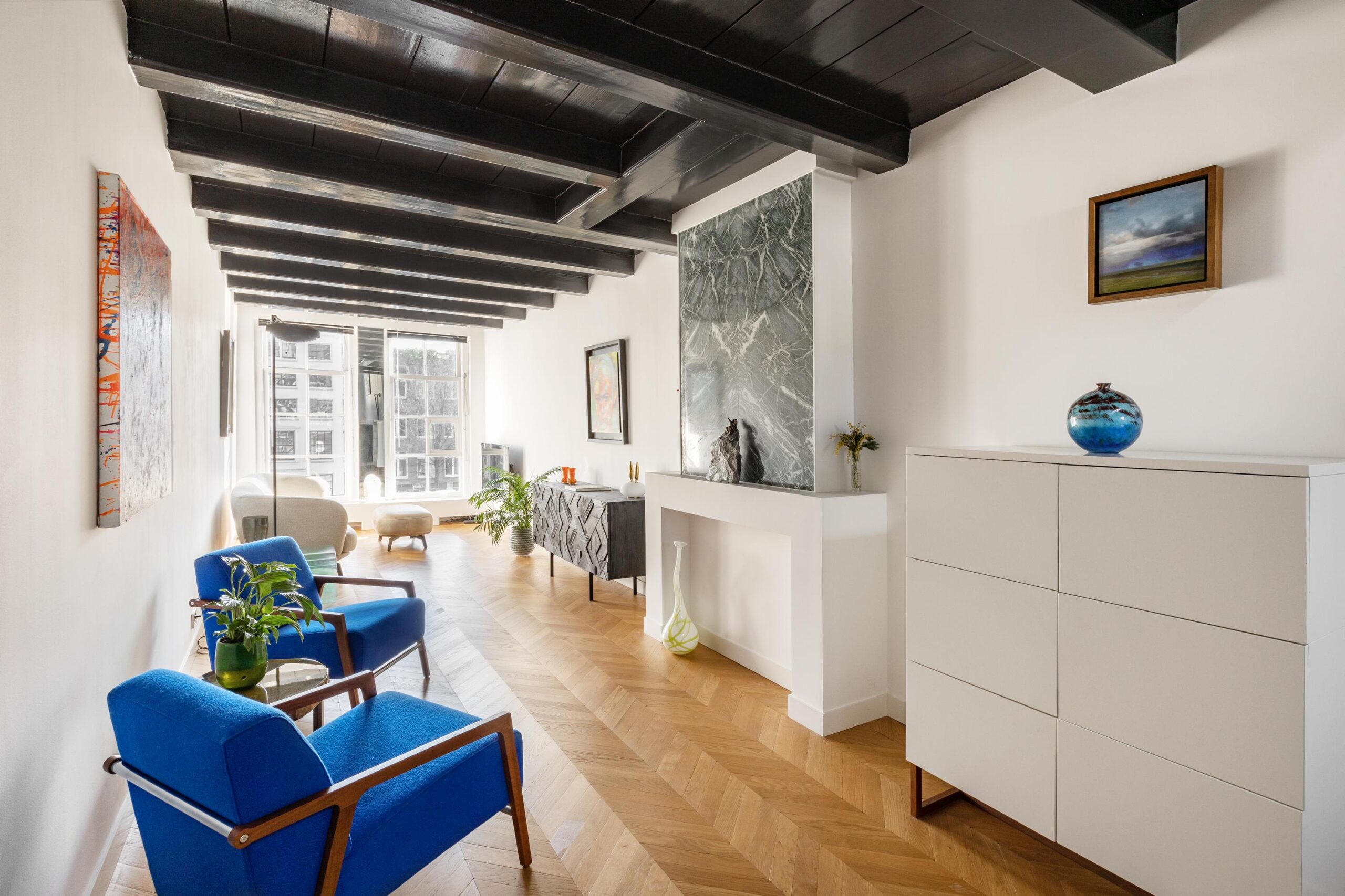 The second floor houses a spacious living room featuring a Hungarian point wooden floor and expansive windows that stretch nearly from floor to ceiling, offering breathtaking canal views.