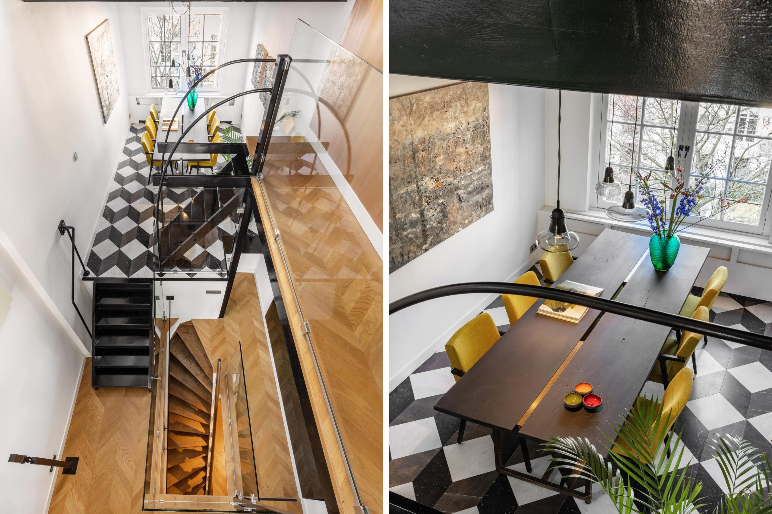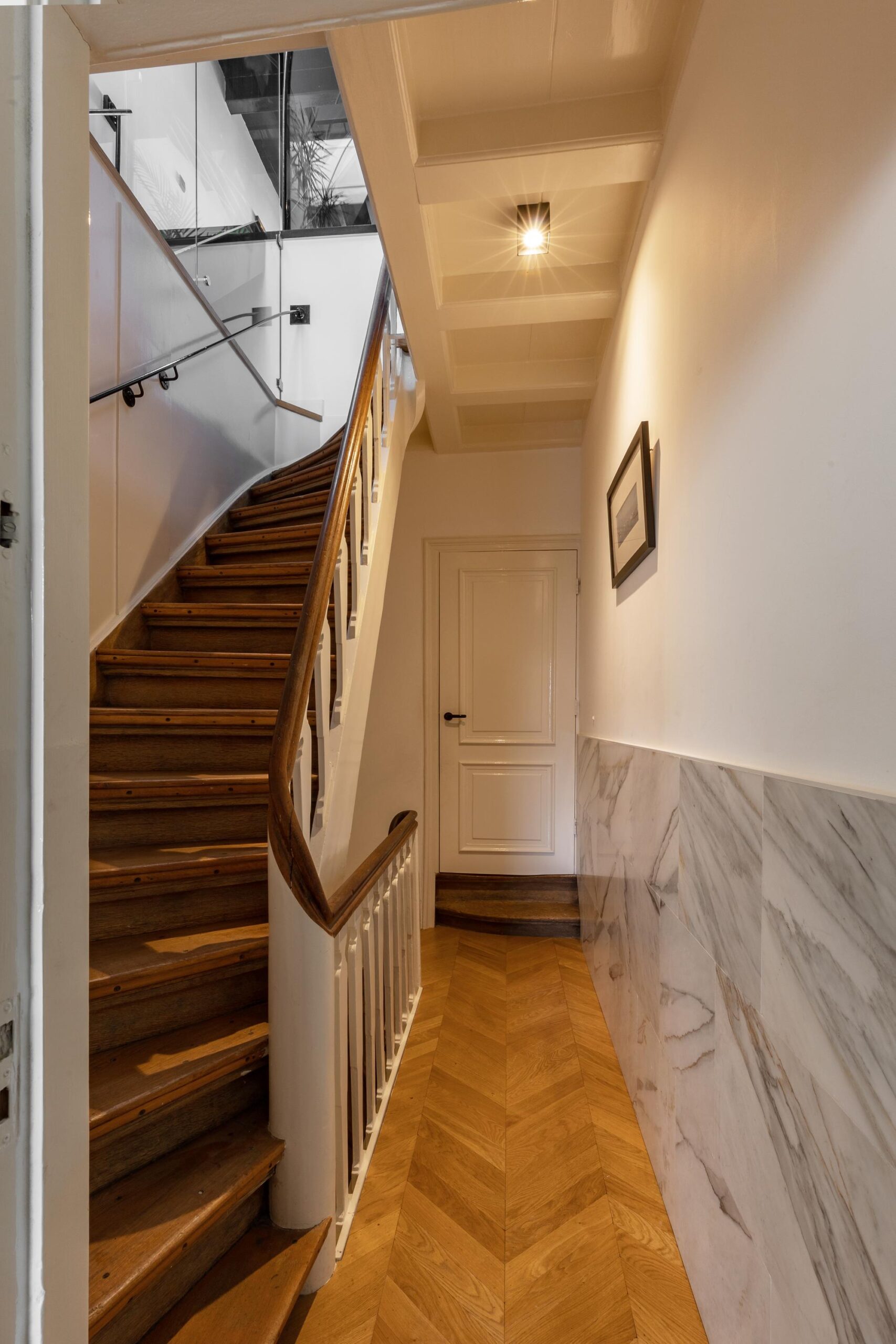 At the heart of this space is an impressive open void of nearly six meters high, creating a striking sense of volume. A refined glass balustrade enhances the openness and subtly connects the different floors. The balustrade can be illuminated at two different levels.