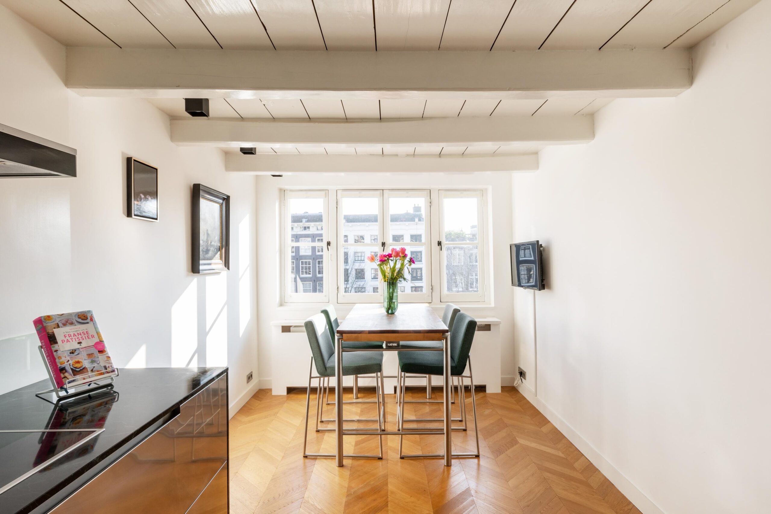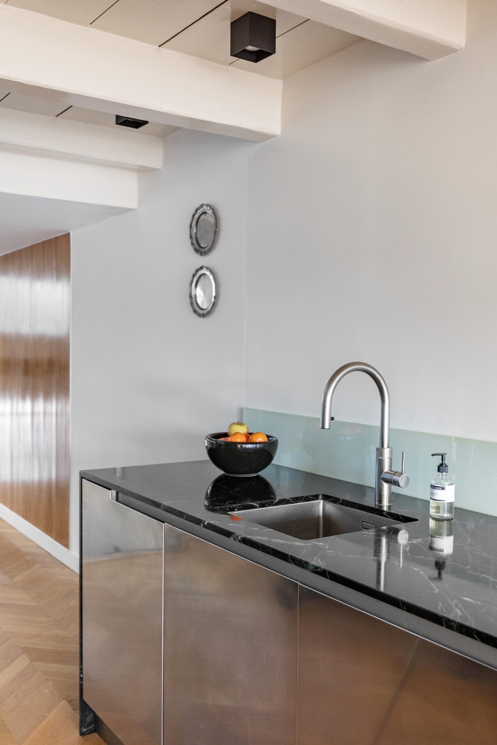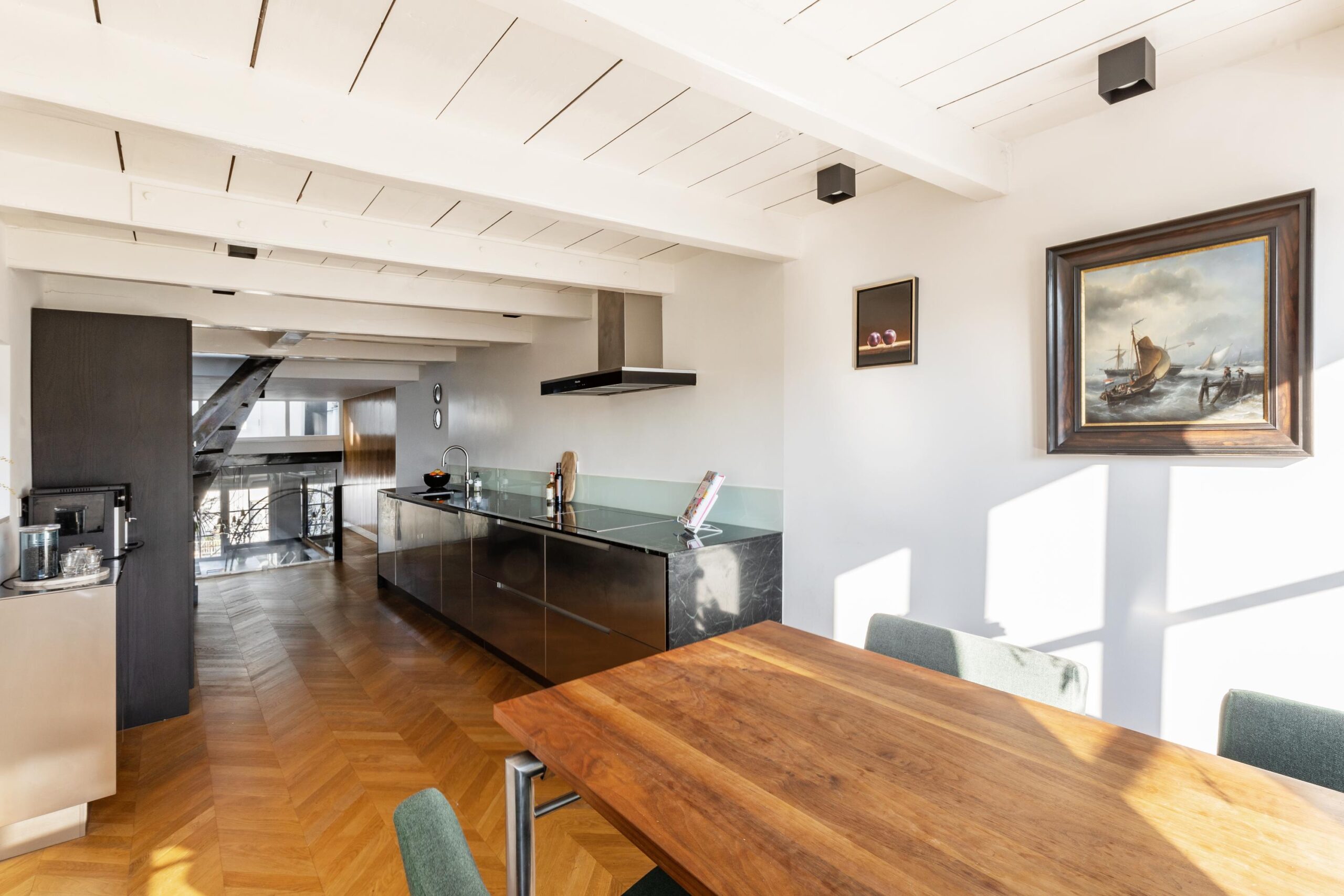 The open-plan kitchen on the third floor is tastefully designed with high-end built-in appliances, stainless steel finishes, and striking green marble. Once again, the space is complemented by a Hungarian point floor, charming French doors, and exposed wooden beams.
