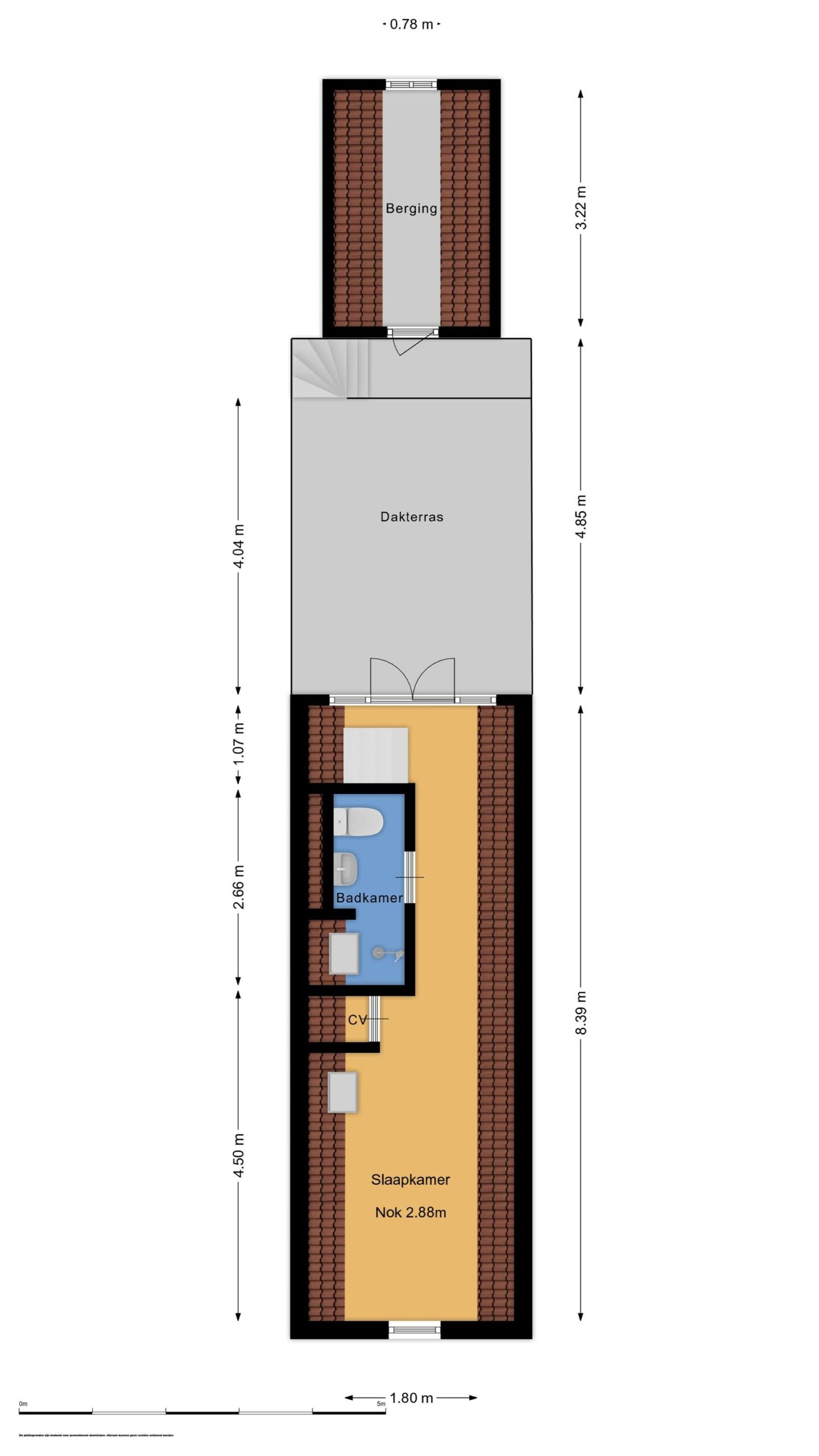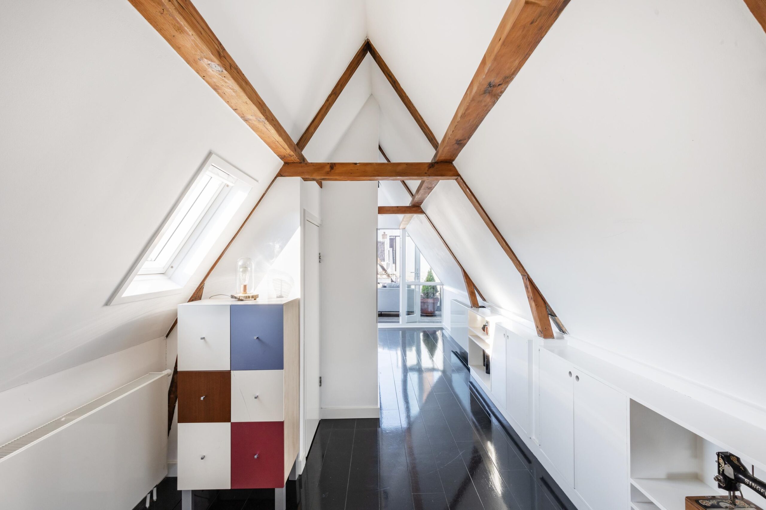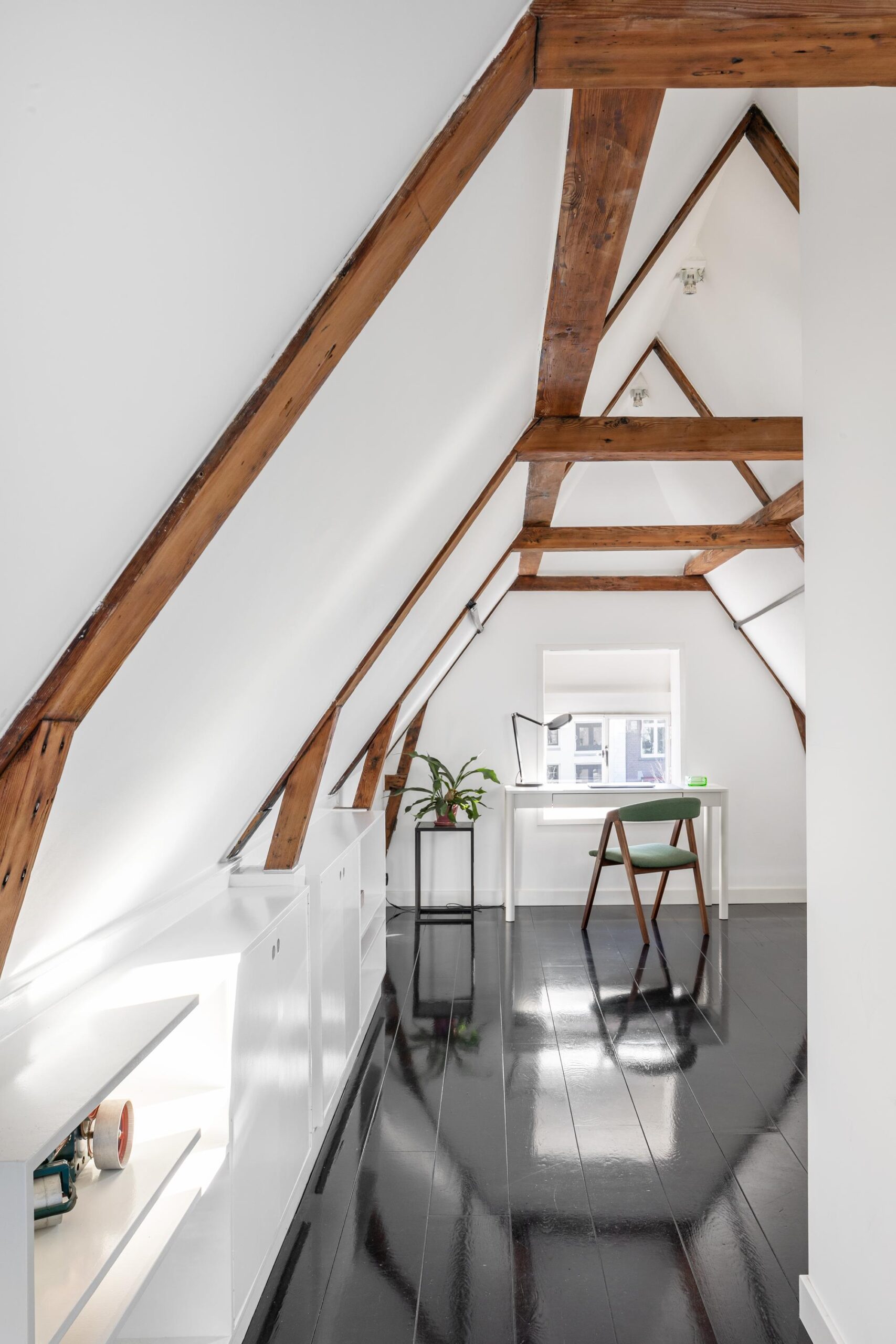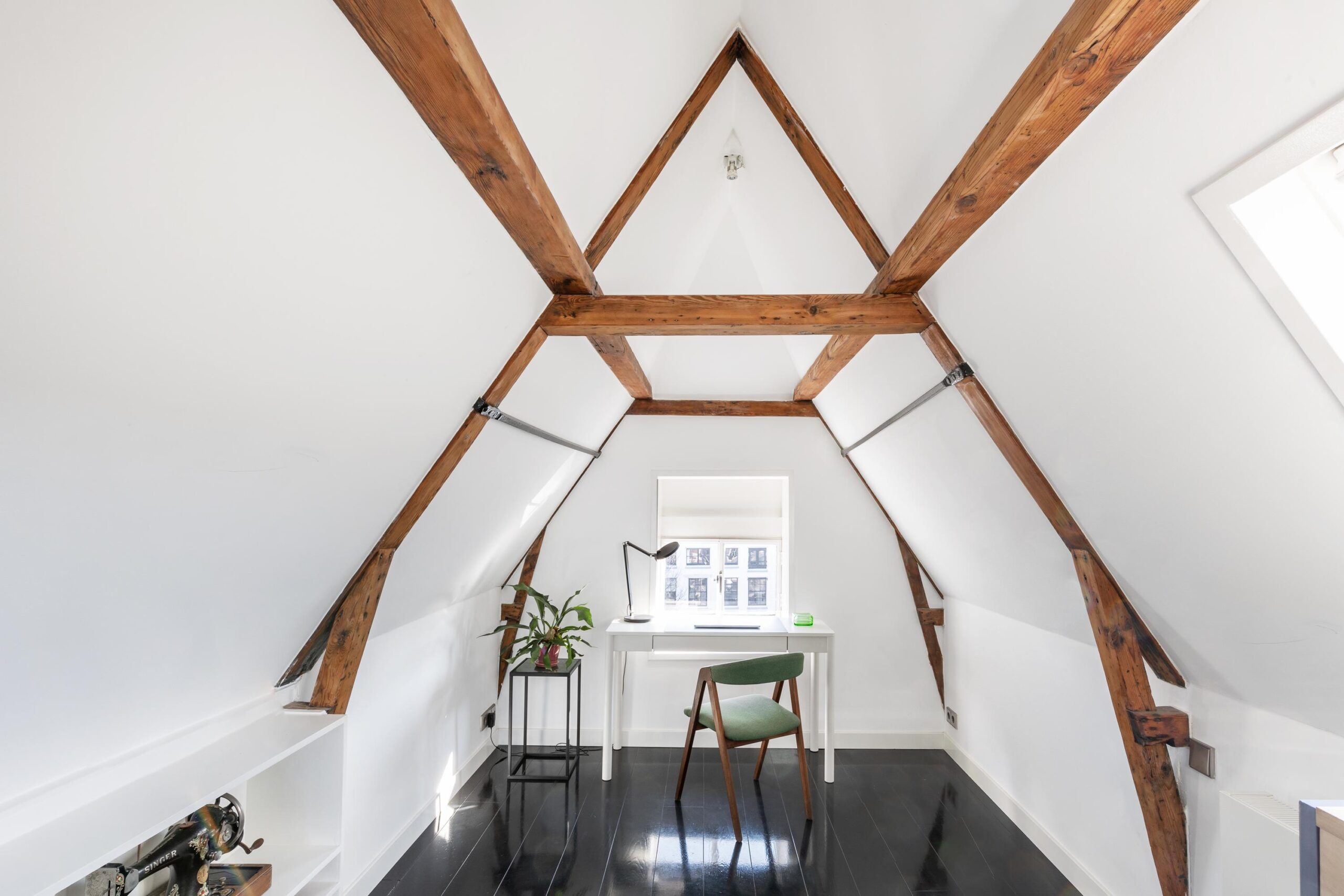 The inviting attic level boasts an exposed wooden beam structure, a bathroom with a toilet, and is perfectly suited as a study or additional bedroom.