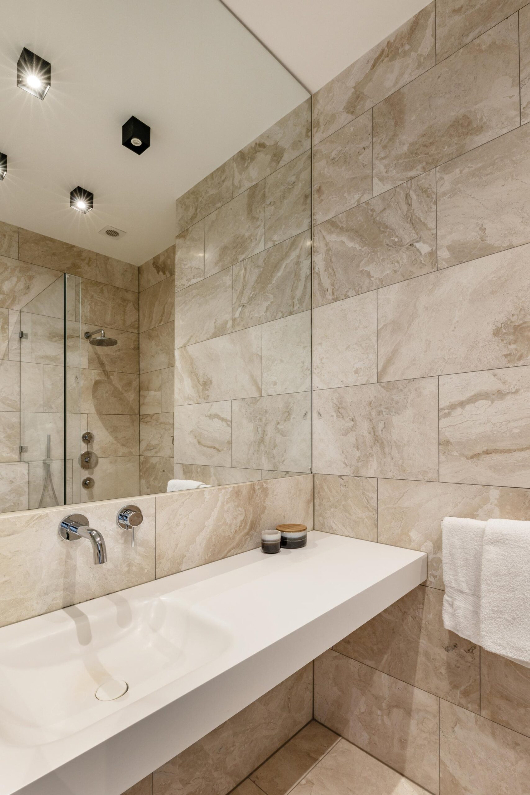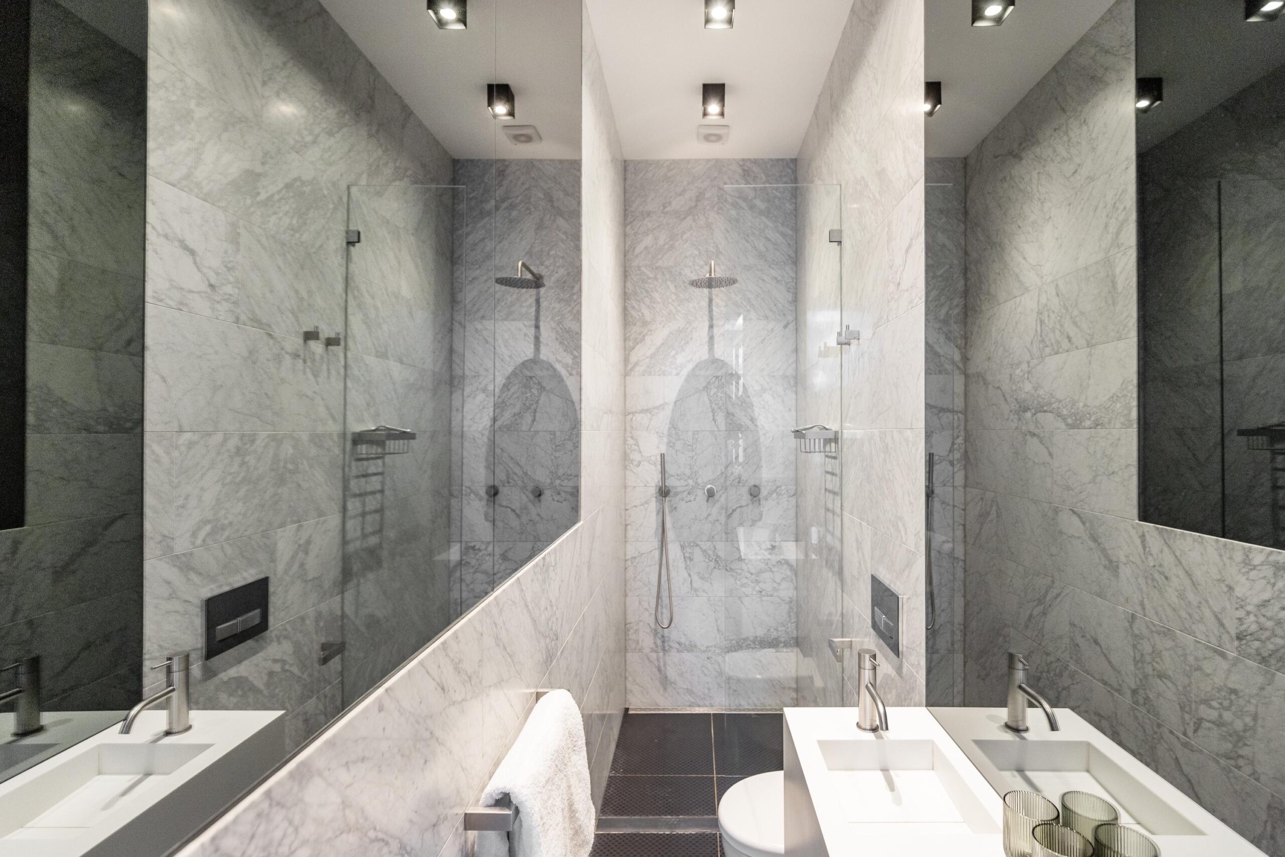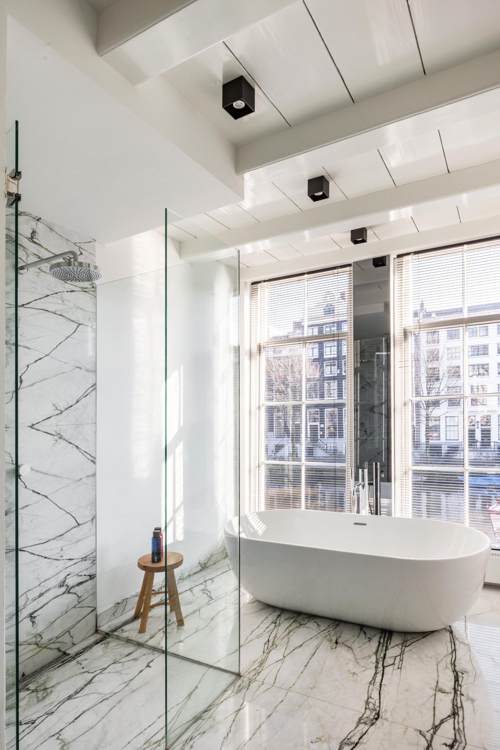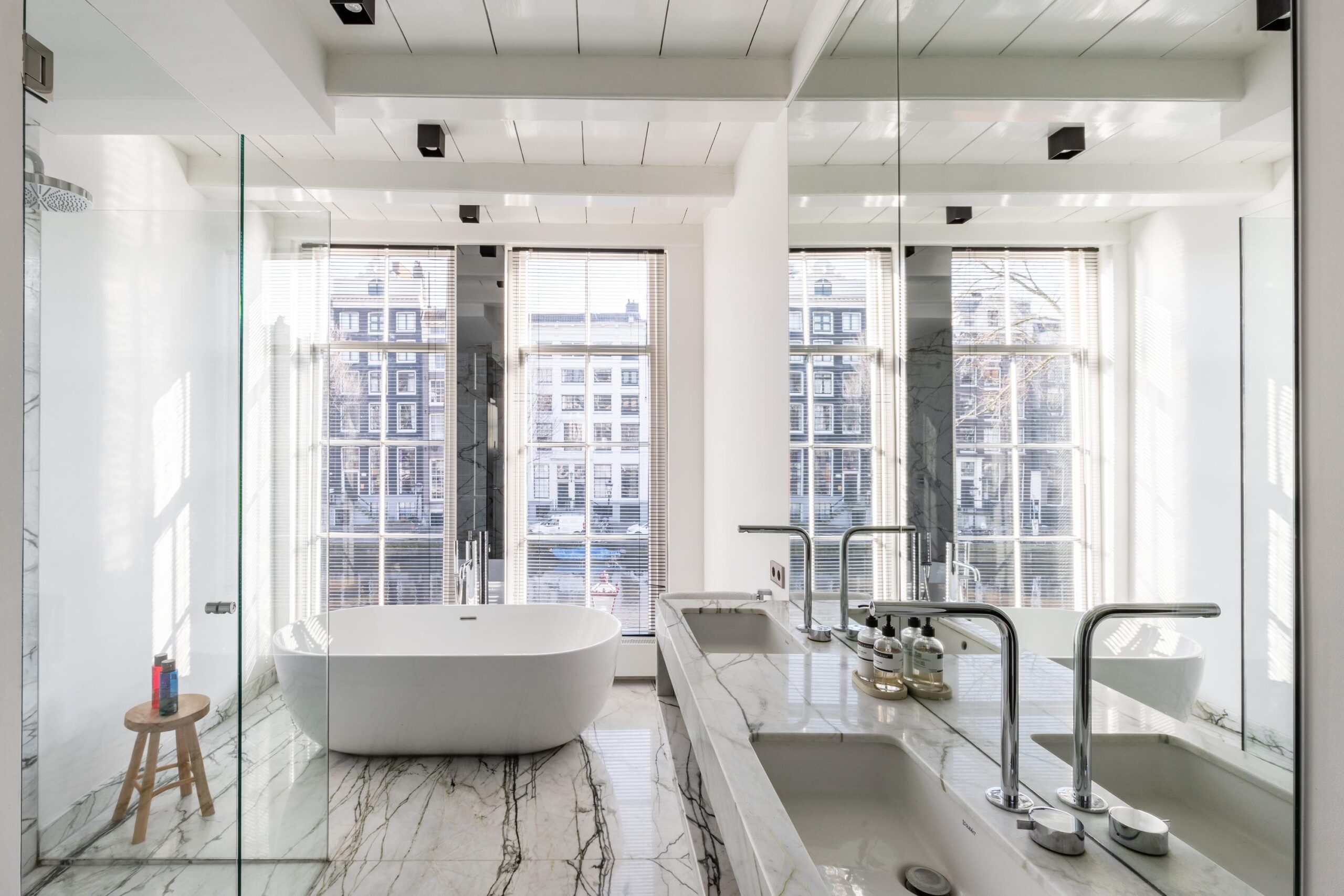 On the first floor, a luxurious bedroom with an en-suite bathroom overlooks the canal. The bathroom is exquisitely finished with custom marble slabs and includes a double walk-in shower, a double sink, and a bathtub with a view of the water. A dressing room with custom-built wardrobes leads to the sleeping area at the rear.