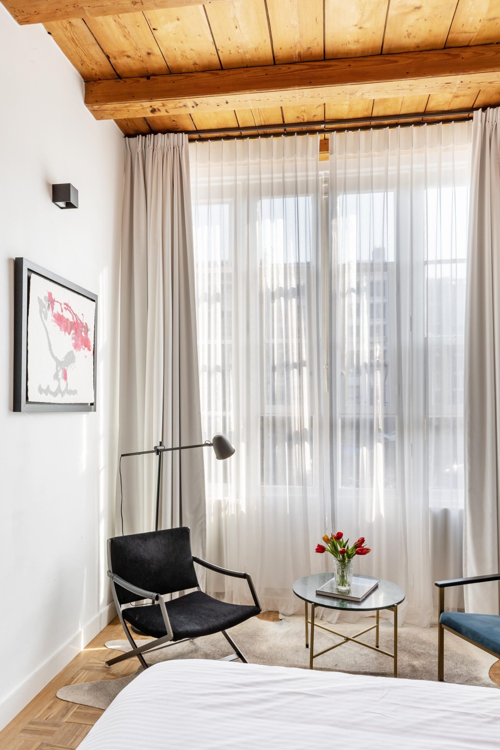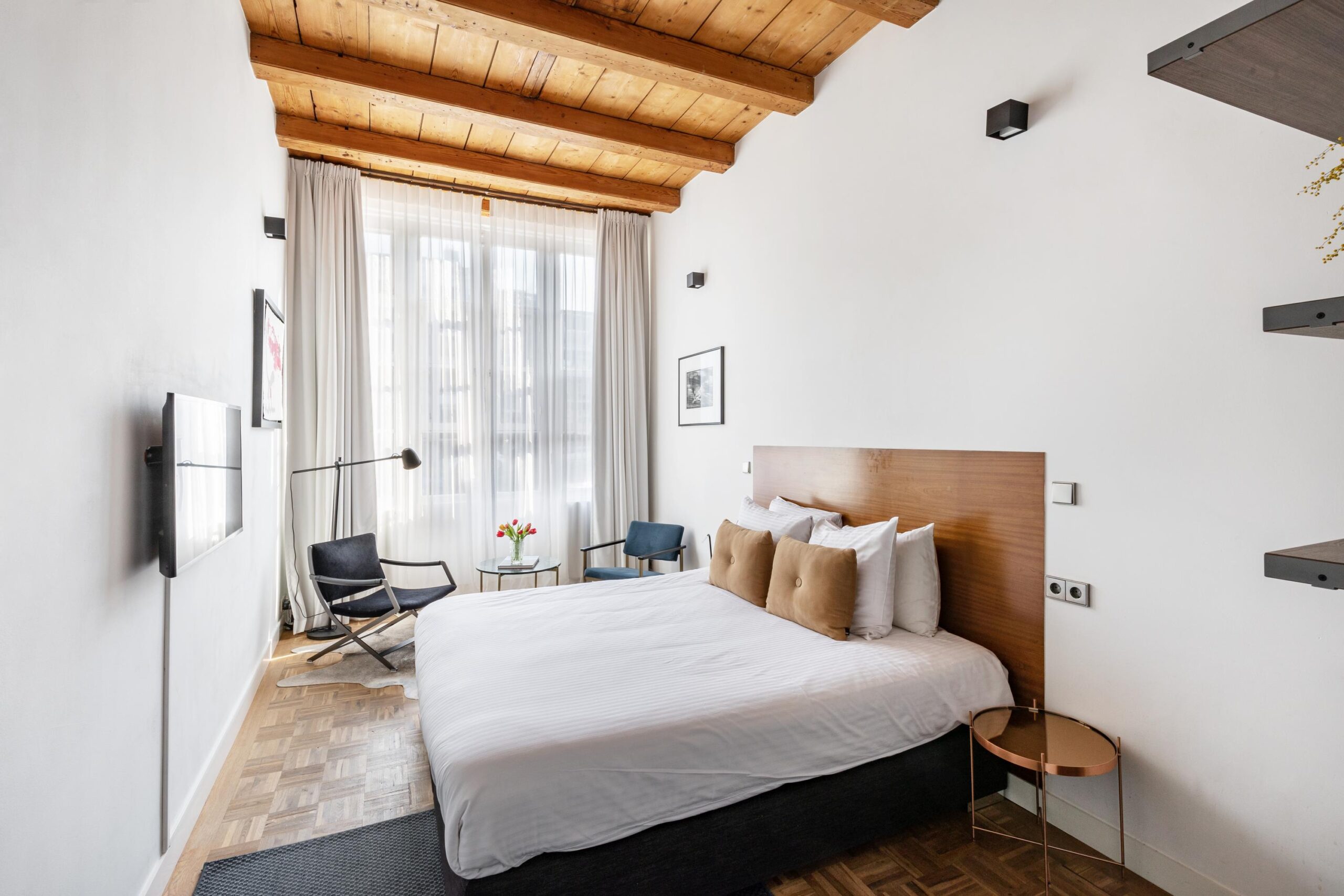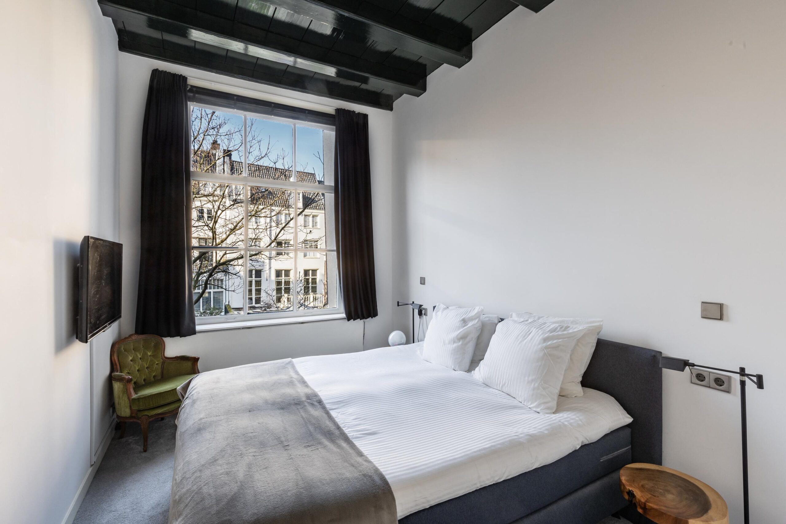 The bel-etage comprises two elegant bedrooms with soaring ceilings of approximately 3.5 meters, large windows, and a refined herringbone-patterned wooden floor. Both rooms have their own en-suite bathroom. The canal-facing bedroom showcases a charming wooden beam ceiling, while the garden-facing bedroom is adorned with original ceiling ornaments.