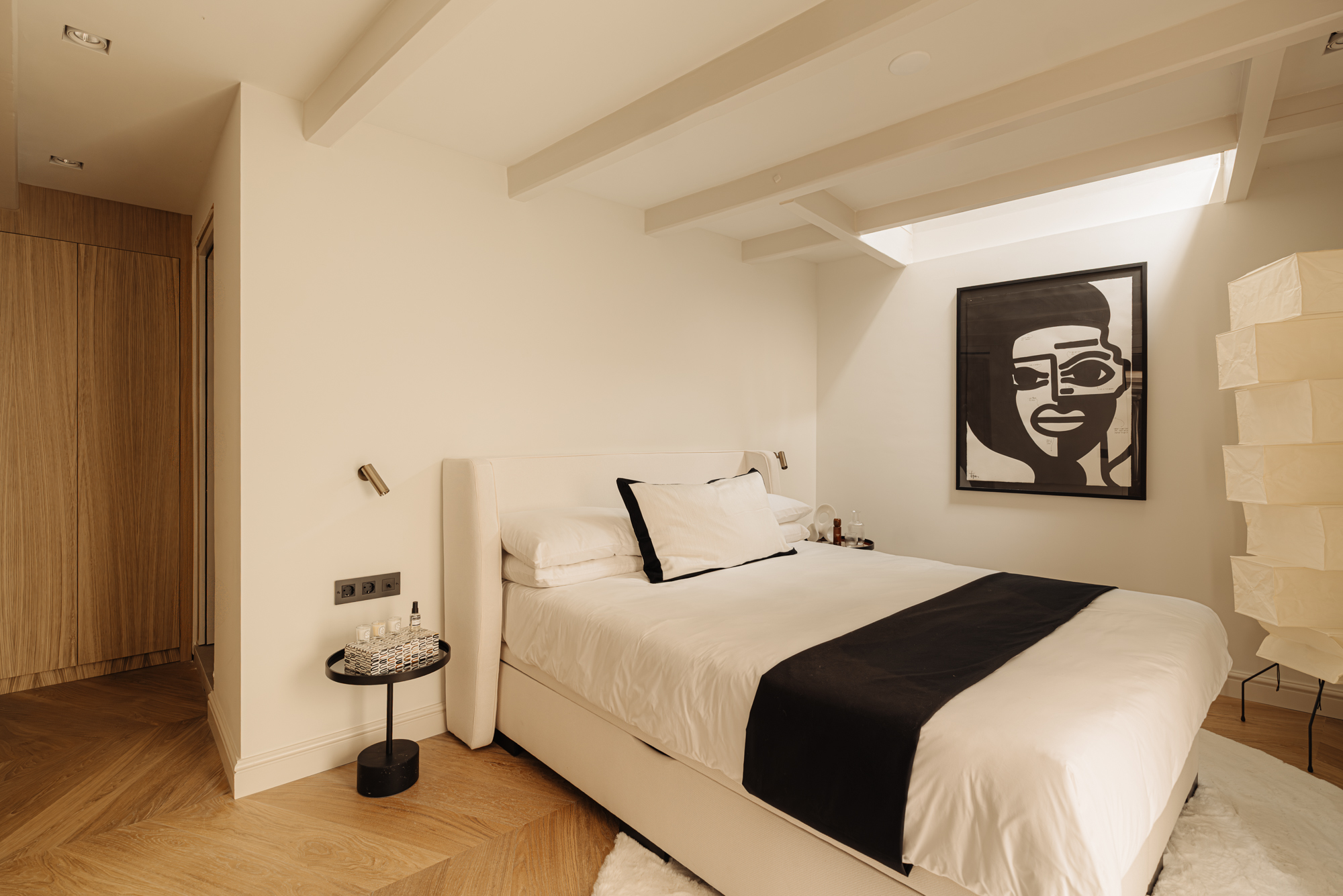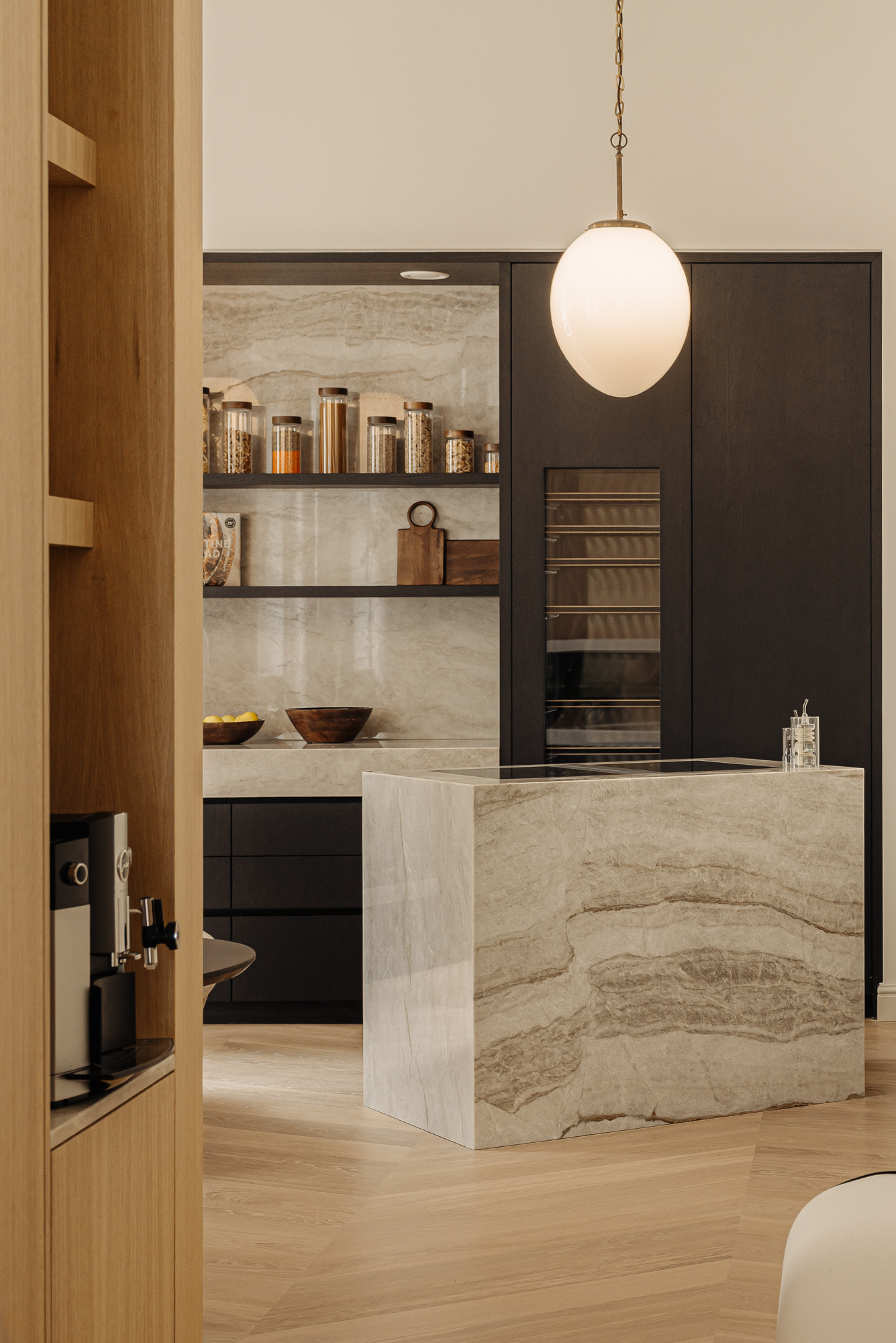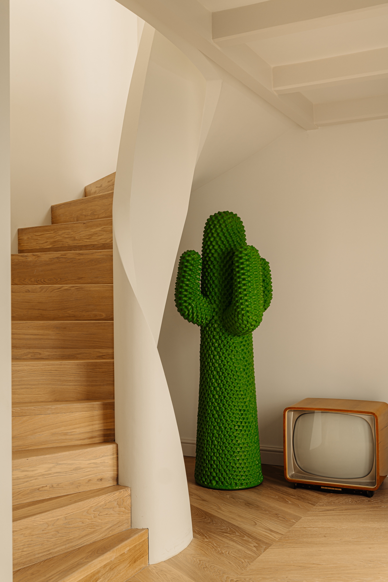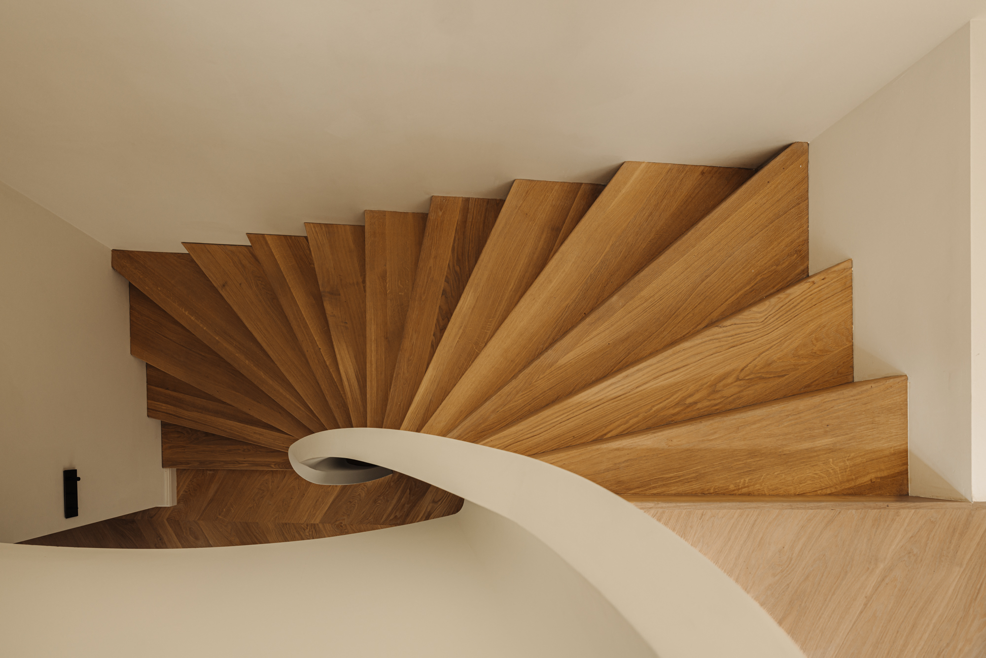 The wide chevron floor enhances the sense of space and elegance. Among the architectural highlights is the sculptural winding staircase – a striking centerpiece that connects the home’s two levels and captures the spirit of contemporary canal-side living.