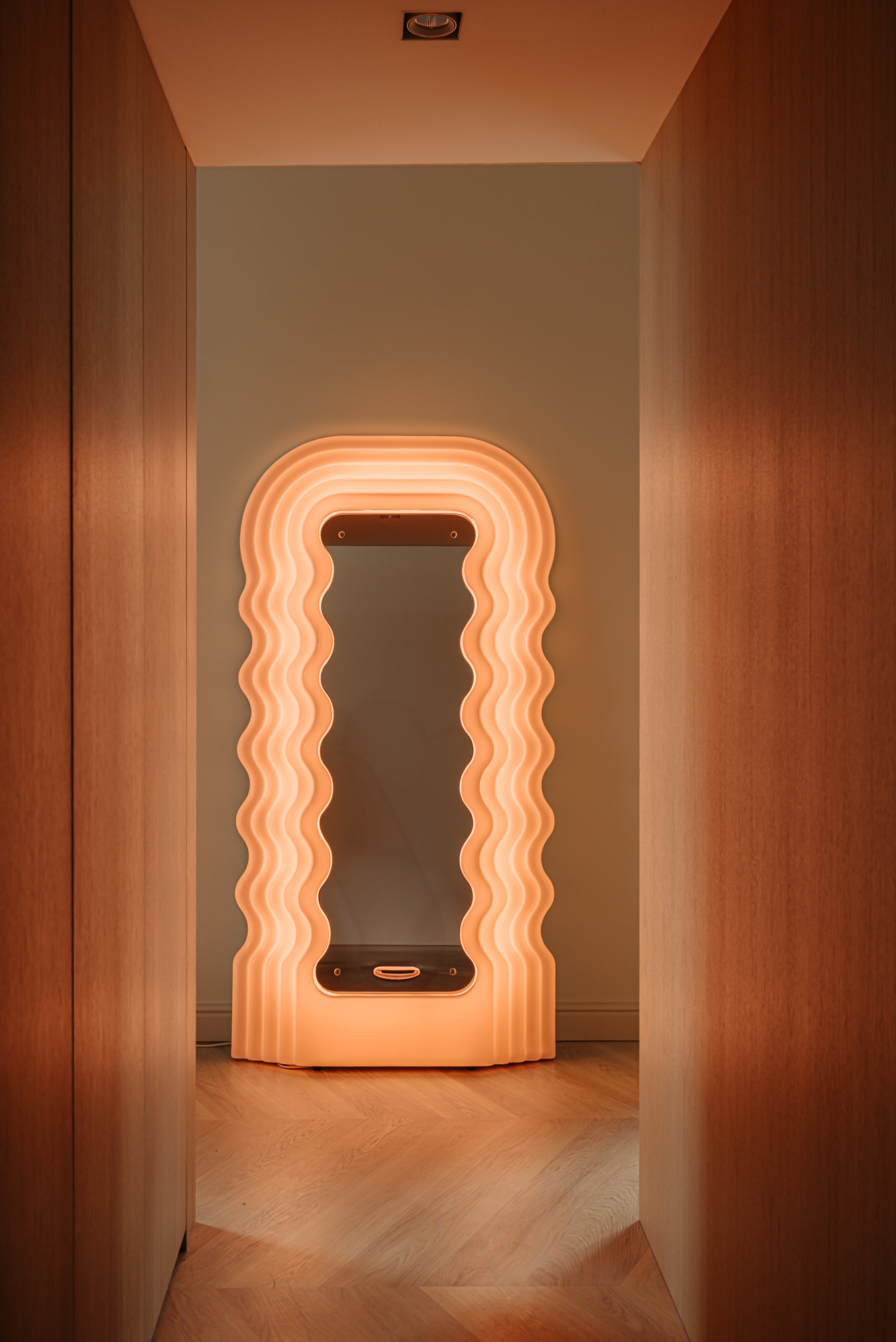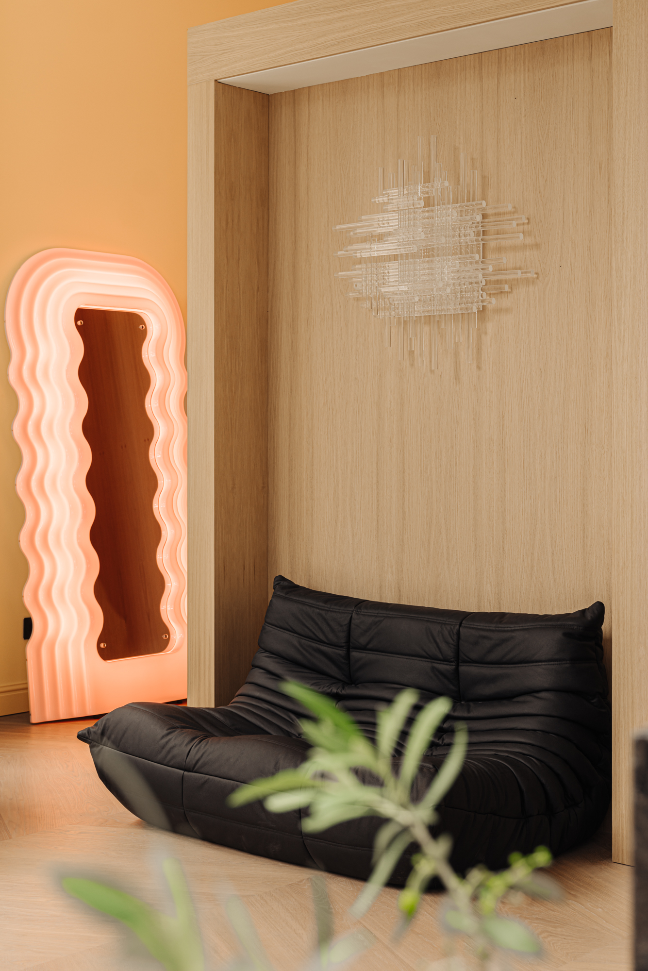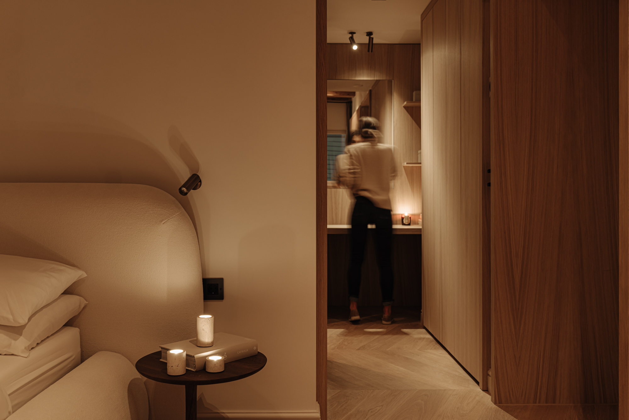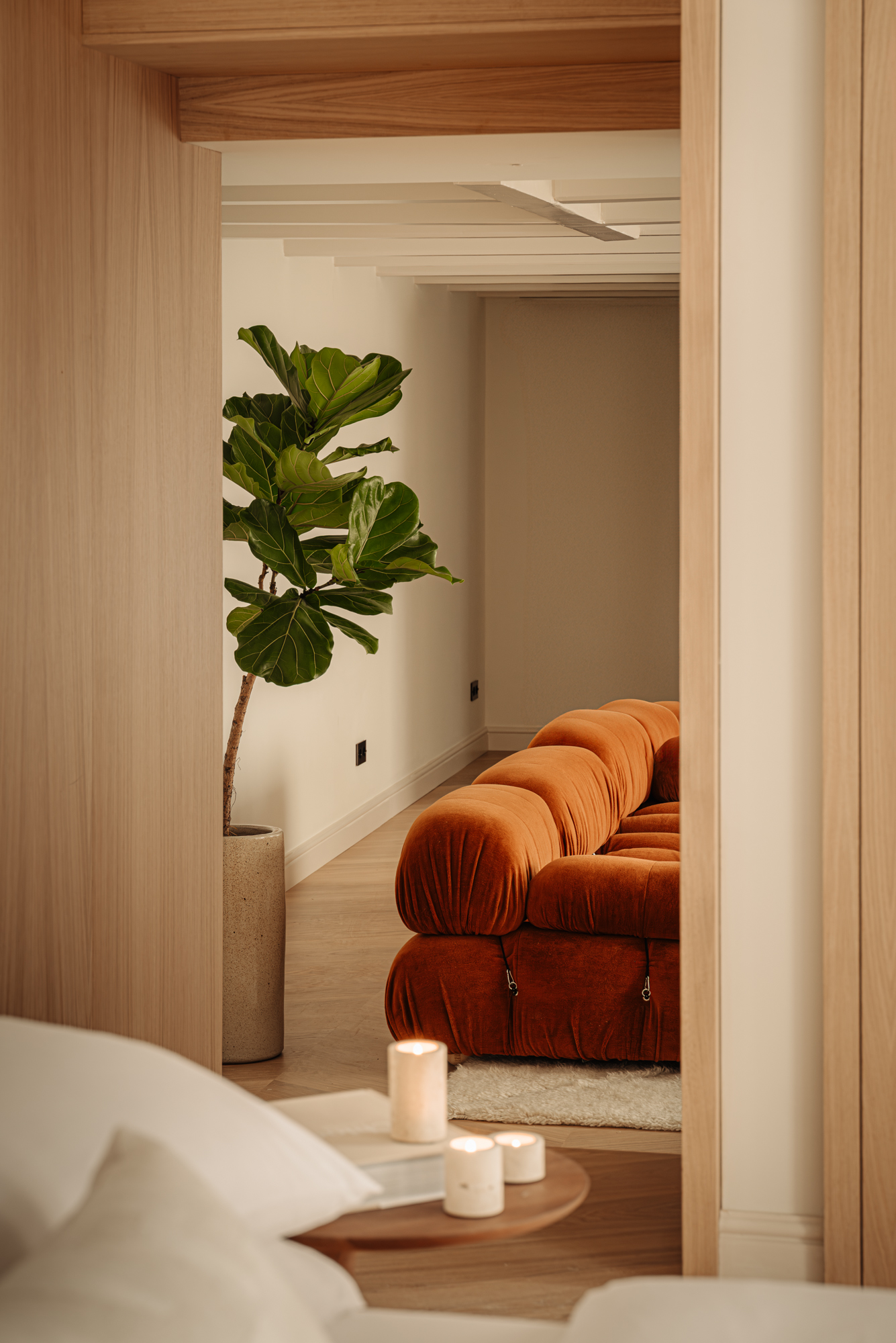 The wide chevron floor enhances the sense of space and elegance. Among the architectural highlights is the sculptural winding staircase – a striking centerpiece that connects the home’s two levels and captures the spirit of contemporary canal-side living.