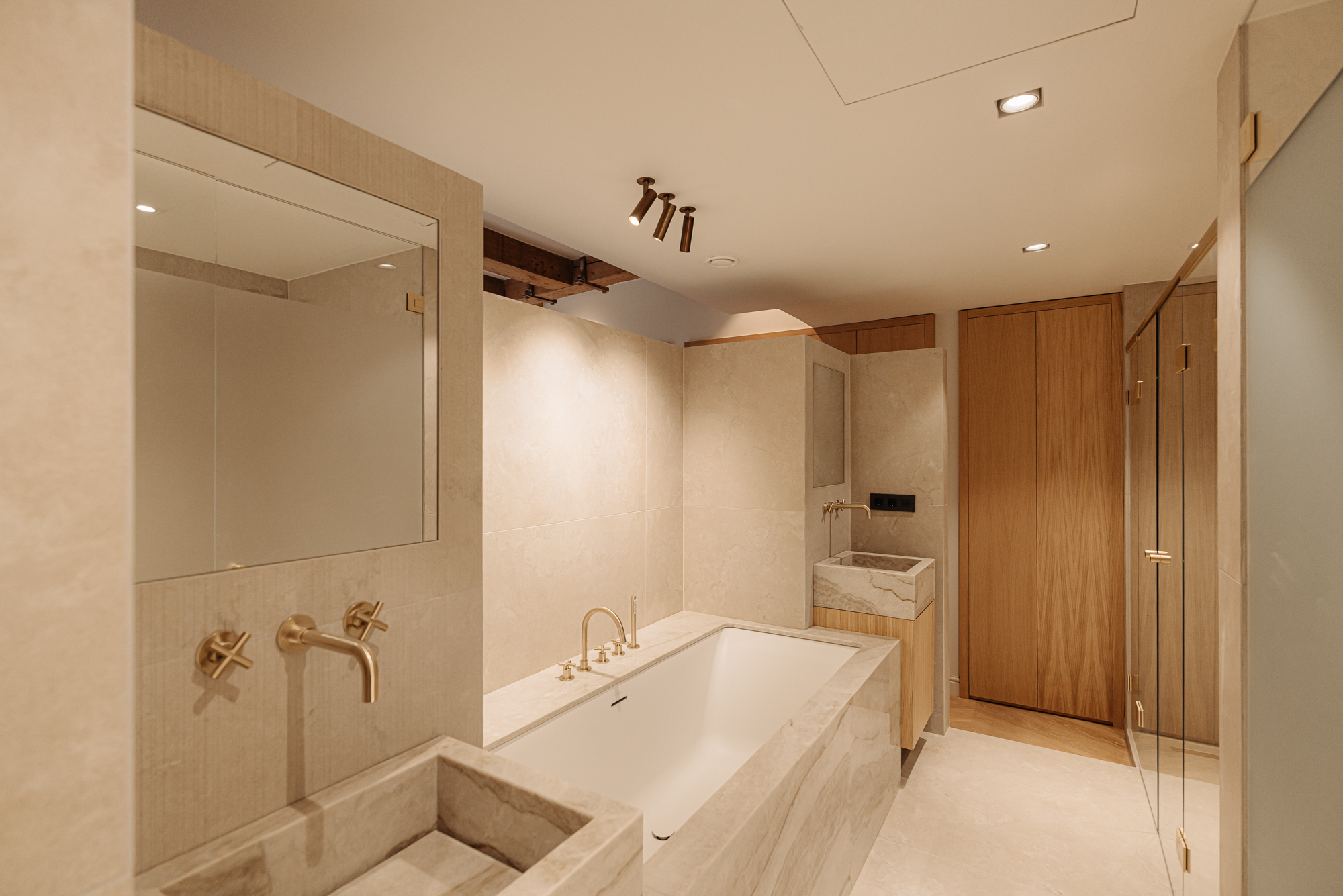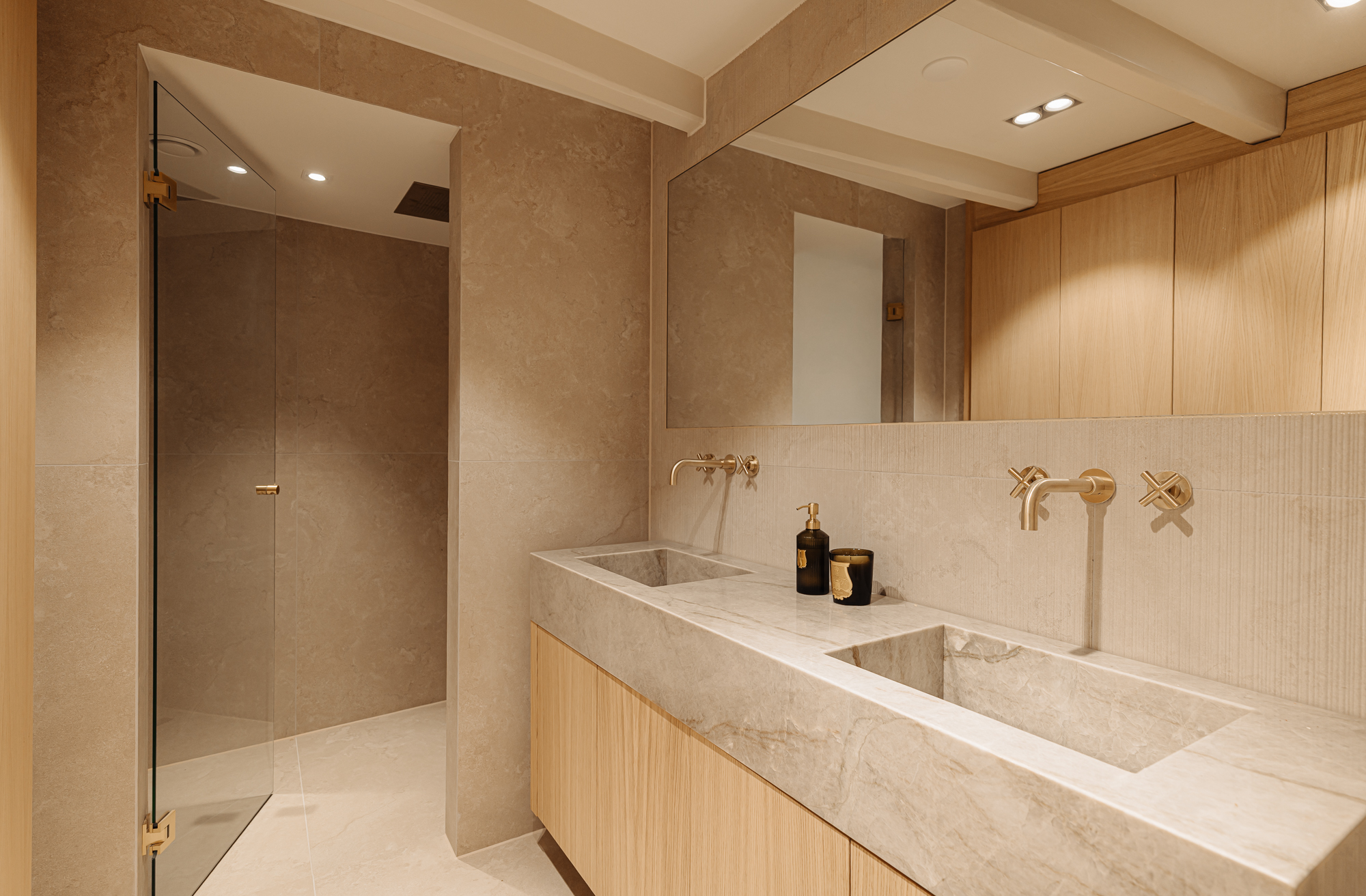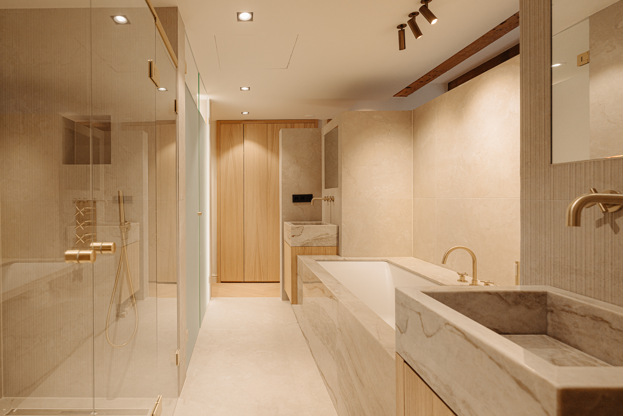 At the rear lies the exceptionally luxurious and serene primary suite, fitted with built-in wardrobes on both sides and a stylish dressing table. From two entrances there is access to the spacious bathroom, finished with natural stone and equipped with a double sink, twin rain shower and a bathtub.